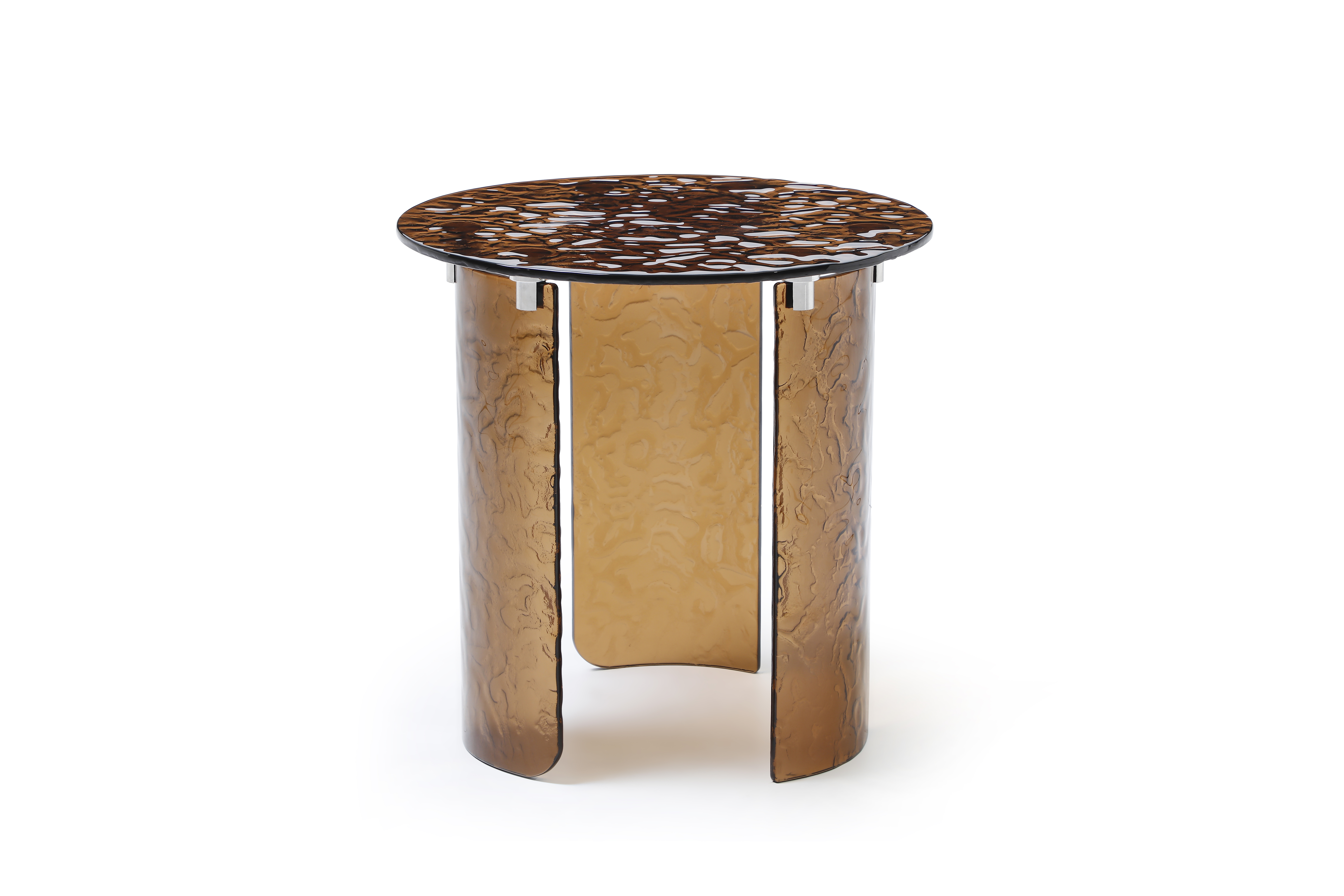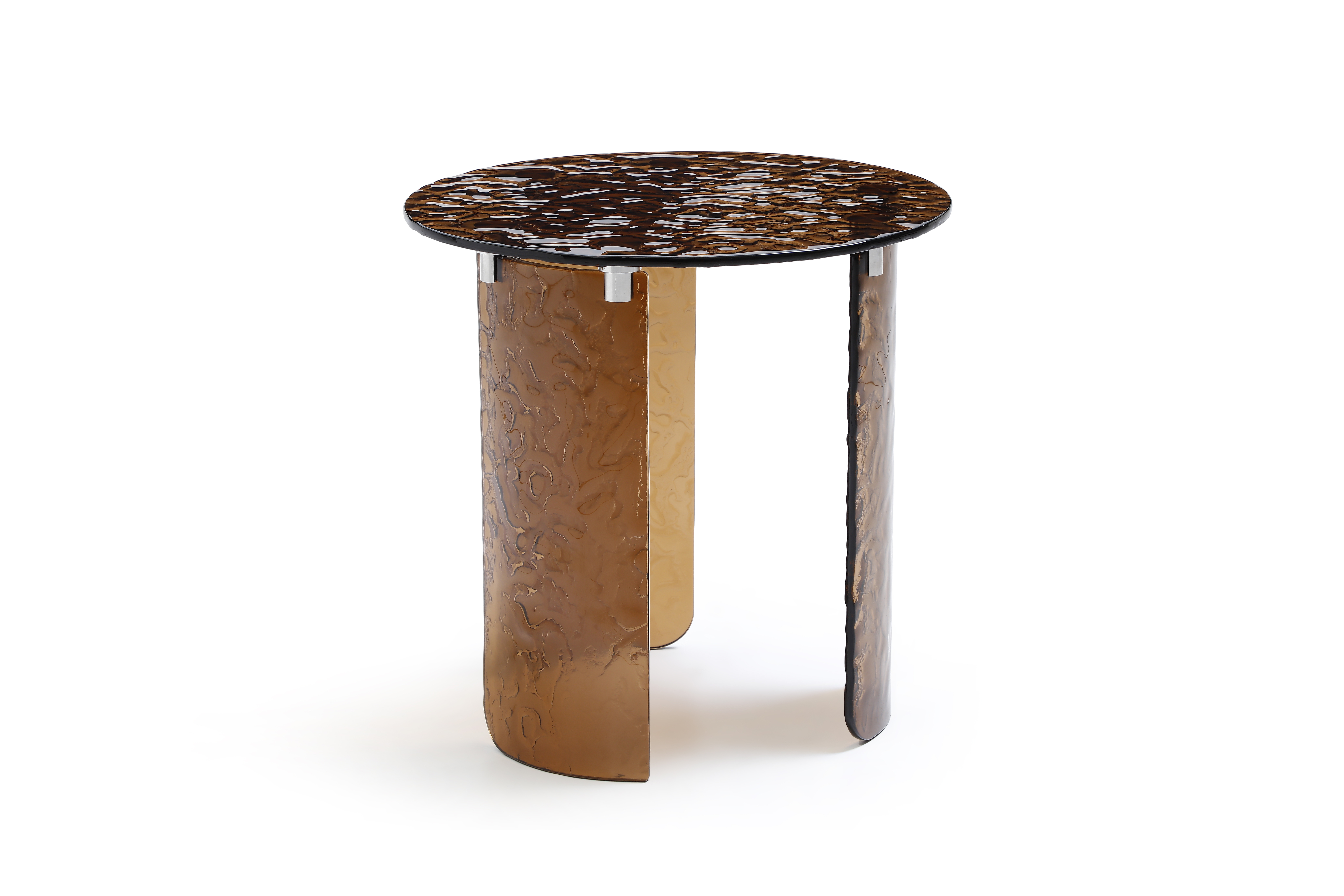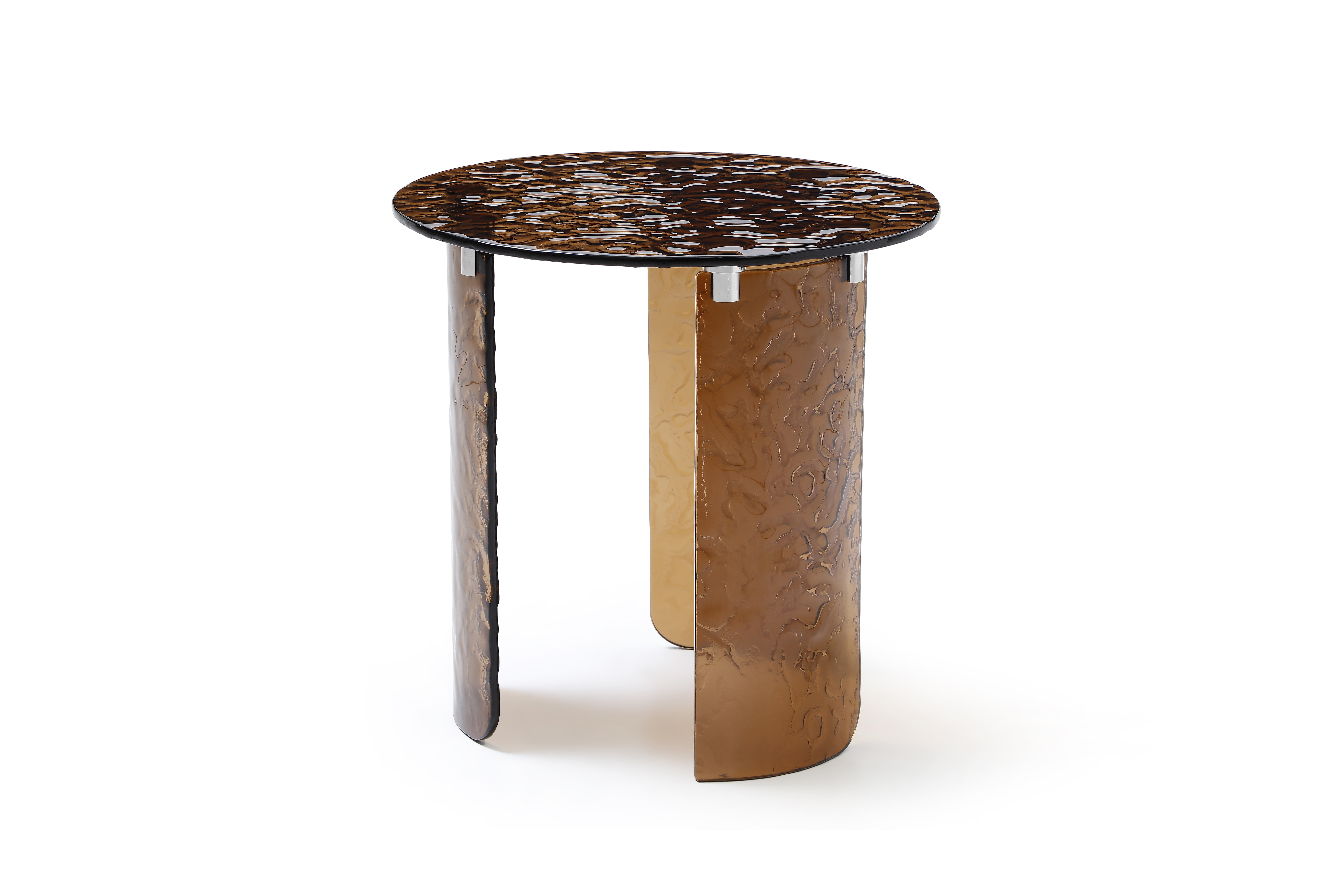 Distinctive in style the 20-inch bronze glass round end table radiates a versatile charm. A solid bronze glass frame is finished off with a matching bronze tempered glass seat, giving this table a chic monotone look. A great accent on either side of the sofa or bed, this adorable end or side table is just what you need. This versatile table is a great accent for most any room. 20.00-inch h x 20.00-inch w x 20.00-inch d.
