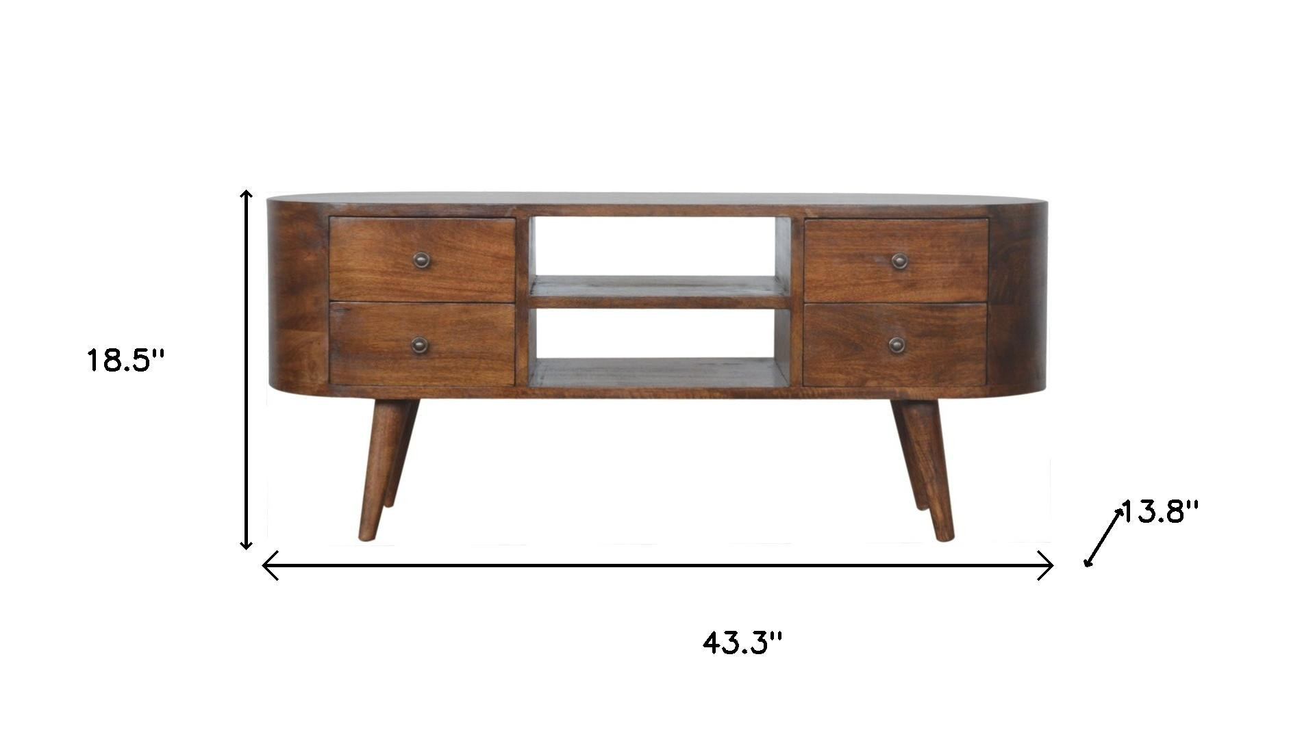 Ready to be enjoyed in your living room, family room, or recreation room, this 43-inch brown solid wood enclosed storage entertainment center is a practical and good looking piece of furniture that will help to anchor your room. Designed to be sturdy and long lasting, this versatile furniture piece is crafted from durable solid wood and features a mid-century design style. Ideal for tv placement and storage in your living room, bedroom or office. 18.50-inch h x 43.30-inch w x 13.80-inch d.