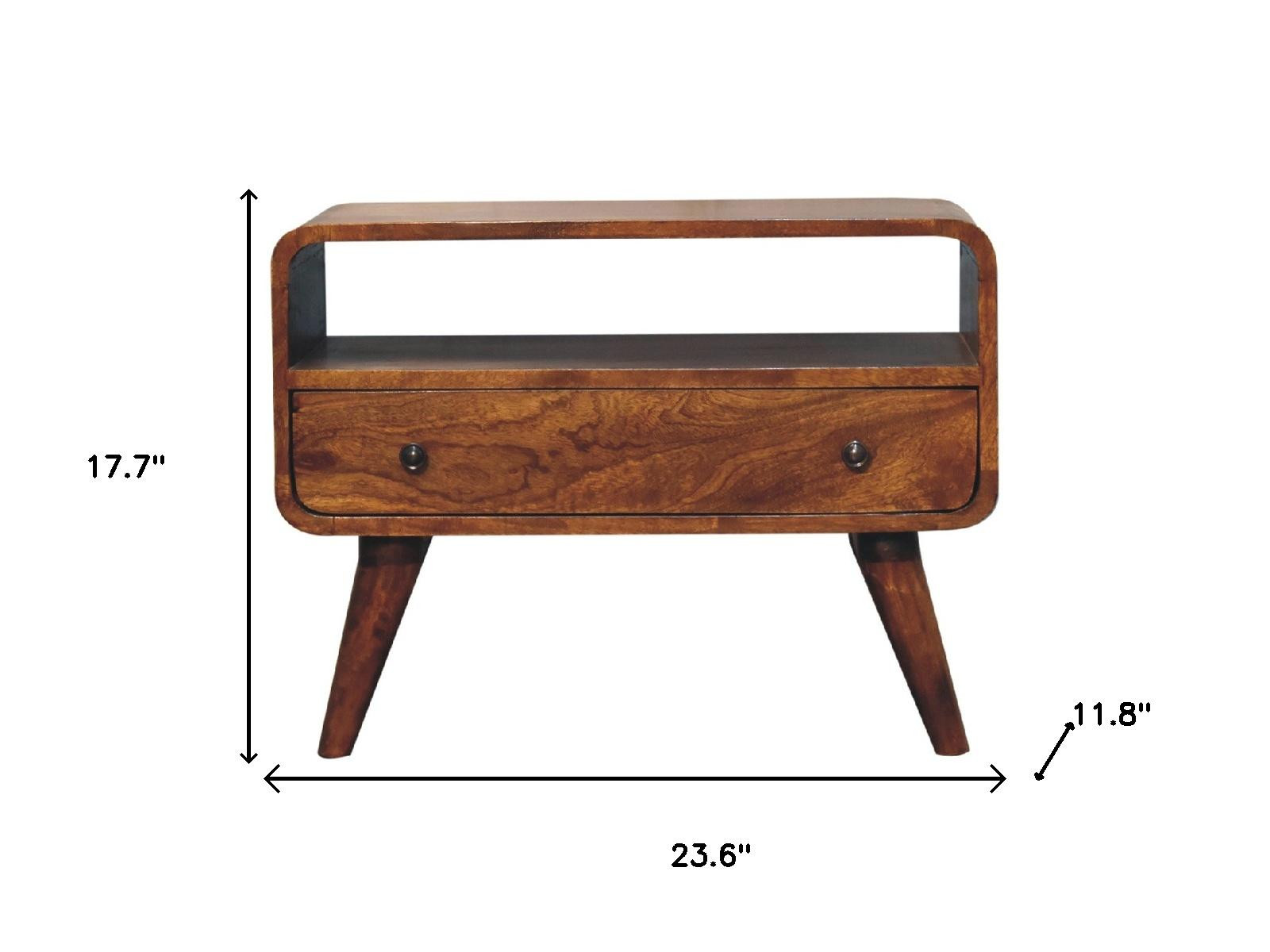 Create the ultimate blend of style, function, and design with this 24-inch brown solid wood fireplace tv stand. Designed to be sturdy and long lasting, this versatile furniture piece is crafted from durable solid wood and features a mid-century design style. Ideal for tv placement and storage in your living room, bedroom or office. 17.70-inch h x 23.60-inch w x 11.80-inch d.