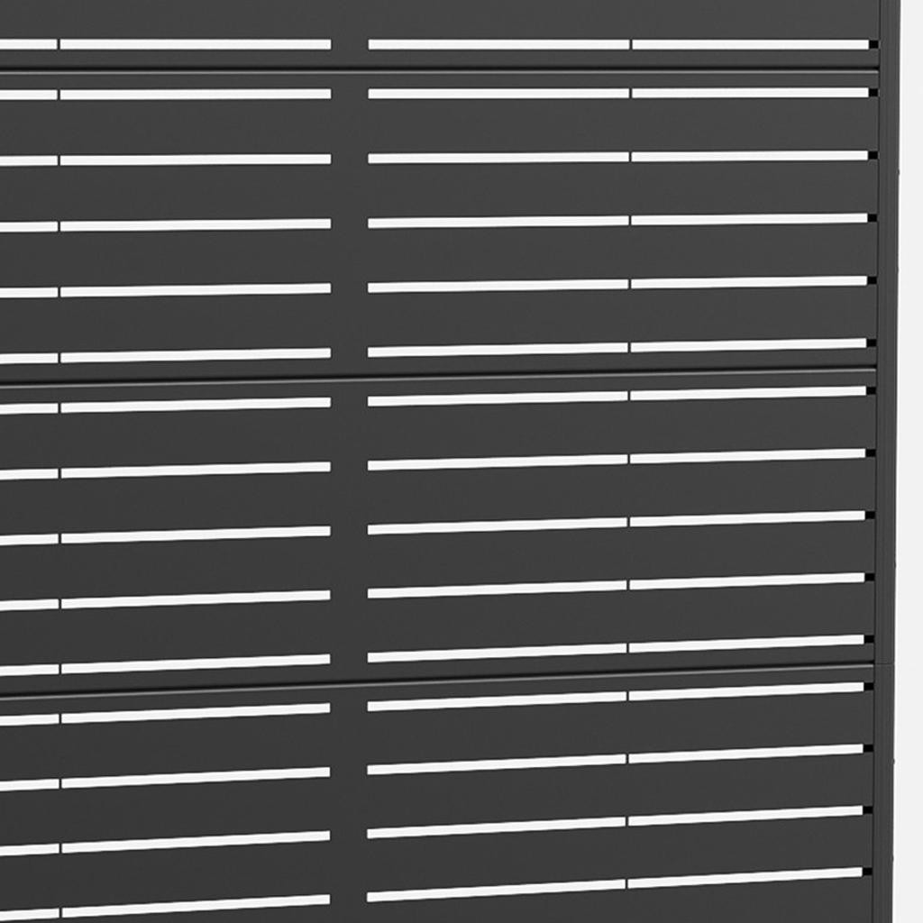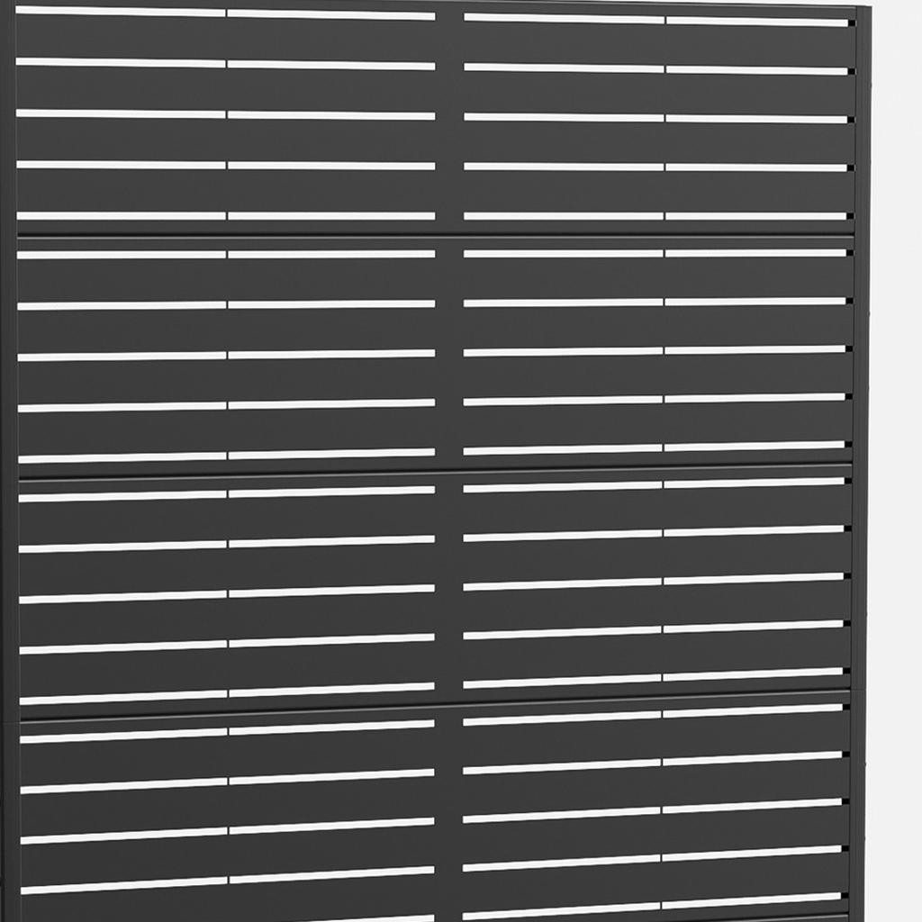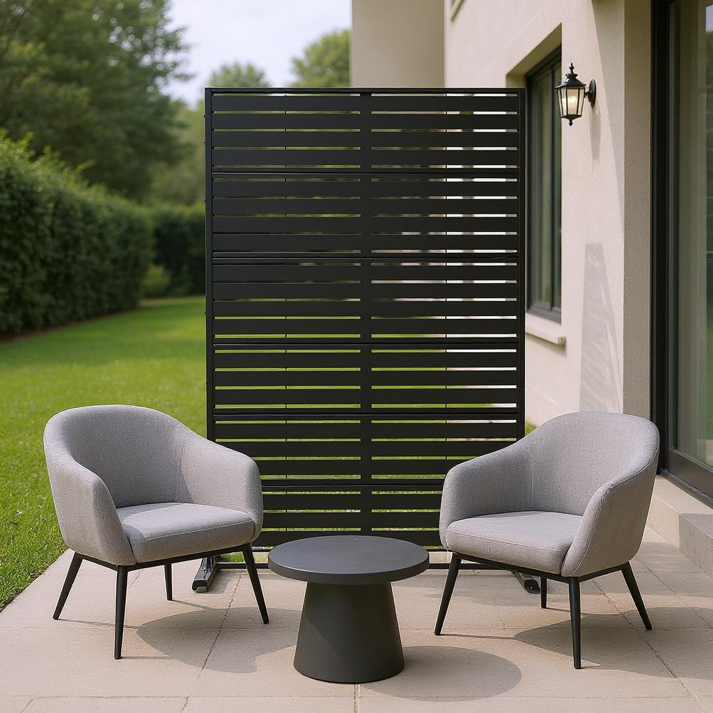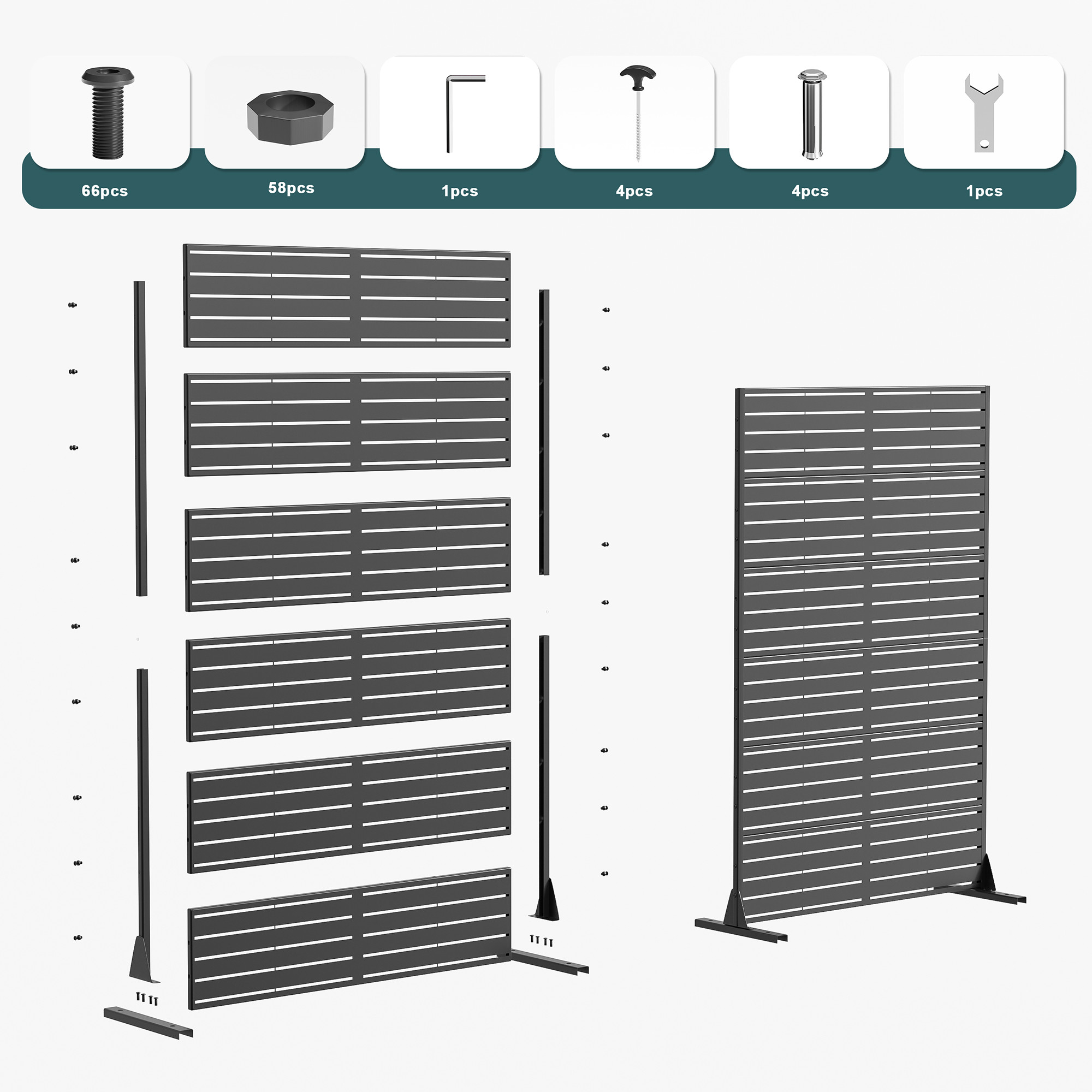 The 72-inch black steel six panel screen room divider offers a stylish solution for creating private spaces in any environment. Crafted from durable steel, this divider boasts an opaque screen material that ensures privacy while enhancing your decor. It features a uniform design, as the reverse side matches the front in both material and finish. With six panels, it provides flexible options for subdividing larger areas or defining cozy corners. This versatile room divider is suitable for outdoor use, making it a functional addition to patios or gardens. Whether for home or event setups, this striking piece combines practicality with a contemporary aesthetic. Elevate your space with this modern and robust room divider. 72.00-inch h x 47.00-inch w x 16.00-inch d.