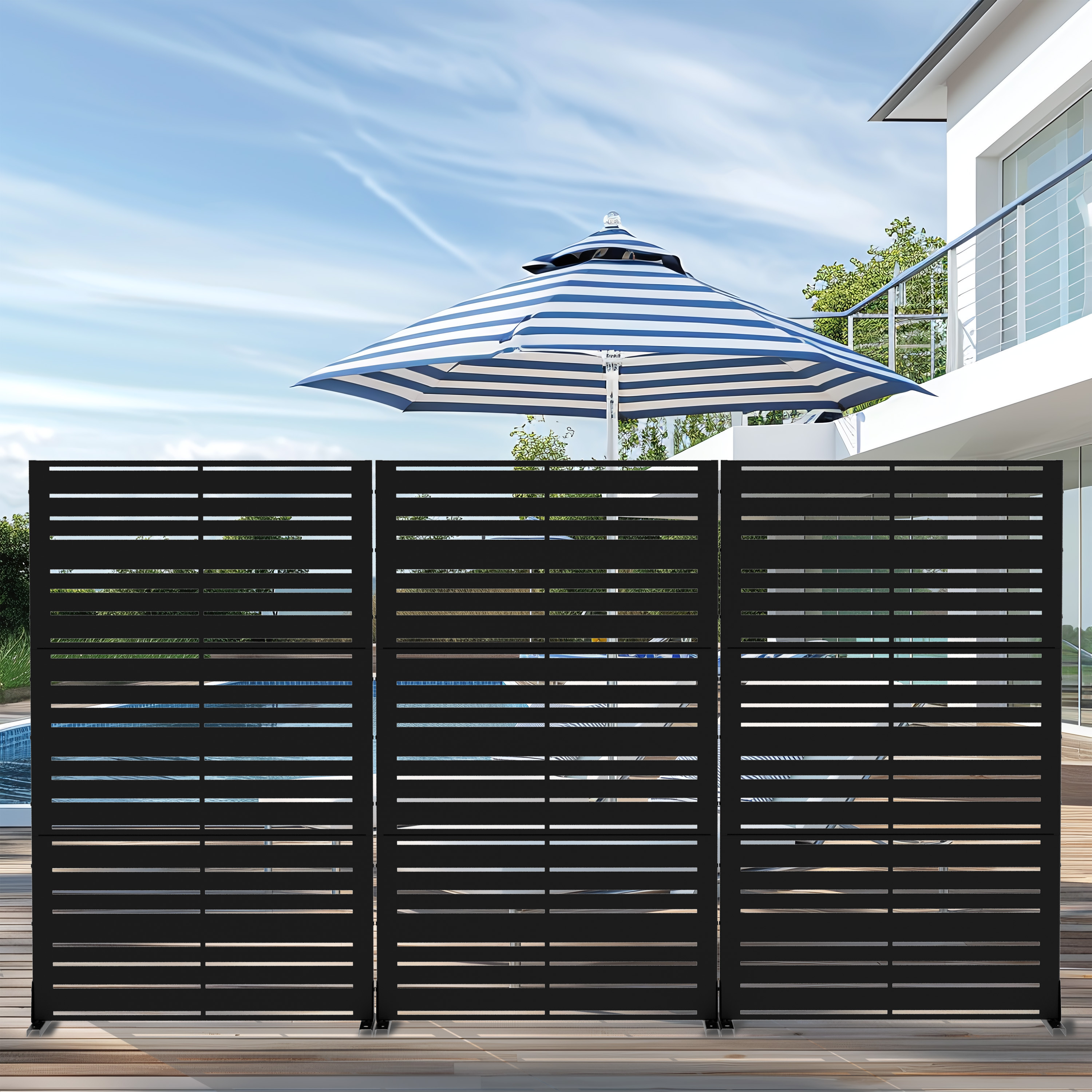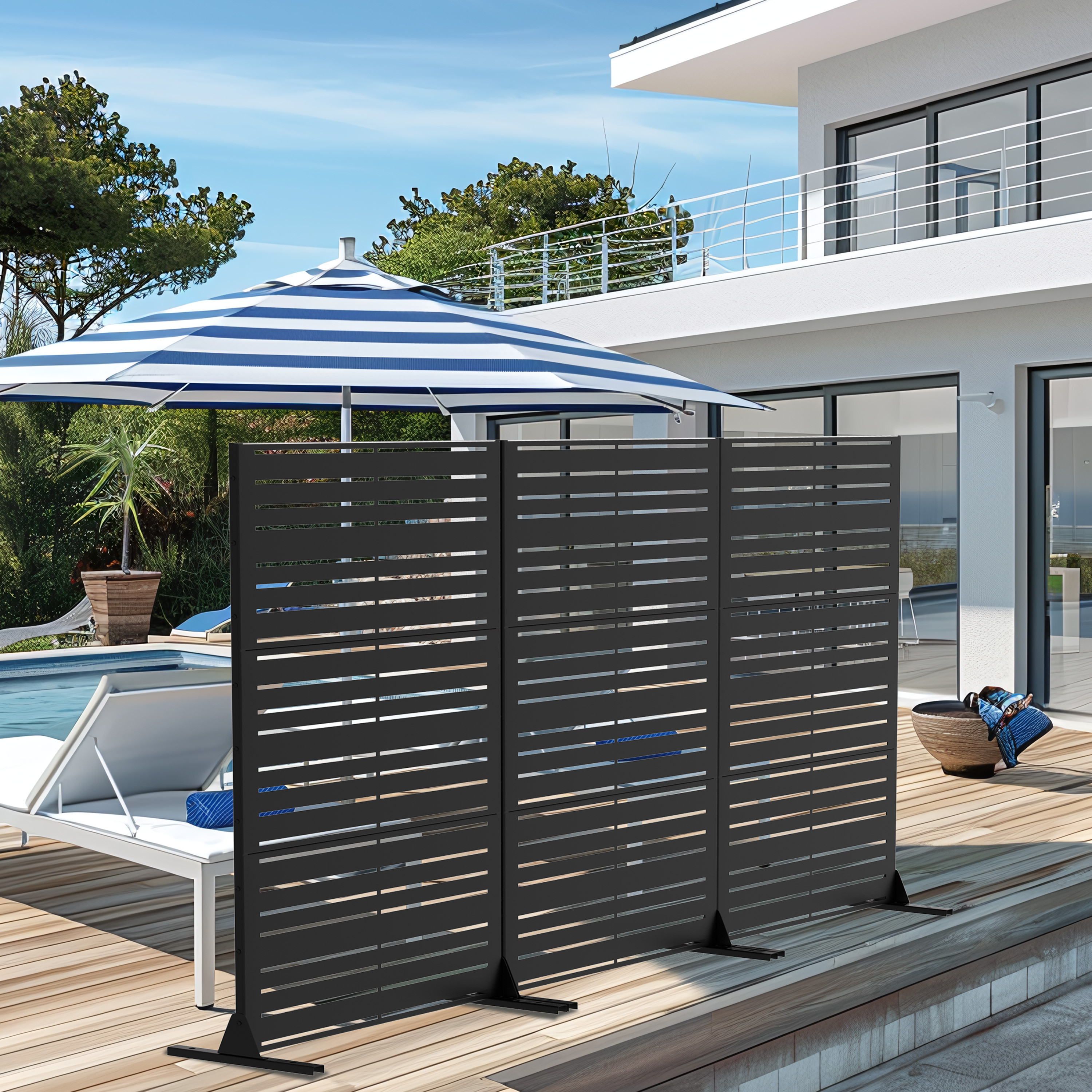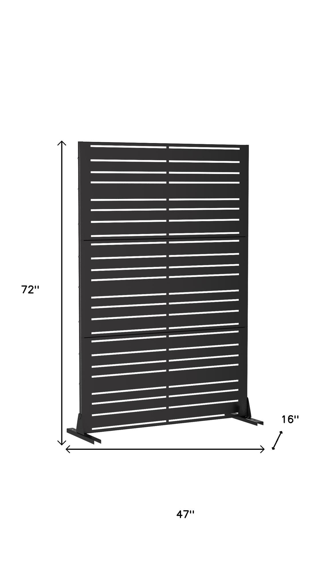 The 72-inch black steel three panel screen room divider is a stylish solution for creating privacy in any space. Constructed with a durable steel frame, this room divider exudes a modern aesthetic that seamlessly complements various decor styles. Its opaque screen material ensures enhanced privacy, while the reverse side features a matching print and finish for a cohesive look. Designed for both indoor and outdoor use, this versatile piece allows you to redefine your space effortlessly. With three panels, it provides flexible options for partitioning areas or adding a decorative element to your surroundings. Elevate your home with this functional and chic room divider that balances practicality and elegance. 72.00-inch h x 47.00-inch w x 16.00-inch d.