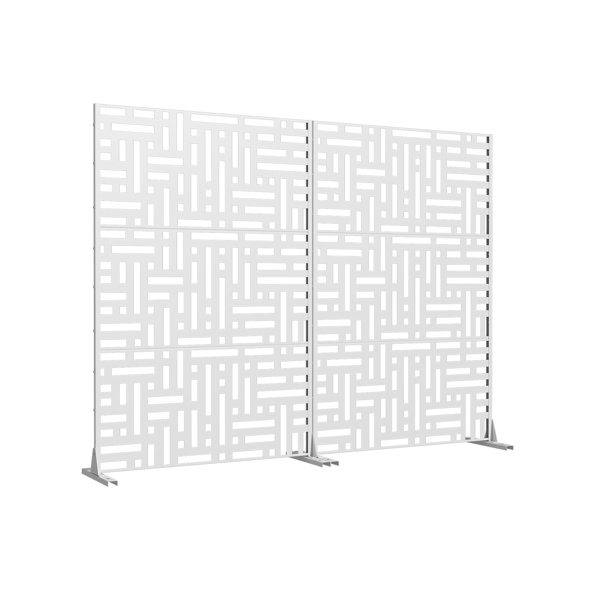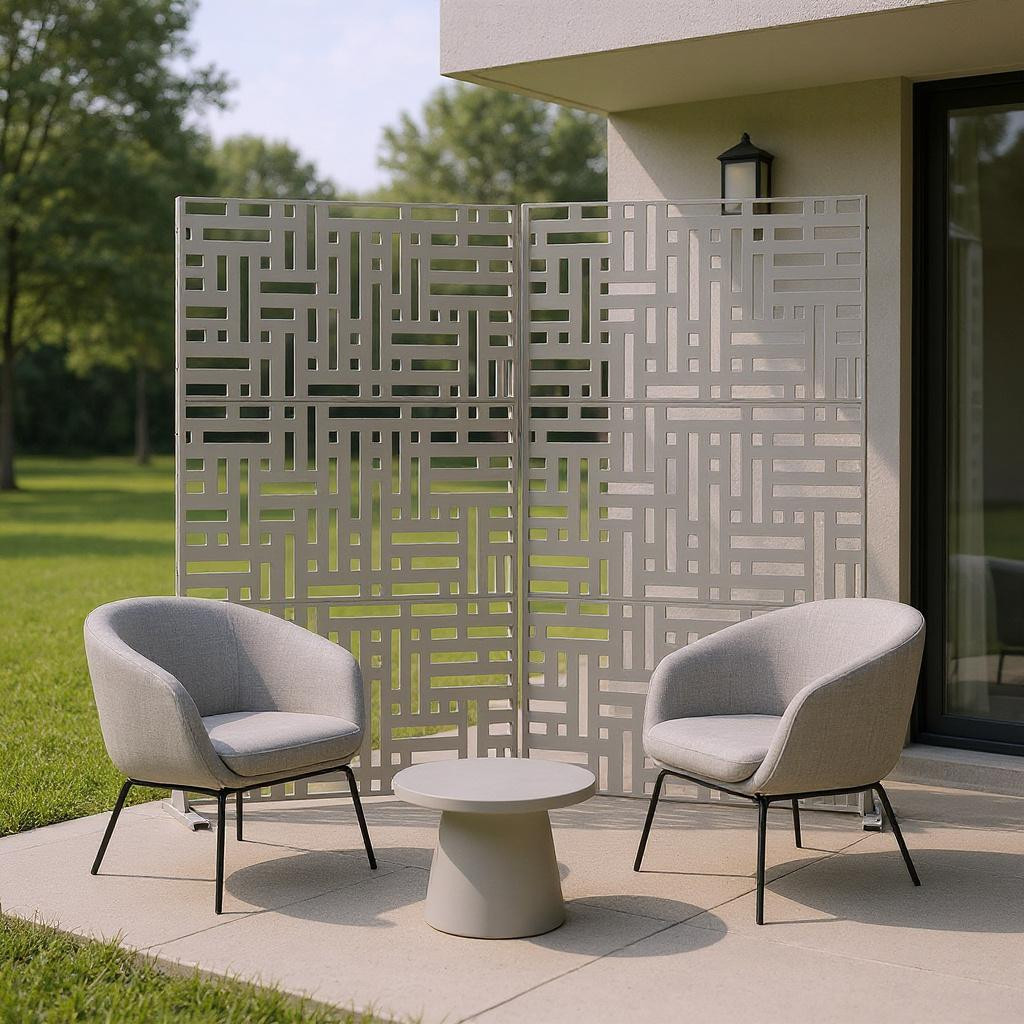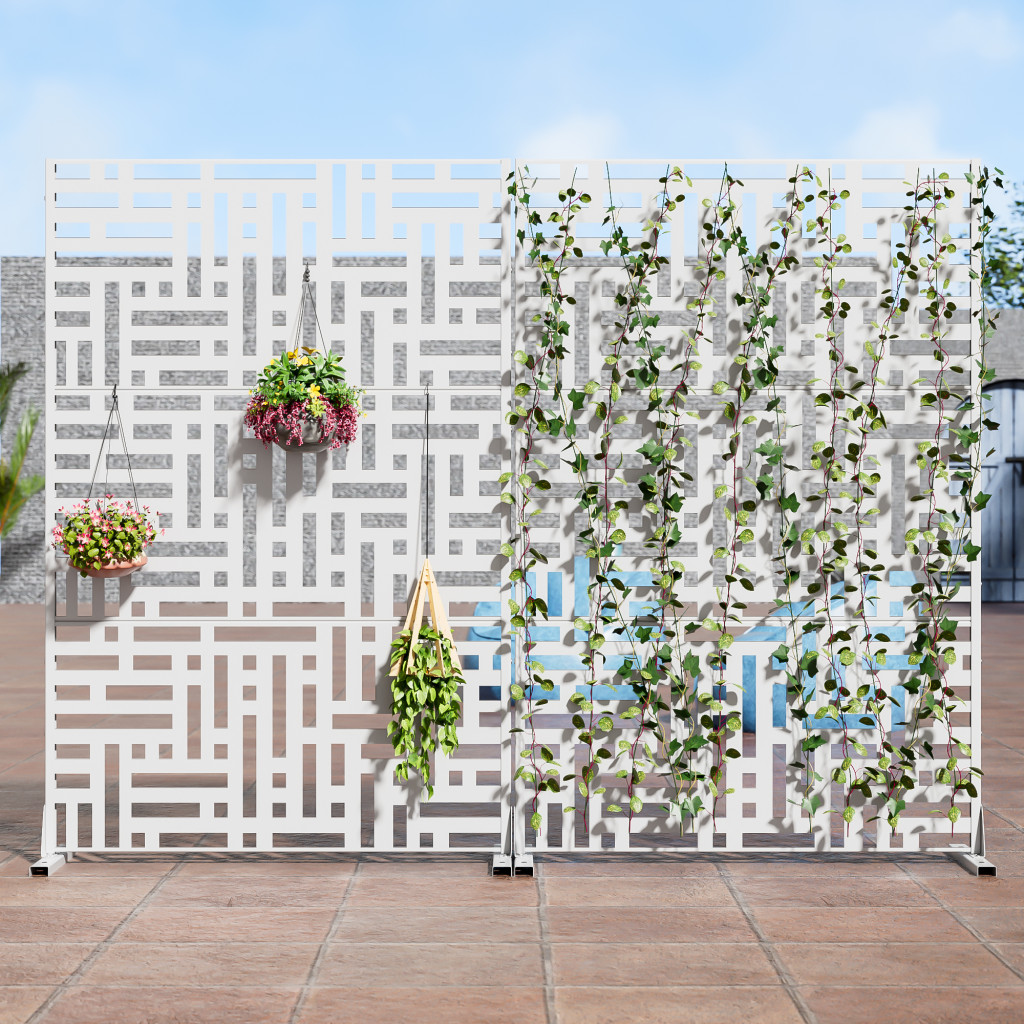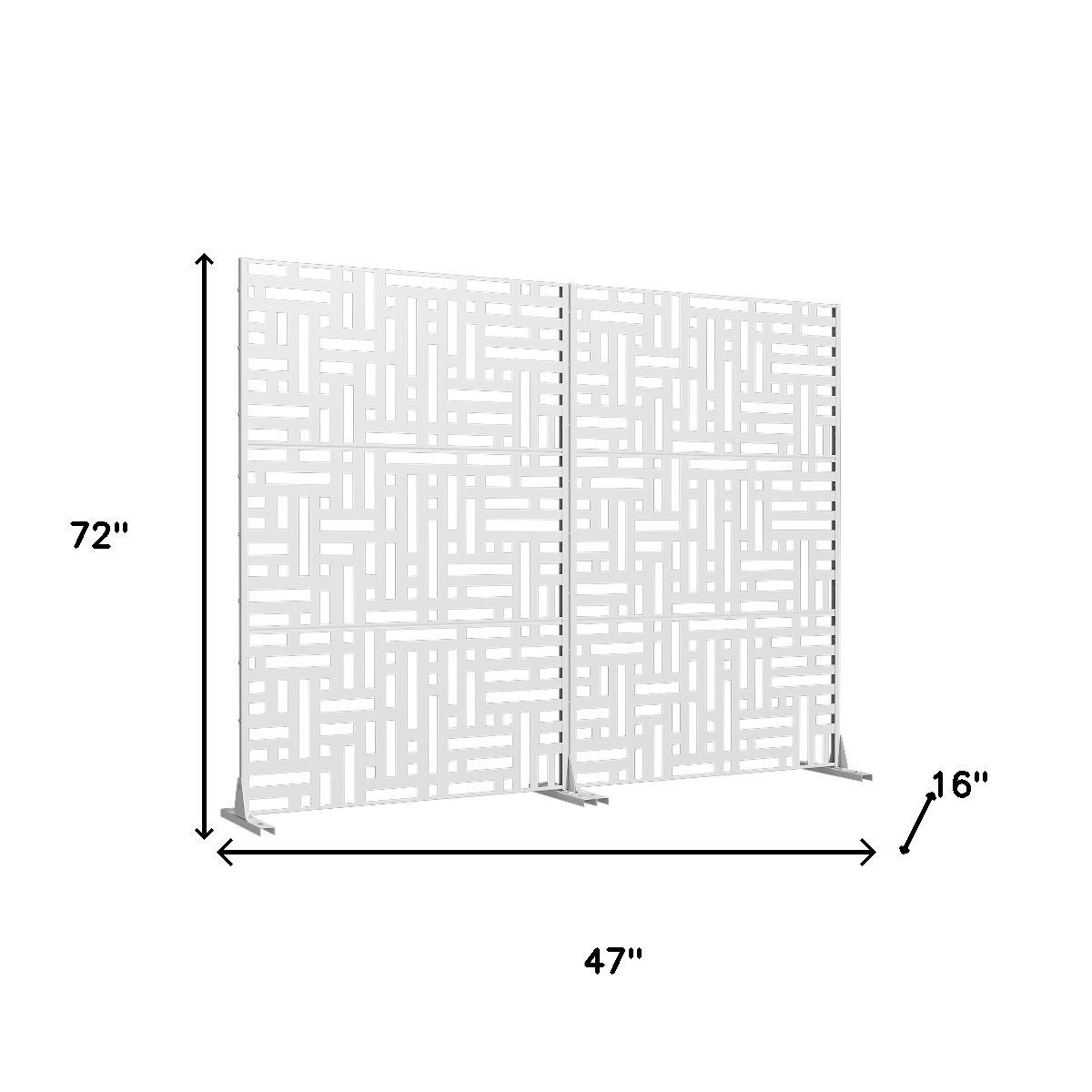 The 72-inch white steel three panel screen room divider is a stylish and functional addition to any space. Crafted from durable steel, this room divider offers both strength and stability. Its opaque design ensures privacy while maintaining a modern aesthetic. Each panel features a seamless finish that matches on both sides, enhancing its visual appeal from any angle. Ideal for outdoor use, this versatile piece can easily separate areas in patios or gardens, providing a chic solution for creating distinct zones. With three panels, it delivers flexibility in arrangement, making it perfect for various layouts. This room divider will elevate your decor while serving practical purposes in your home or outdoor setting. 72.00-inch h x 47.00-inch w x 16.00-inch d.