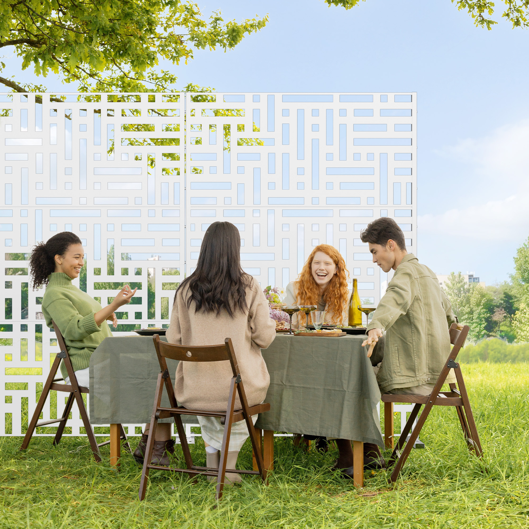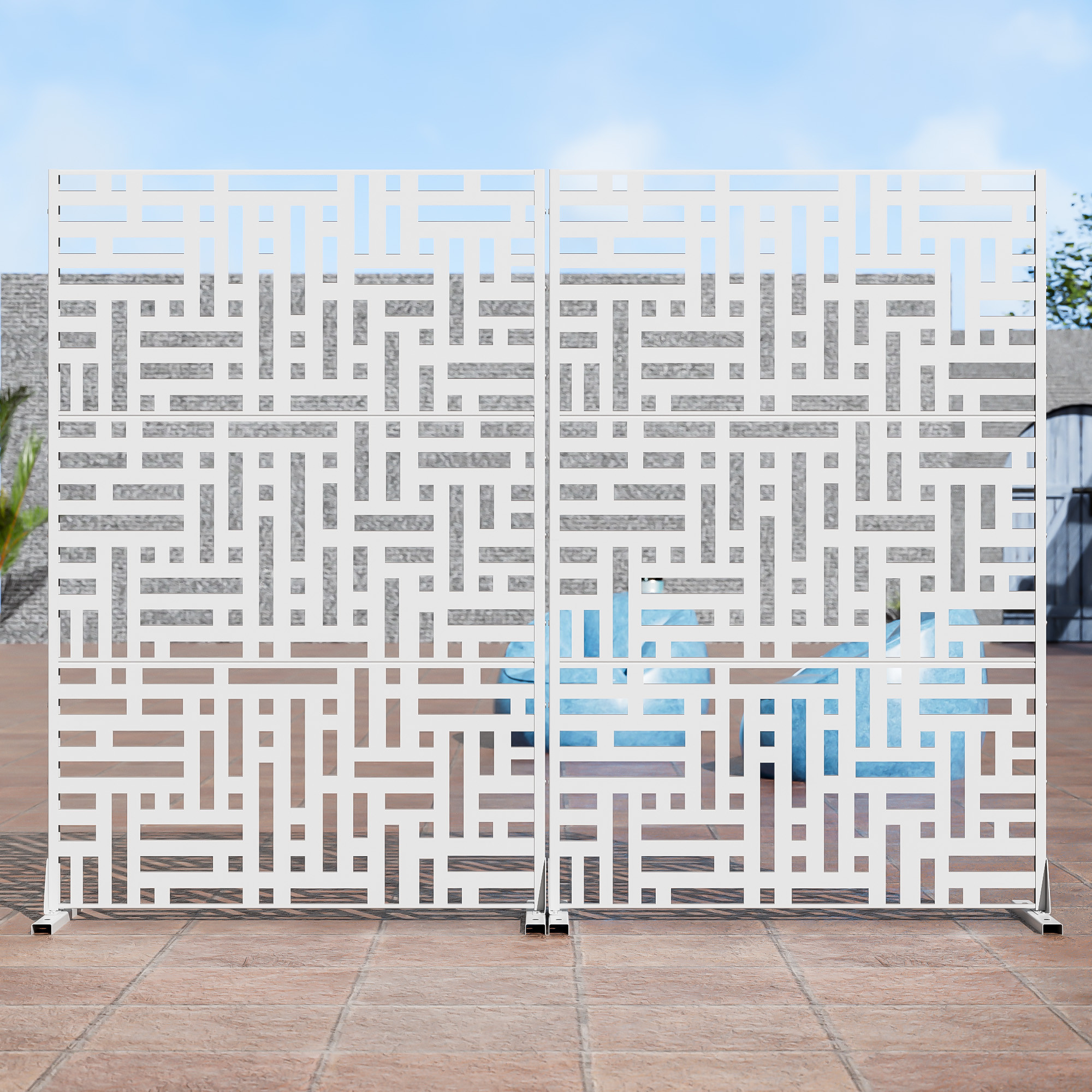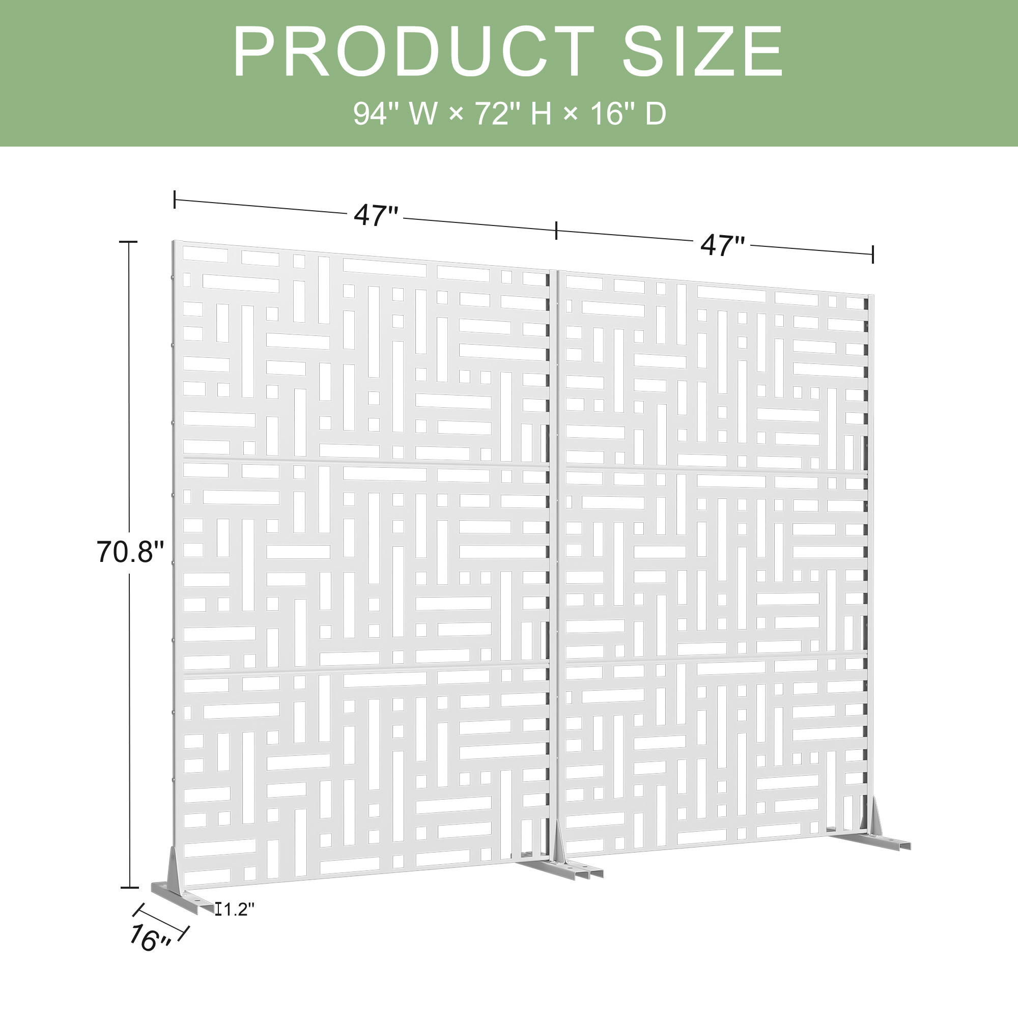The 72-inch white steel three panel screen room divider is a stylish and functional addition to any space. Crafted from durable steel, this room divider offers both strength and stability. Its opaque design ensures privacy while maintaining a modern aesthetic. Each panel features a seamless finish that matches on both sides, enhancing its visual appeal from any angle. Ideal for outdoor use, this versatile piece can easily separate areas in patios or gardens, providing a chic solution for creating distinct zones. With three panels, it delivers flexibility in arrangement, making it perfect for various layouts. This room divider will elevate your decor while serving practical purposes in your home or outdoor setting. 72.00-inch h x 47.00-inch w x 16.00-inch d.