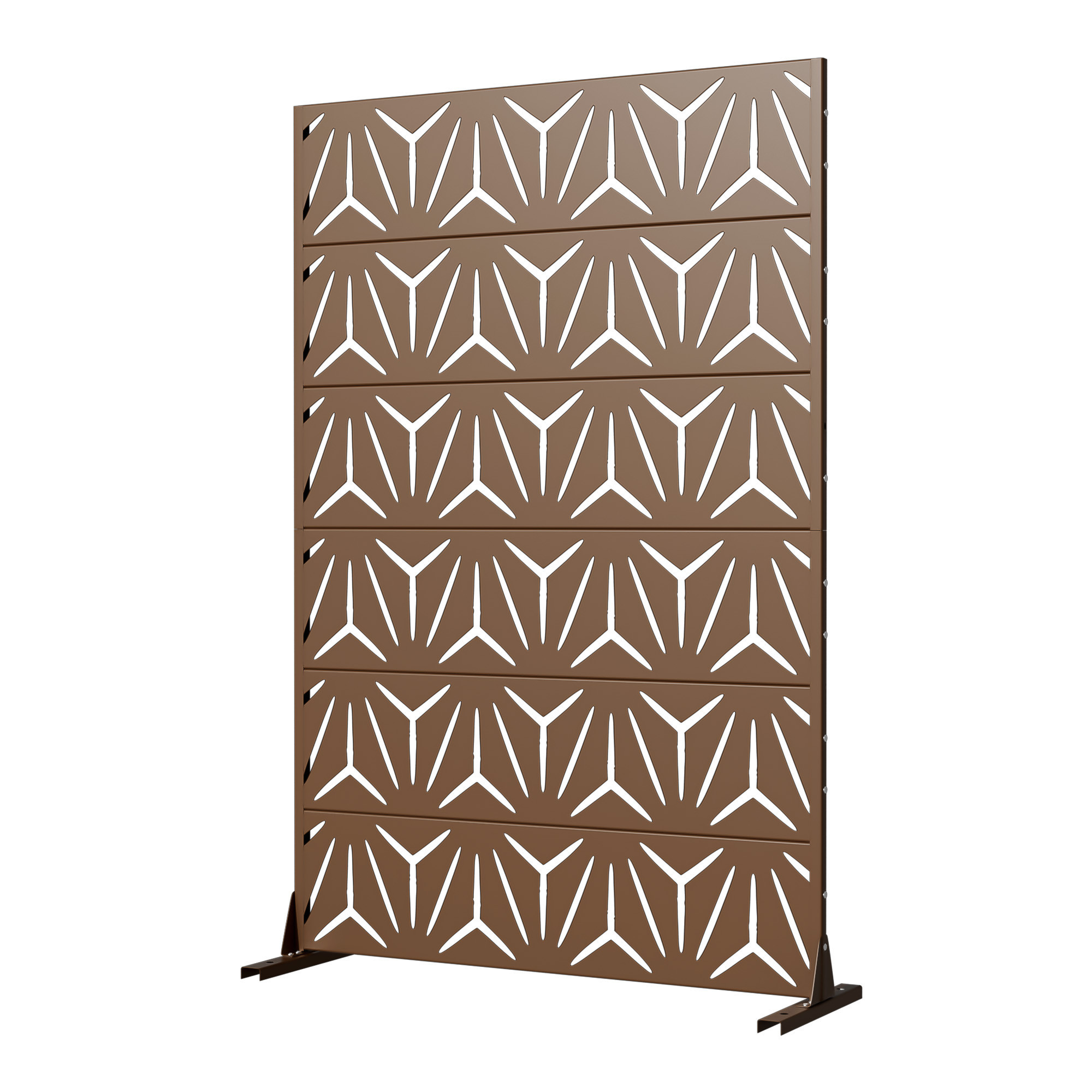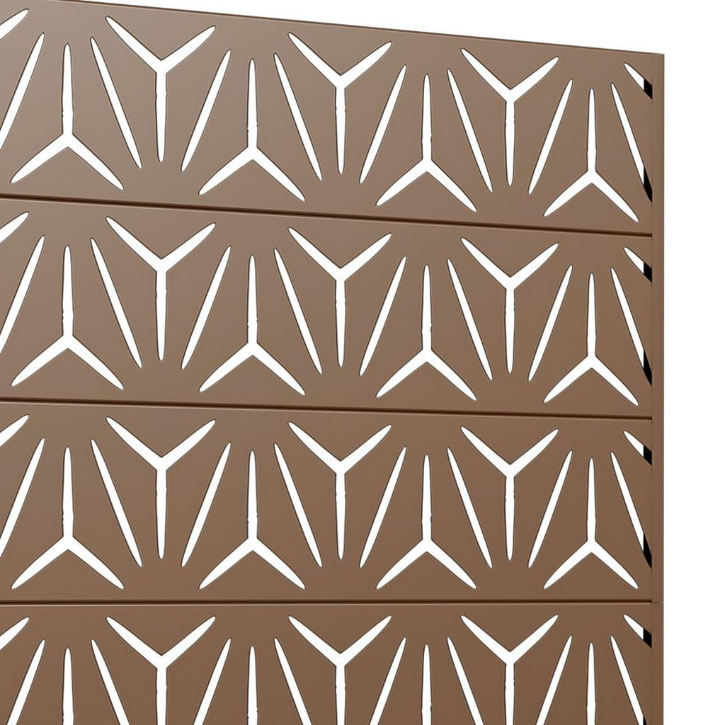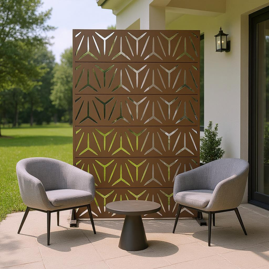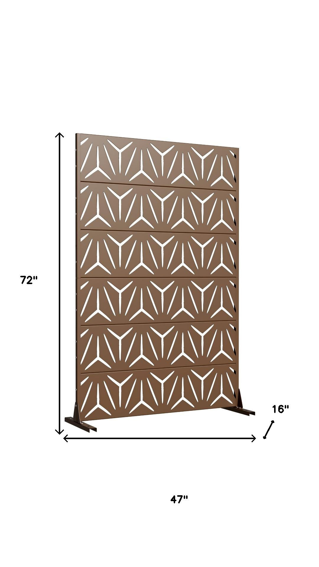 The 72-inch brown steel six panel screen room divider adds a stylish touch to any space. Crafted from durable steel, this room divider ensures stability and longevity while providing a sleek design. Its opaque screen material effectively creates privacy, making it ideal for both indoor and outdoor use. The reverse side showcases the same material, print, finish, and color as the front, ensuring a cohesive look from any angle. With six panels, it allows for versatile arrangements to fit various layouts and needs. This single panel design is perfect for defining spaces in an open concept home or adding a decorative element to your outdoor area. Transform your environment effortlessly with this functional and elegant solution. 72.00-inch h x 47.00-inch w x 16.00-inch d.