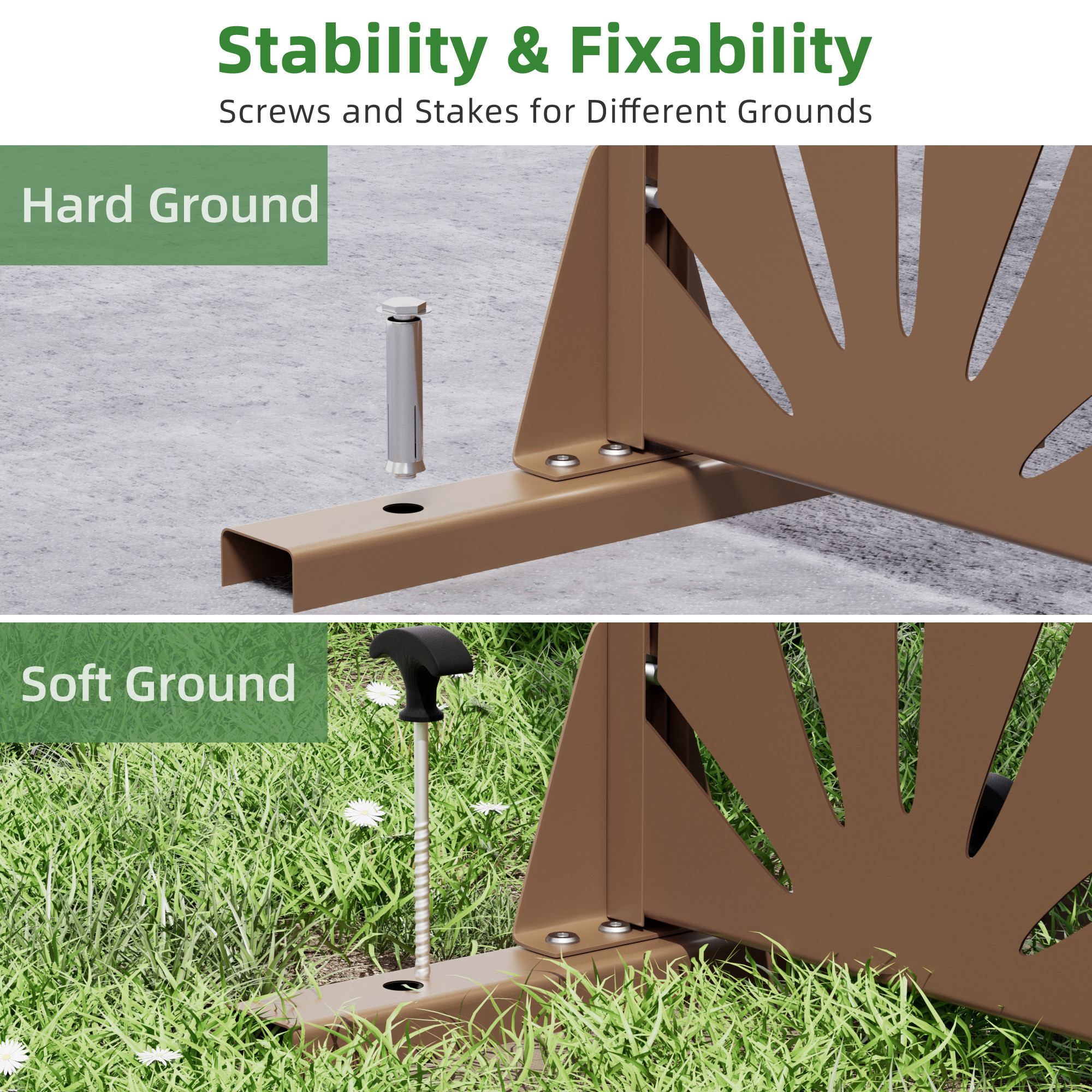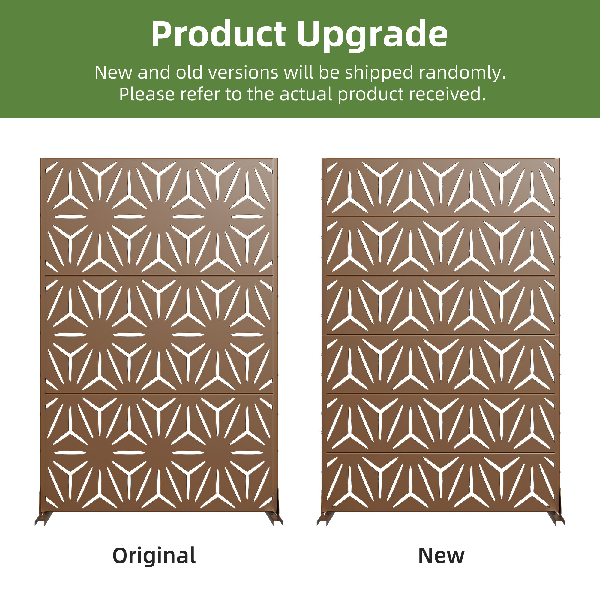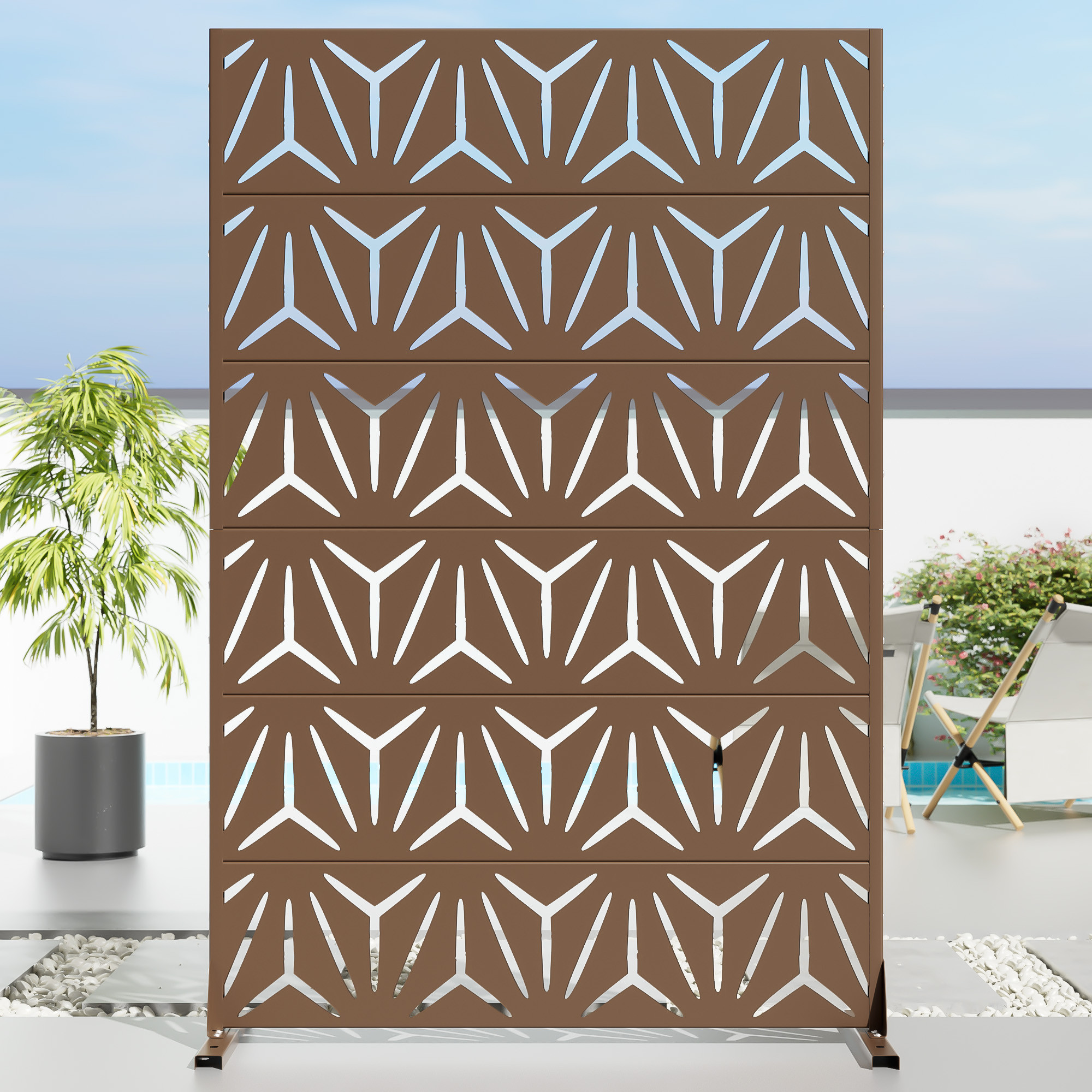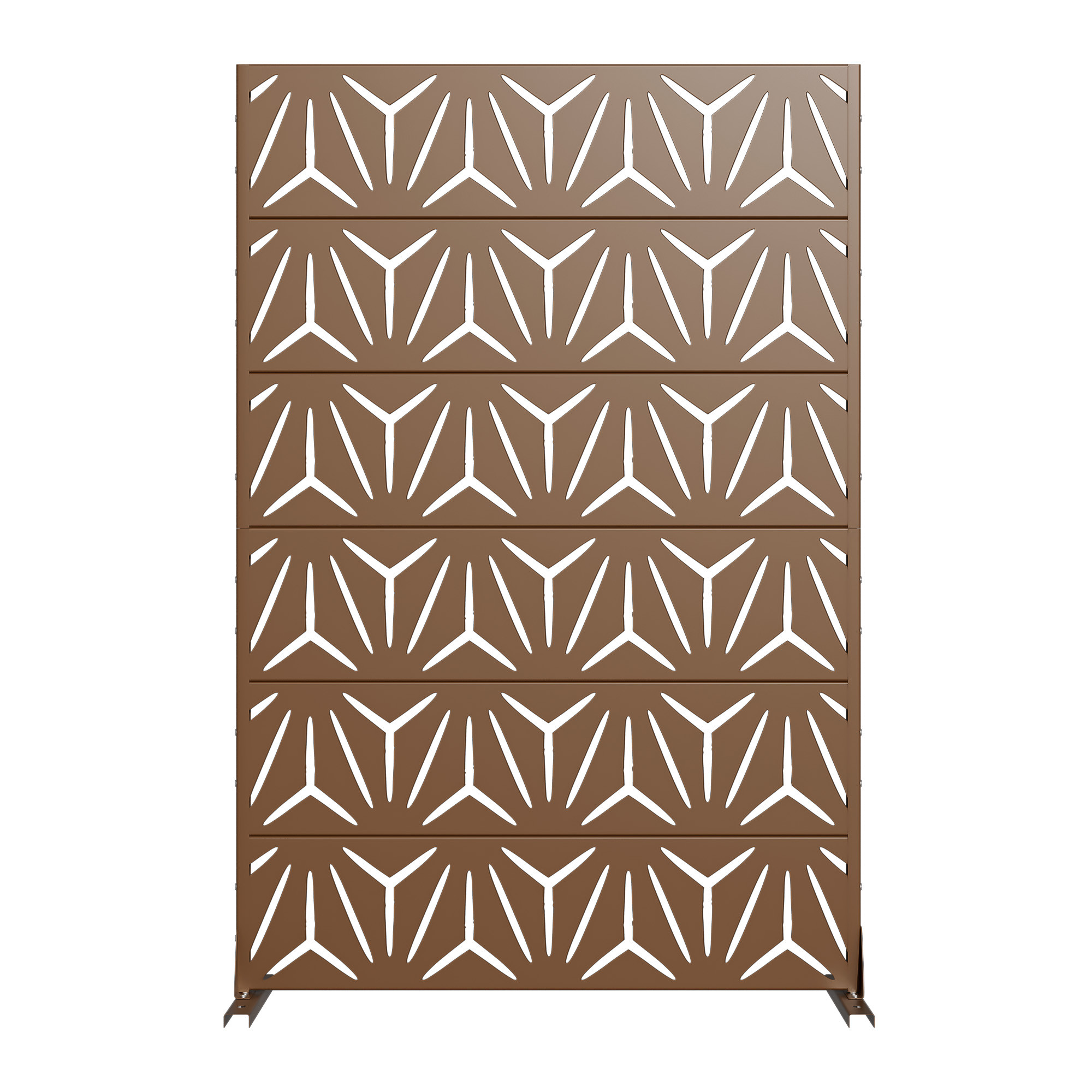 The 72-inch brown steel six panel screen room divider adds a stylish touch to any space. Crafted from durable steel, this room divider ensures stability and longevity while providing a sleek design. Its opaque screen material effectively creates privacy, making it ideal for both indoor and outdoor use. The reverse side showcases the same material, print, finish, and color as the front, ensuring a cohesive look from any angle. With six panels, it allows for versatile arrangements to fit various layouts and needs. This single panel design is perfect for defining spaces in an open concept home or adding a decorative element to your outdoor area. Transform your environment effortlessly with this functional and elegant solution. 72.00-inch h x 47.00-inch w x 16.00-inch d.