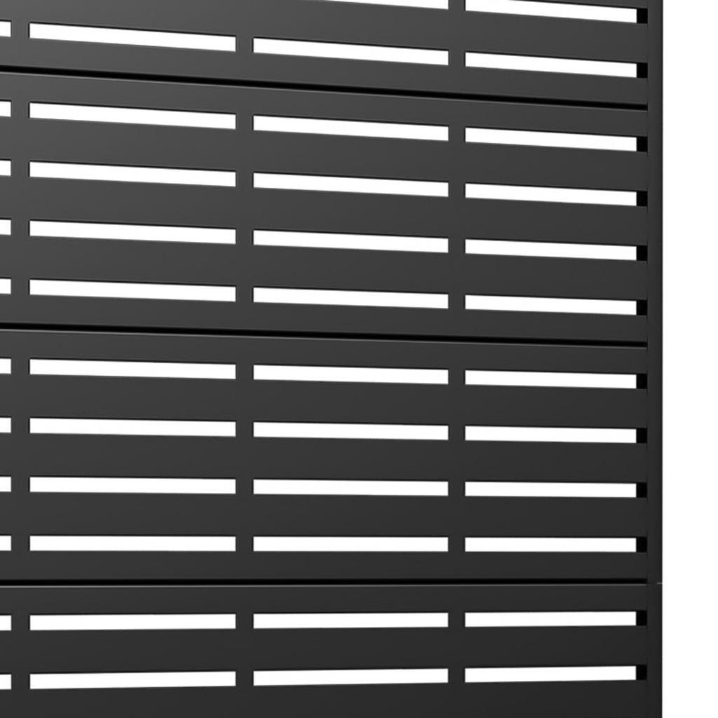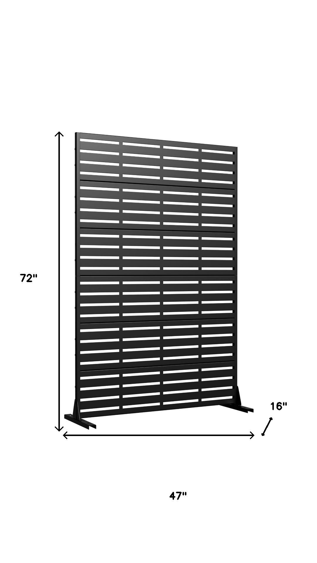 The 72-inch black steel six panel screen room divider is a stylish and functional addition to any space. Crafted from durable steel, this room divider features an opaque design for added privacy. Its six-panel configuration allows for versatile use, making it perfect for both indoor and outdoor settings. The reverse side of the divider boasts the same material and finish, ensuring a cohesive look from all angles. This single panel type can be easily moved and rearranged to suit your changing needs, enhancing your living area or workspace effortlessly. Use it to create separate zones or as an eye-catching decorative piece that complements your existing decor. 72.00-inch h x 47.00-inch w x 16.00-inch d.