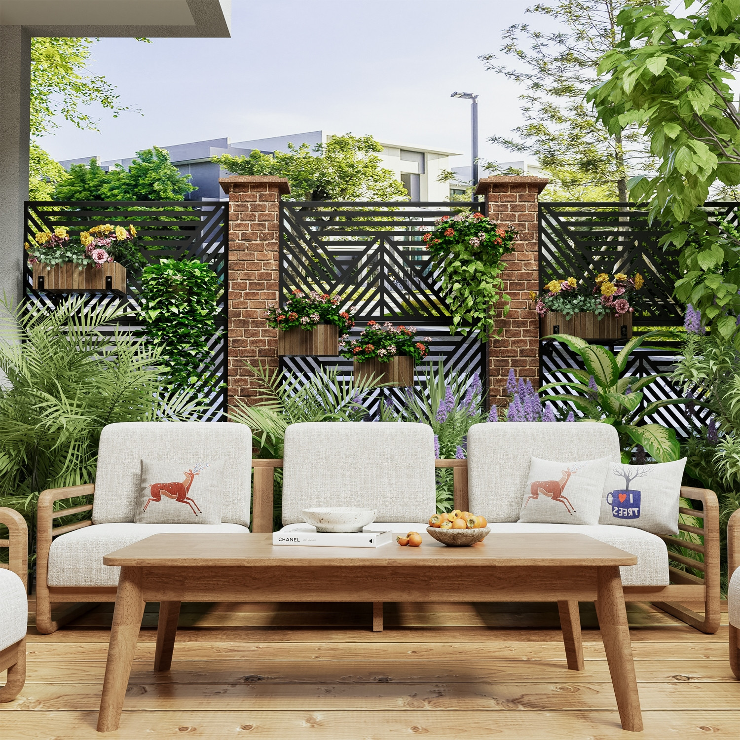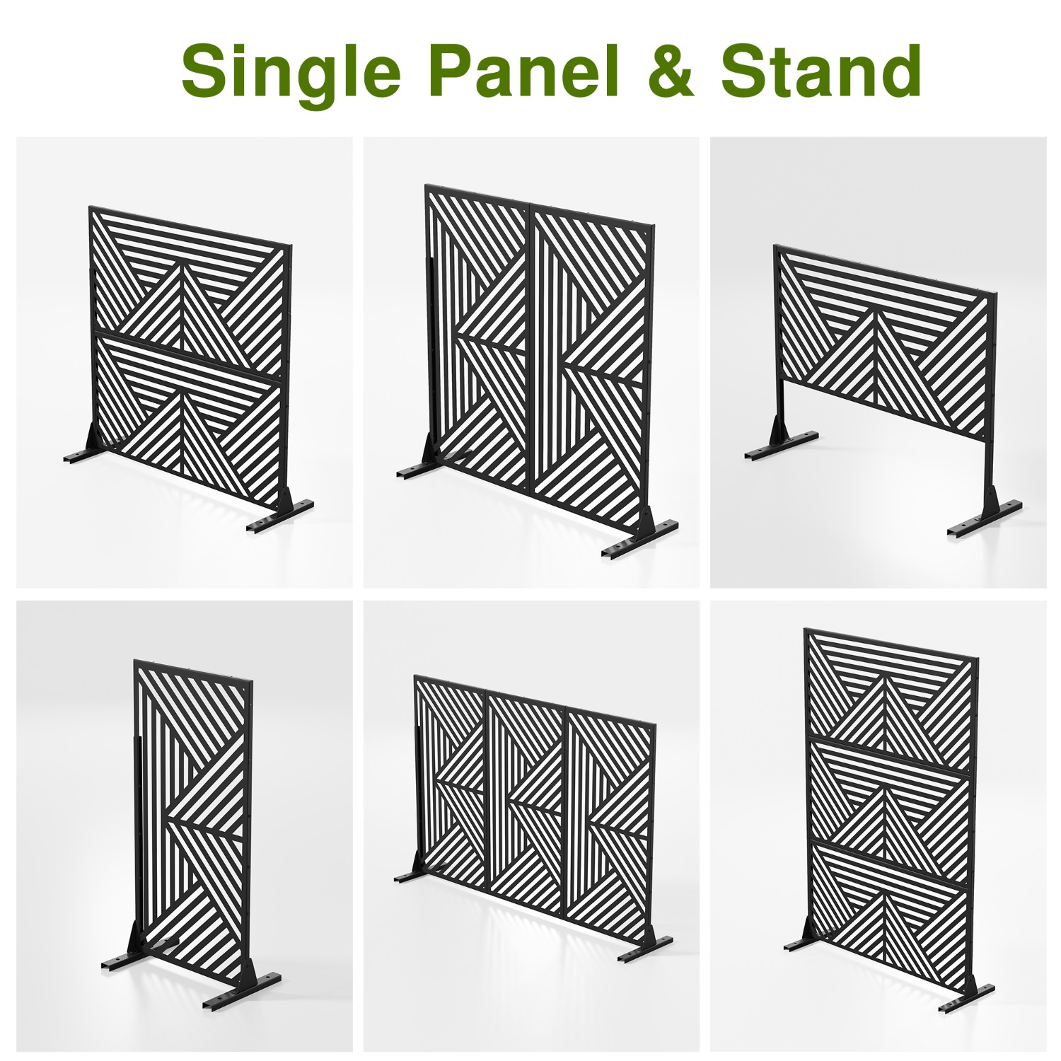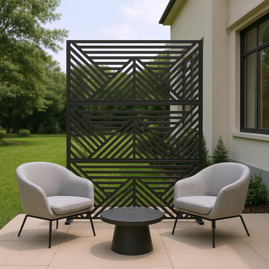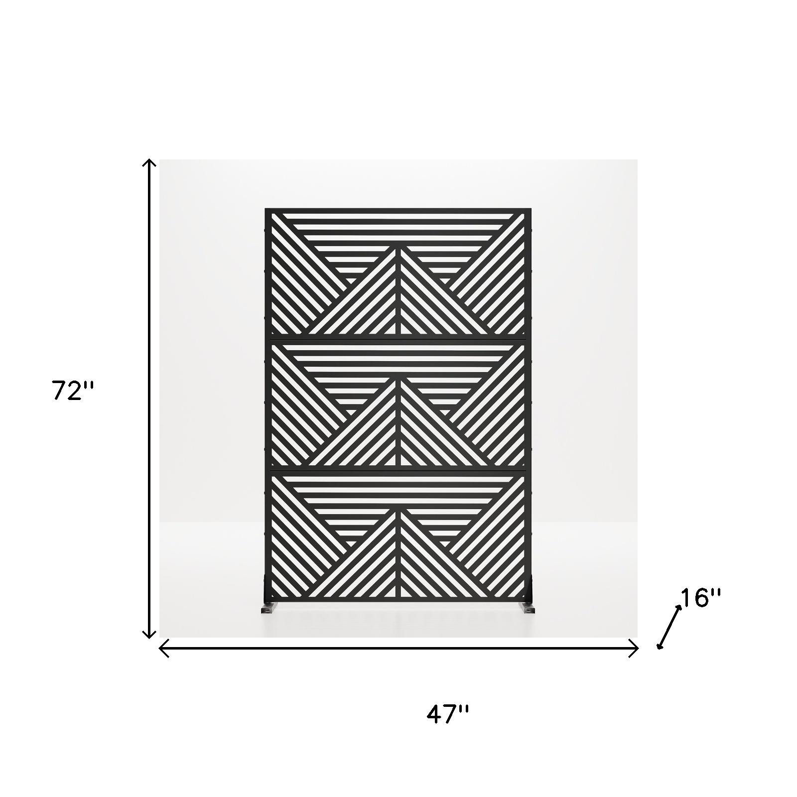 The 72-inch black steel three panel screen room divider offers a stylish solution for creating privacy in any space. Made from durable steel, this room divider is designed to withstand outdoor use while providing an elegant touch indoors. Its opaque design ensures complete privacy, making it perfect for separating areas without compromising on aesthetics. Featuring three panels, it allows for versatile arrangements to suit your needs. The reverse side matches the front in material, print, finish, and color, ensuring a cohesive look from every angle. This room divider not only enhances your decor but also adds functionality, making it an ideal choice for both home and outdoor settings. 72.00-inch h x 47.00-inch w x 16.00-inch d.