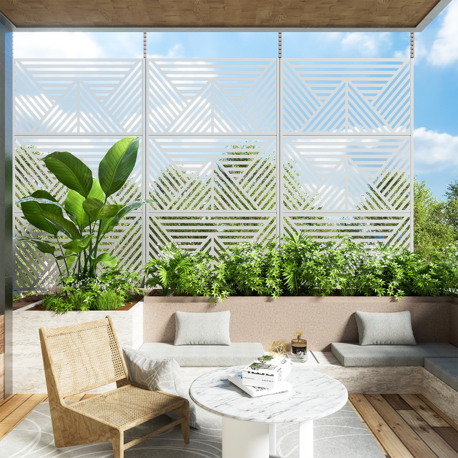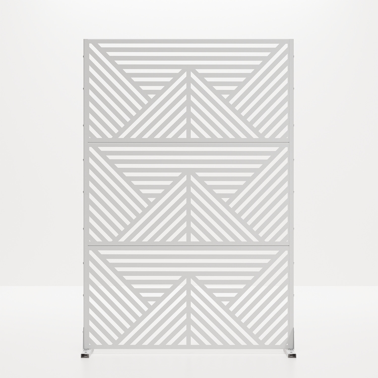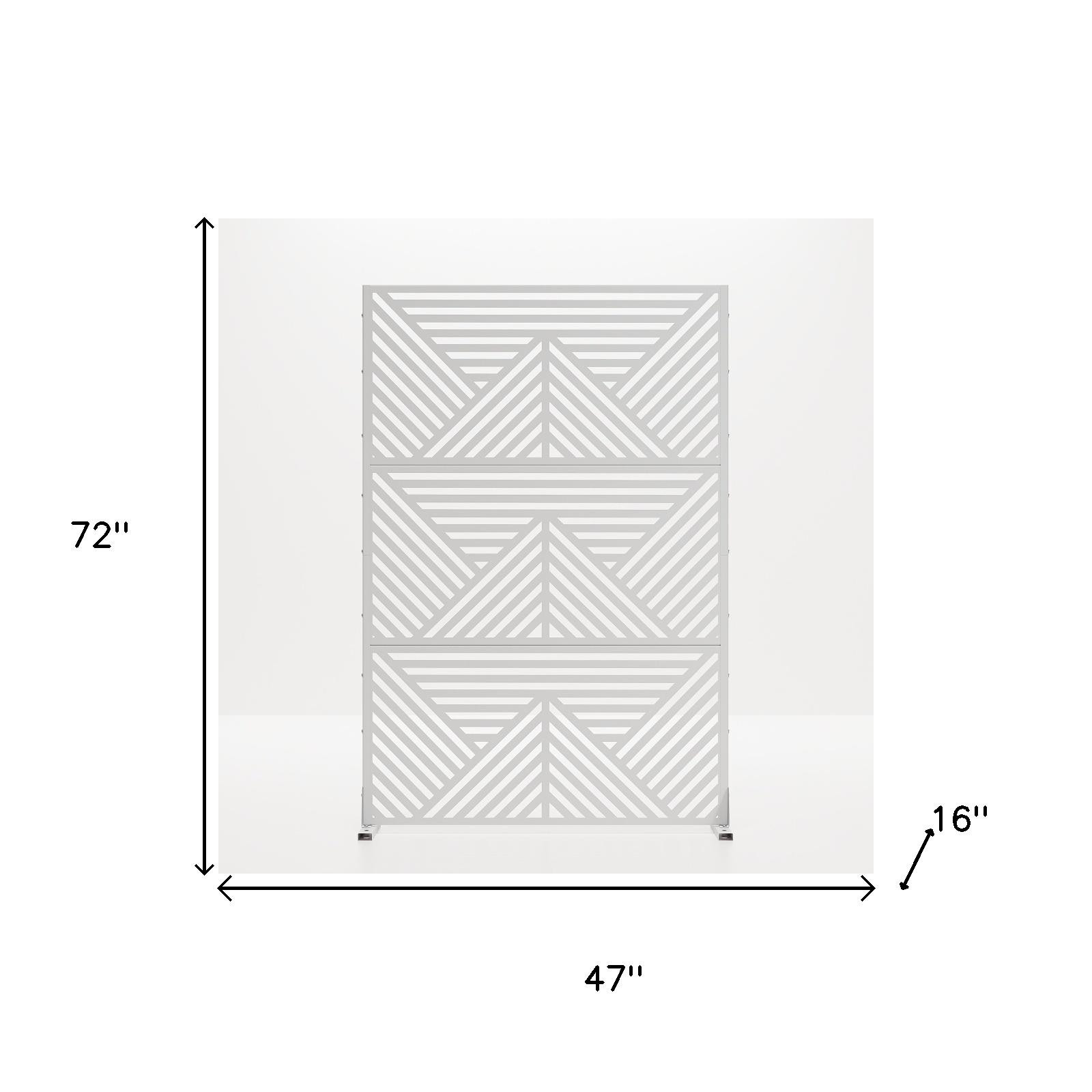 The 72-inch white steel three panel screen room divider offers a stylish way to create privacy or delineate spaces. Crafted with a durable steel frame, this room divider is suitable for both indoor and outdoor use. Its opaque screen material provides an effective separation while maintaining a sleek aesthetic. The reverse side features the same material and finish as the front, ensuring a cohesive look from all angles. With three panels, this versatile divider allows for flexible arrangements to suit your space needs. Enhance your home decor with this functional yet elegant piece that seamlessly blends style and practicality. 72.00-inch h x 47.00-inch w x 16.00-inch d.