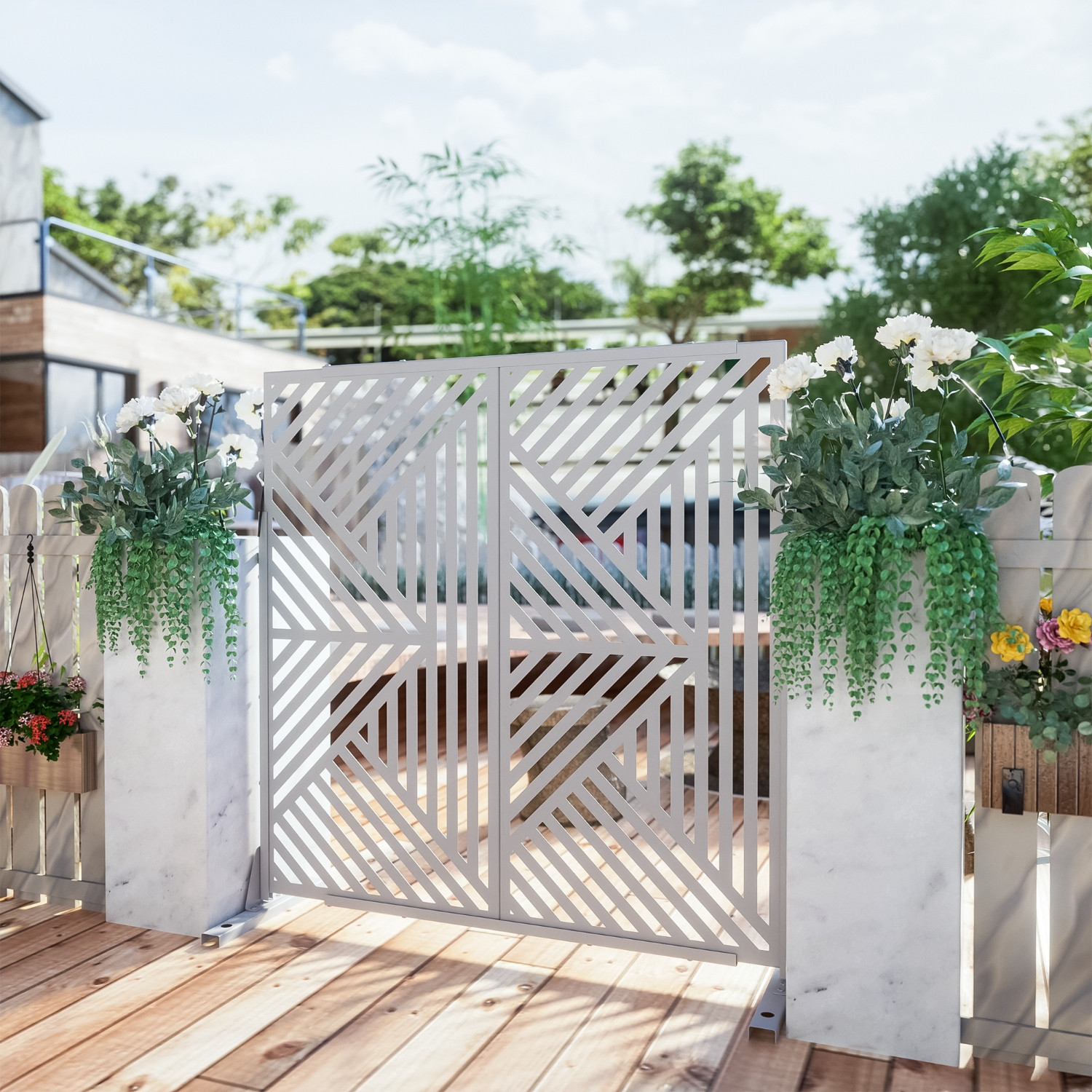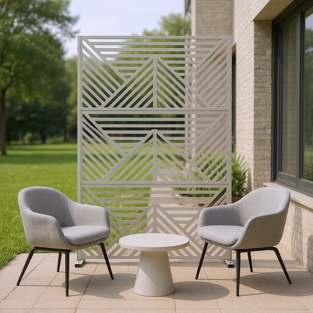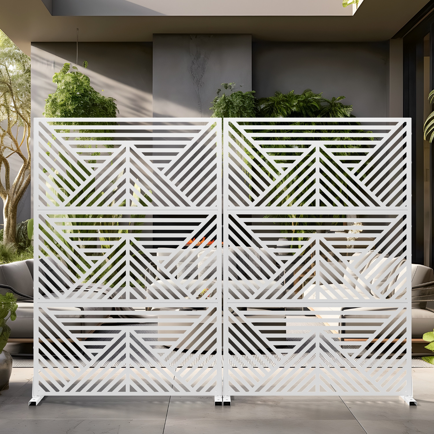 The 72-inch white steel three panel screen room divider offers a stylish way to create privacy or delineate spaces. Crafted with a durable steel frame, this room divider is suitable for both indoor and outdoor use. Its opaque screen material provides an effective separation while maintaining a sleek aesthetic. The reverse side features the same material and finish as the front, ensuring a cohesive look from all angles. With three panels, this versatile divider allows for flexible arrangements to suit your space needs. Enhance your home decor with this functional yet elegant piece that seamlessly blends style and practicality. 72.00-inch h x 47.00-inch w x 16.00-inch d.
