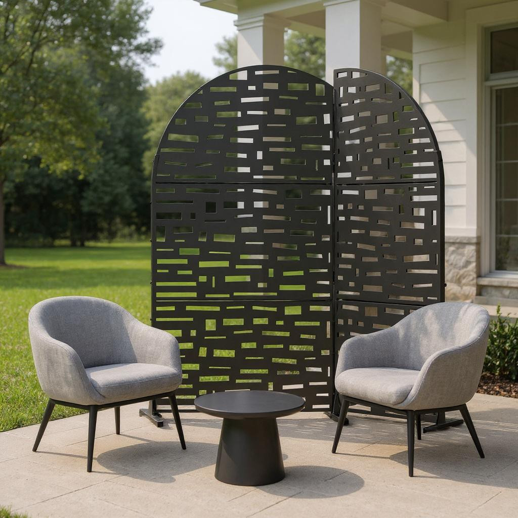 The 72-inch black steel three panel screen room divider offers a stylish and functional way to create distinct areas in your space. Crafted from durable steel, this room divider is designed for both indoor and outdoor use, making it versatile for any setting. The opaque screen provides privacy while maintaining a sleek aesthetic, and the reverse side features the same stunning print and finish as the front, ensuring a cohesive look from all angles. With three panels, it can be adjusted to suit various layouts, allowing you to customize your environment effortlessly. Transform your room with this elegant and practical divider that enhances your decor while providing separation and style. 72.00-inch h x 47.00-inch w x 16.00-inch d.