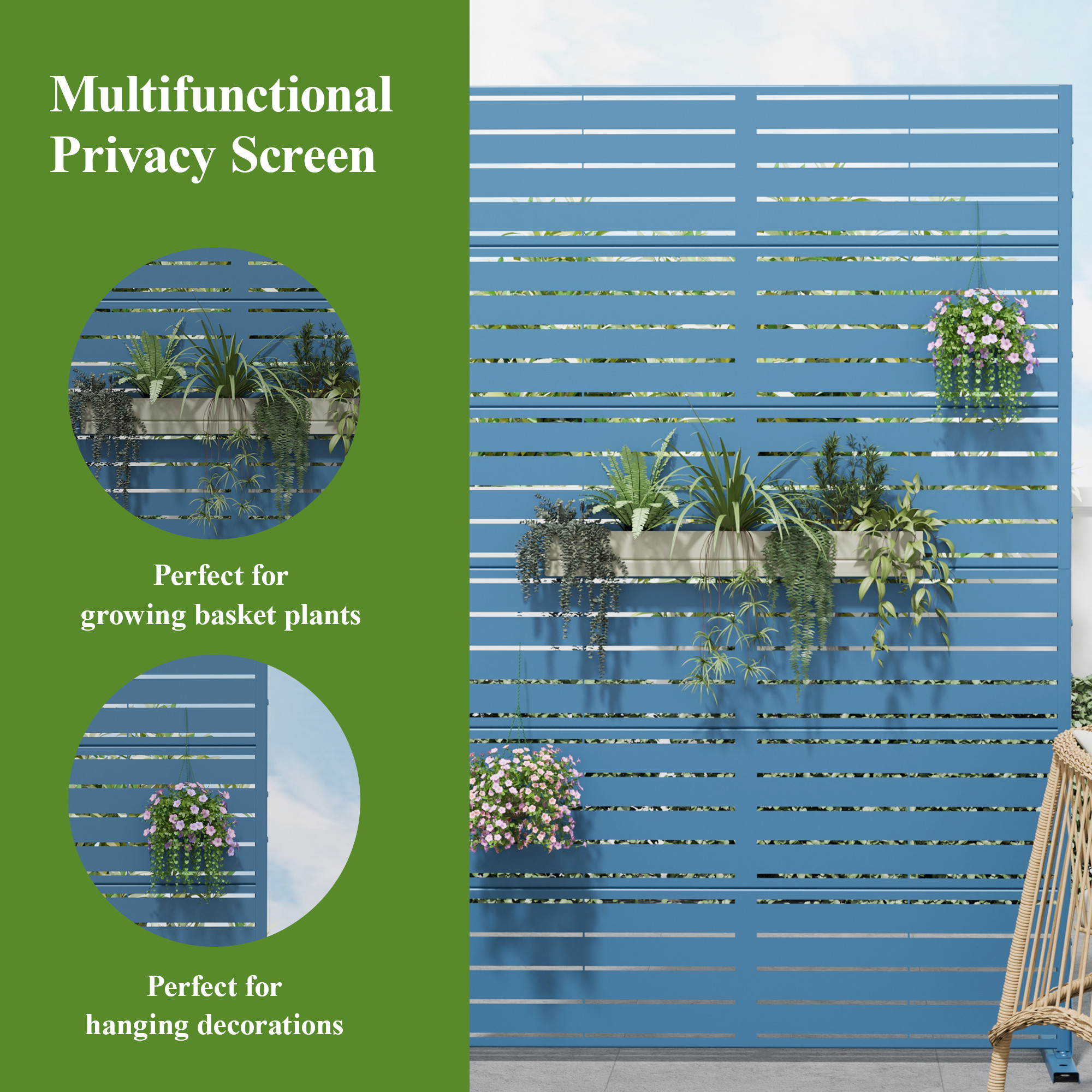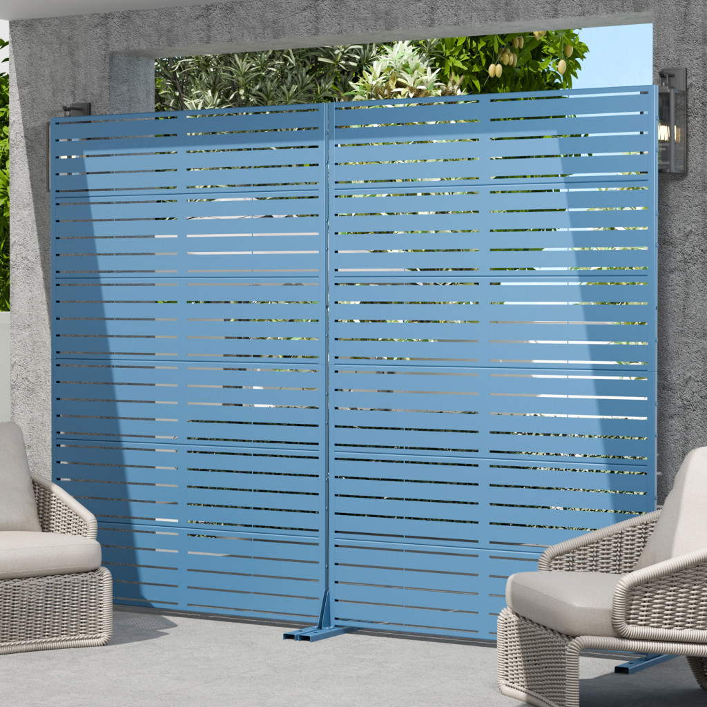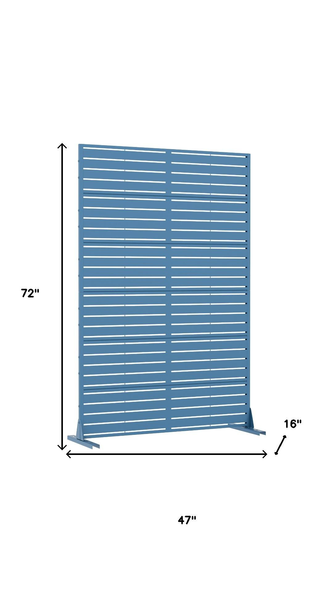 The 72-inch blue steel six panel screen room divider offers a stylish solution for creating separate spaces in your home or outdoor area. Crafted from durable steel, this room divider ensures long-lasting use and stability. Its opaque screen material provides privacy while maintaining an elegant look. The reverse side features the same finish and color as the front, making it visually appealing from any angle. With six panels, it can effectively segment larger areas, allowing for versatile arrangements that suit your needs. This single panel design is perfect for those who desire a functional yet decorative element in their living space. Enhance your decor with this modern and practical room divider. 72.00-inch h x 47.00-inch w x 16.00-inch d.