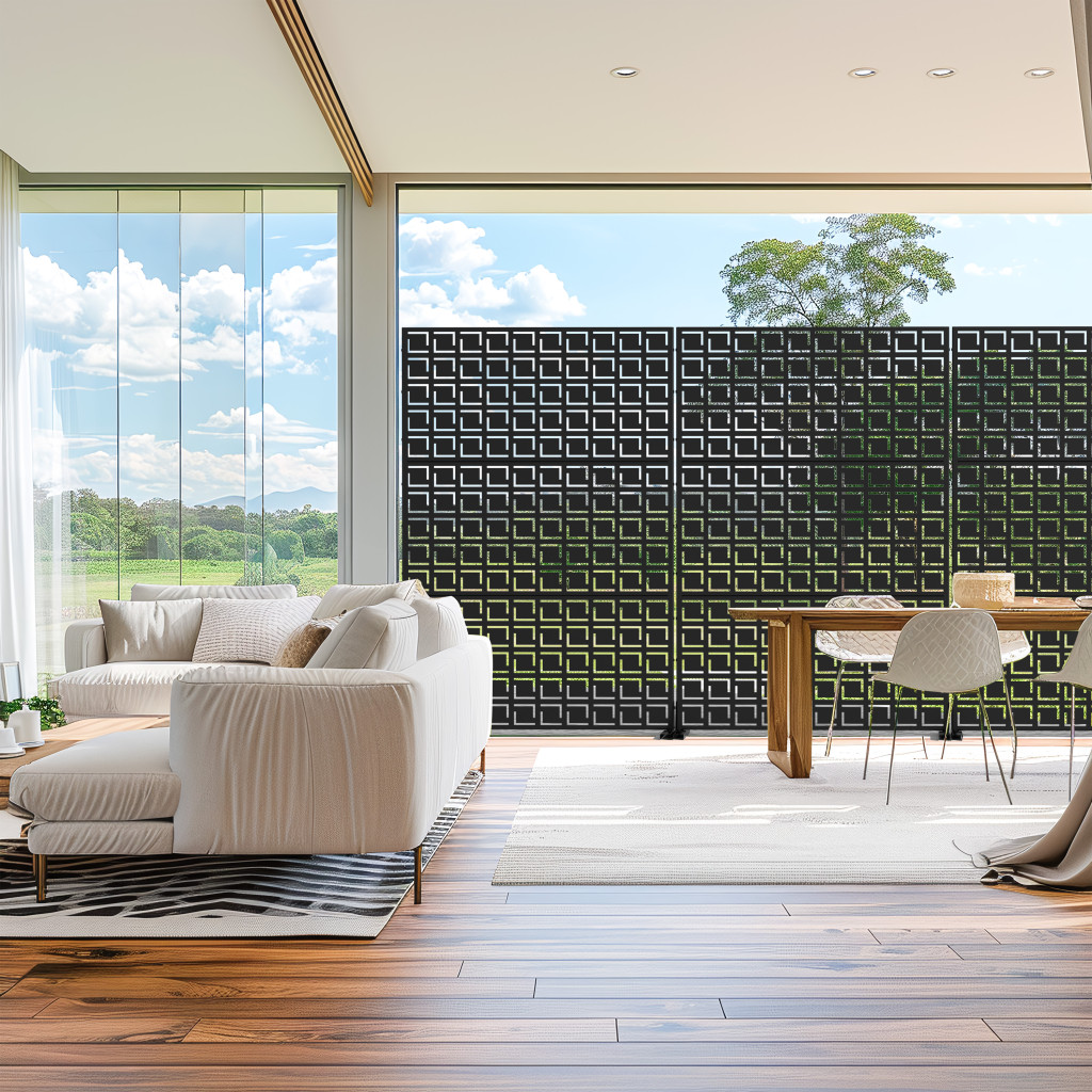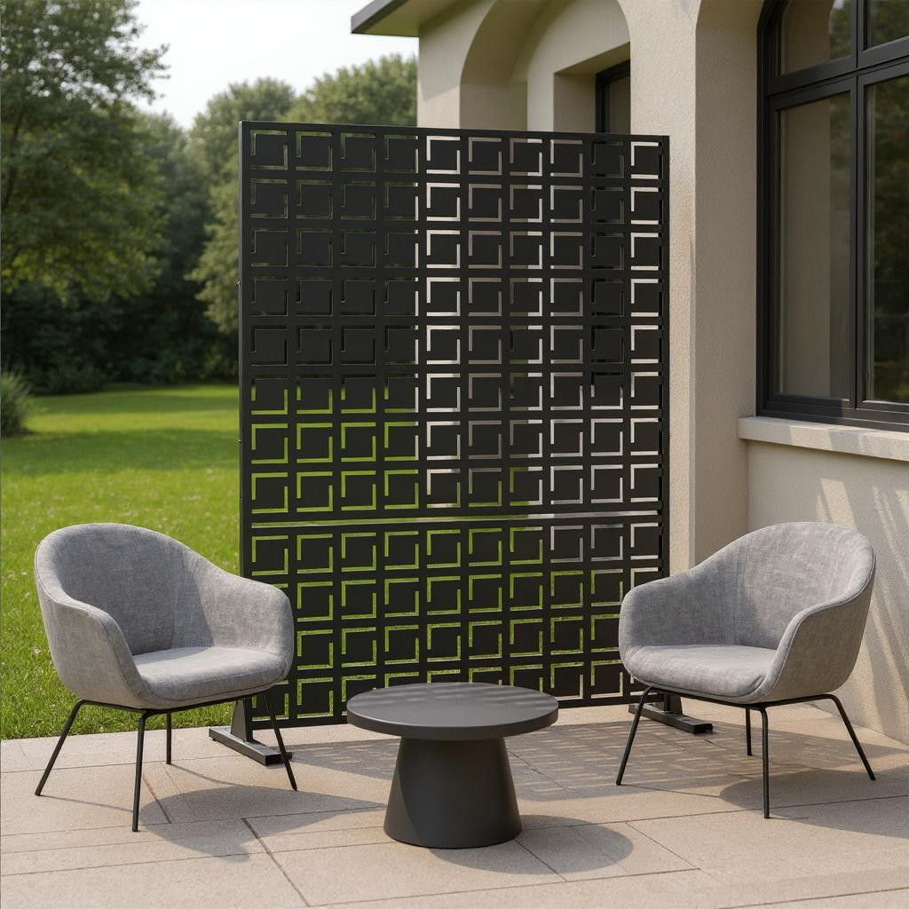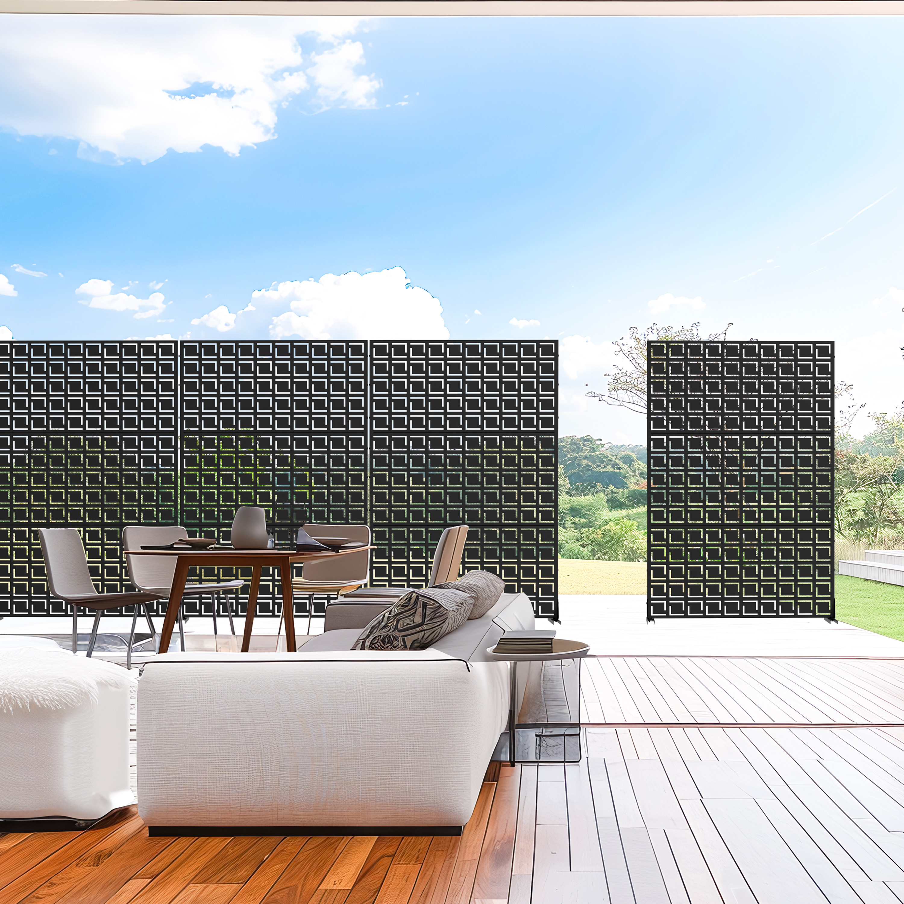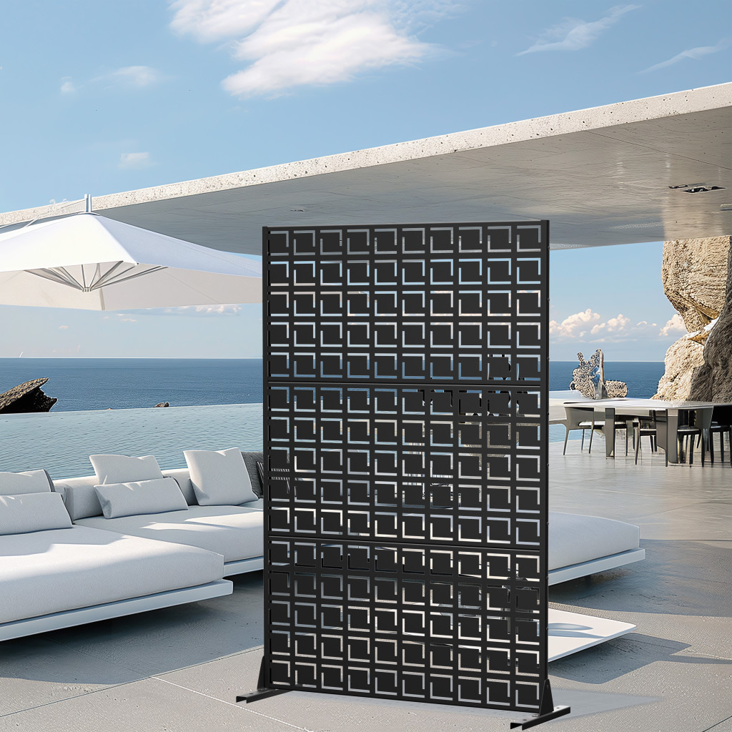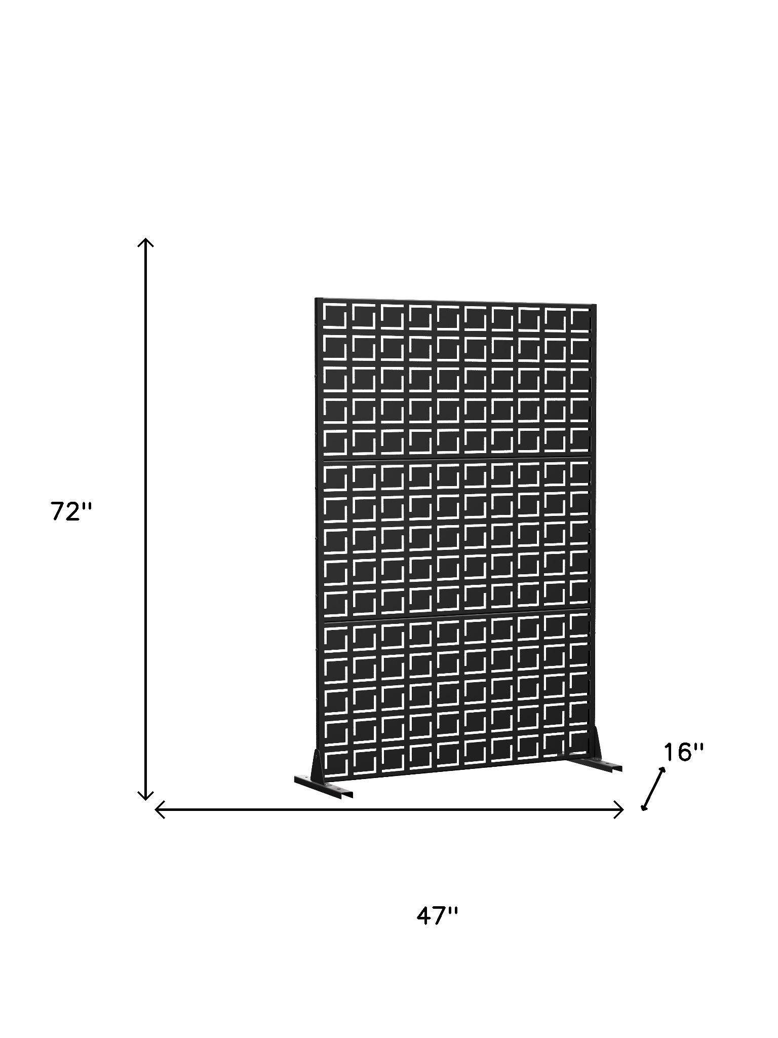 The 72-inch black steel three panel screen room divider adds a touch of modern elegance to any space. Crafted from durable steel, this room divider is designed for both indoor and outdoor use, offering versatility in your decorating options. Its opaque screen material ensures privacy while beautifully separating areas within a room. Each of the three panels features a cohesive design, as the reverse side maintains the same stunning print and color as the front. This single panel room divider effortlessly blends style with functionality, making it an ideal choice for creating a cozy nook or defining spaces in larger environments. Transform your living area with this striking and practical addition to your home decor. 72.00-inch h x 47.00-inch w x 16.00-inch d.
