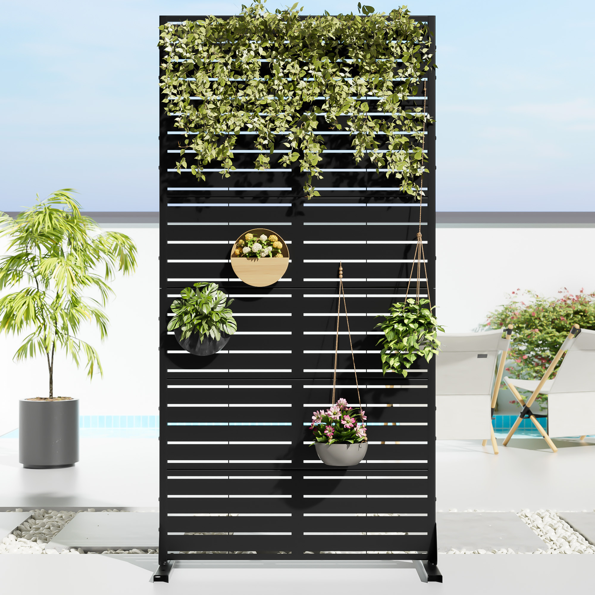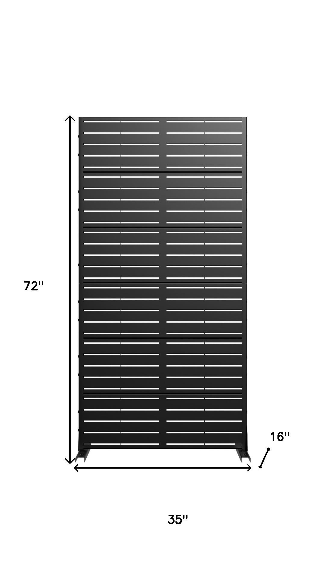 The 72-inch black steel six panel screen room divider offers a stylish solution for creating separate areas in your space. Constructed from sturdy steel, this divider ensures durability and a modern aesthetic. It is designed for both indoor and outdoor use, making it versatile for any setting. The opaque screen material provides privacy while allowing light to filter through, enhancing your environment. With a cohesive look, the reverse side of the divider maintains the same material, print, finish, and color as the front, ensuring a polished appearance from all angles. Featuring six panels, it allows for flexible arrangements to suit your needs and spatial layout. 72.00-inch h x 35.00-inch w x 16.00-inch d.
