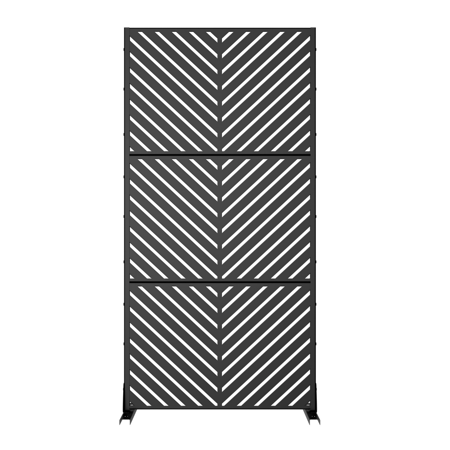 The 72-inch black steel three panel screen room divider elegantly partitions your space while adding a modern touch. Crafted from durable steel, this room divider is perfect for both indoor and outdoor use, enhancing your environment's versatility. Its opaque design ensures privacy without compromising style, making it ideal for any setting. Each of the three panels features a cohesive finish, with the reverse side mirroring the front, maintaining a seamless look. This functional yet stylish solution allows you to create defined areas within larger rooms or outdoor spaces effortlessly. Enjoy the balance of practicality and aesthetics that this room divider brings to your home or patio. 72.00-inch h x 35.00-inch w x 16.00-inch d.