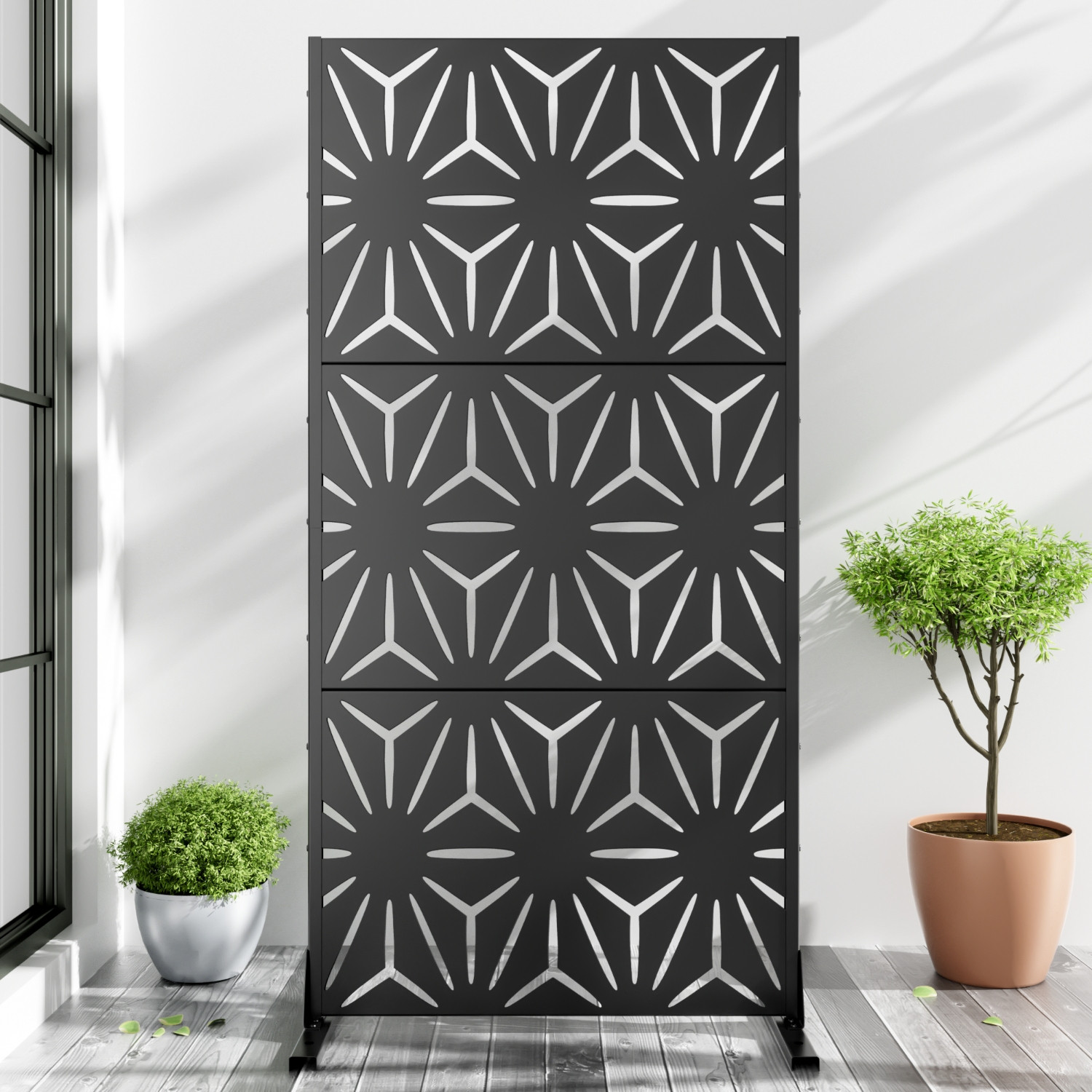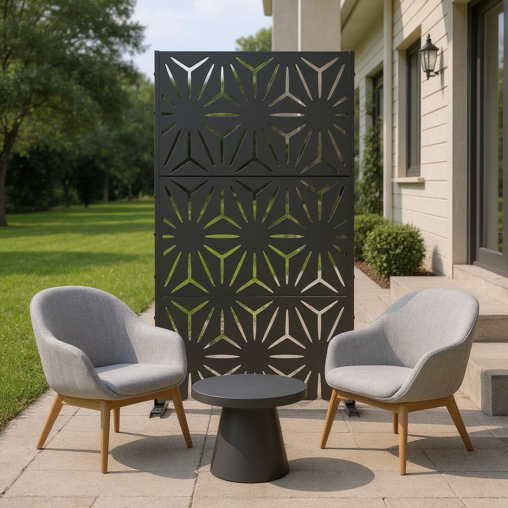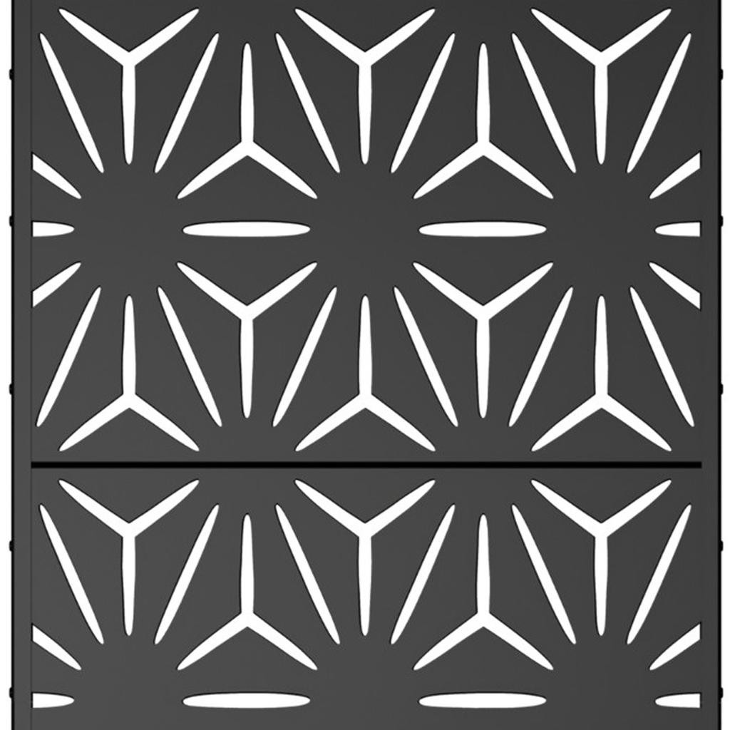 The 72-inch black steel three panel screen room divider adds a stylish touch to your space. Crafted from durable steel, this room divider is perfect for both indoor and outdoor use. Its opaque screen material ensures privacy while enhancing your decor. The reverse side features the same material, print, finish, and color as the front, providing a cohesive look from any angle. With three panels, this versatile piece allows you to create distinct areas in larger rooms or patios, making it ideal for any setting. Whether you want to separate living areas or add a decorative element, this room divider is a functional and aesthetic addition to your home. 72.00-inch h x 35.00-inch w x 16.00-inch d.