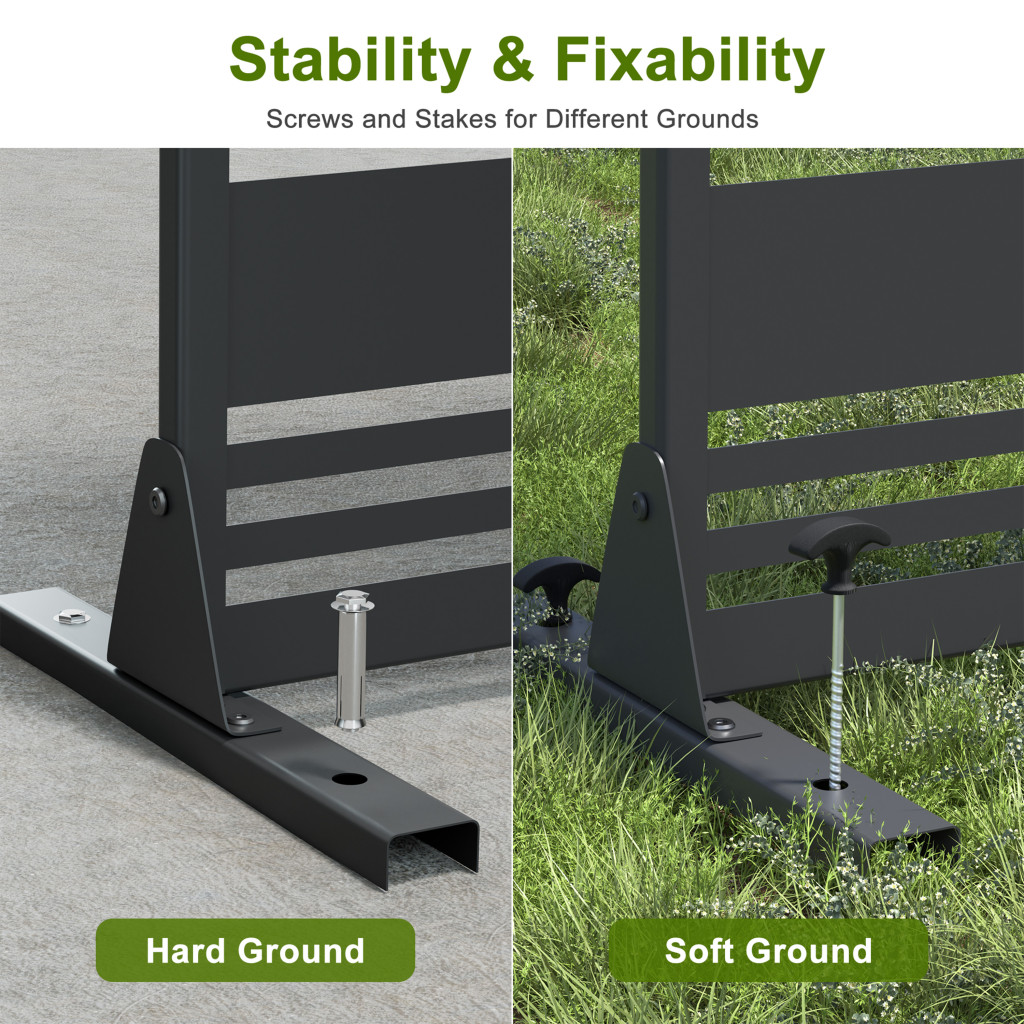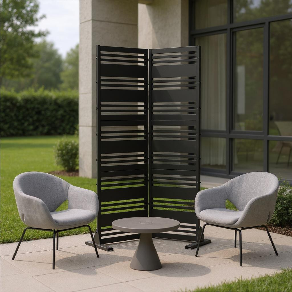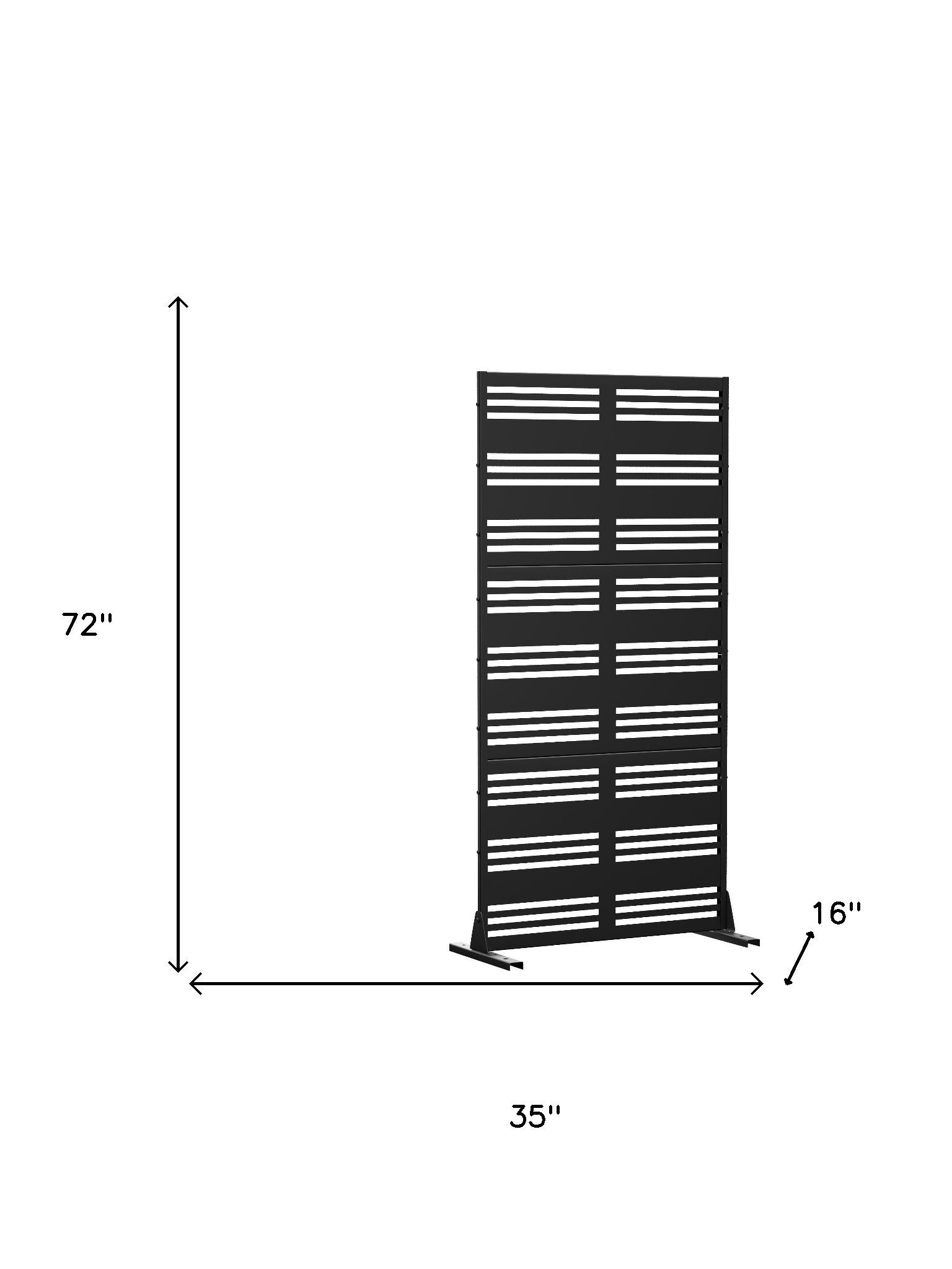 The 72-inch black steel three panel screen room divider is an elegant addition to any space. Crafted from durable steel, this piece offers a robust and stylish way to create separate areas in your home or outdoor setting. The opaque screens provide privacy and a sophisticated look, enhancing your decor while maintaining a modern aesthetic. Each of the three panels features the same high-quality material and finish on both sides, ensuring a cohesive appearance from all angles. Perfect for dividing rooms or outdoor patios, this versatile room divider combines functionality with contemporary design, making it an ideal choice for those seeking to enhance their living environment. 72.00-inch h x 35.00-inch w x 16.00-inch d.