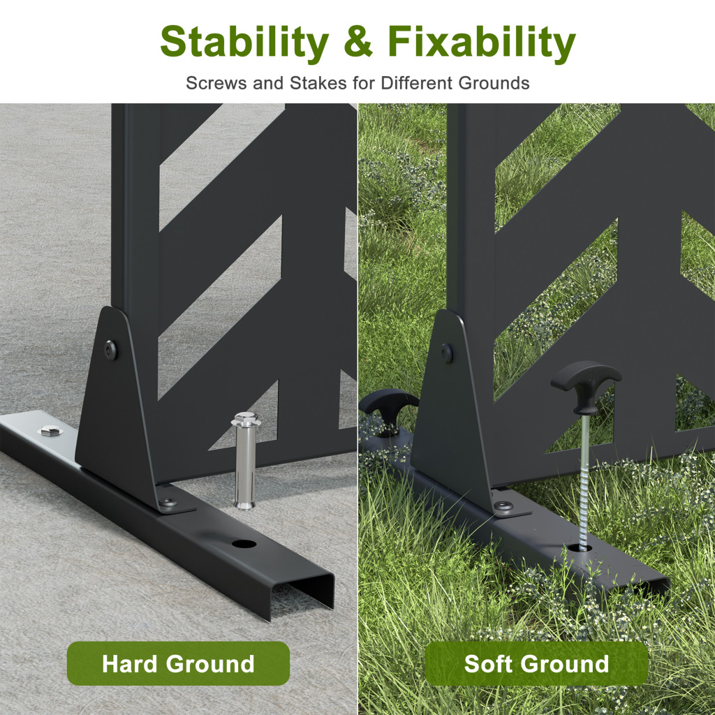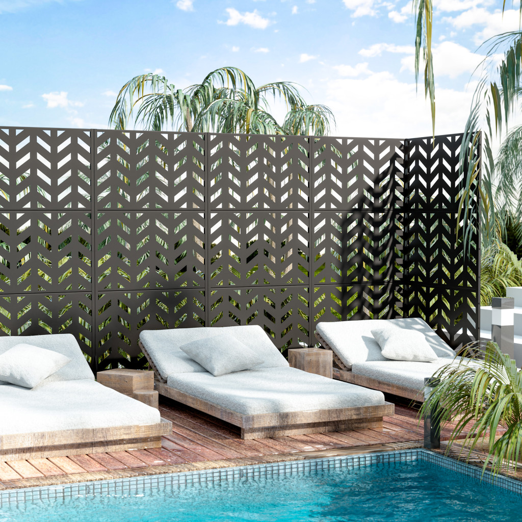 The 72-inch black steel three panel screen room divider elegantly enhances your space while providing versatility. Crafted from durable steel, this room divider is perfect for outdoor use, making it ideal for patios or gardens. Its opaque screen material ensures privacy while maintaining a stylish look. The reverse side features the same material, print, finish, and color as the front, delivering a cohesive aesthetic from any angle. With three panels, it offers flexible configuration options to suit your layout needs. This room divider is not just functional but also adds a contemporary touch to your home decor, allowing you to create distinct areas in open spaces effortlessly. 72.00-inch h x 35.00-inch w x 16.00-inch d.