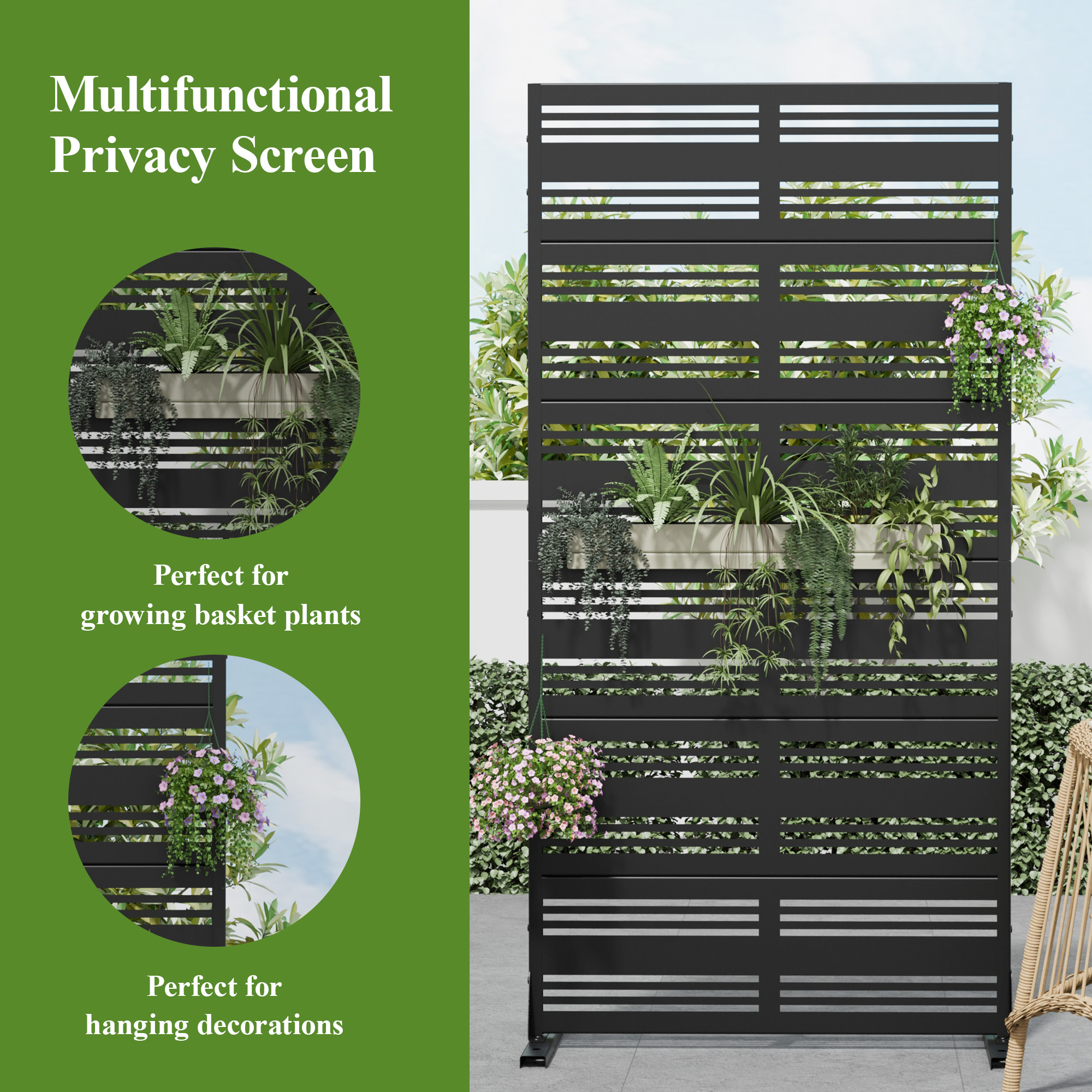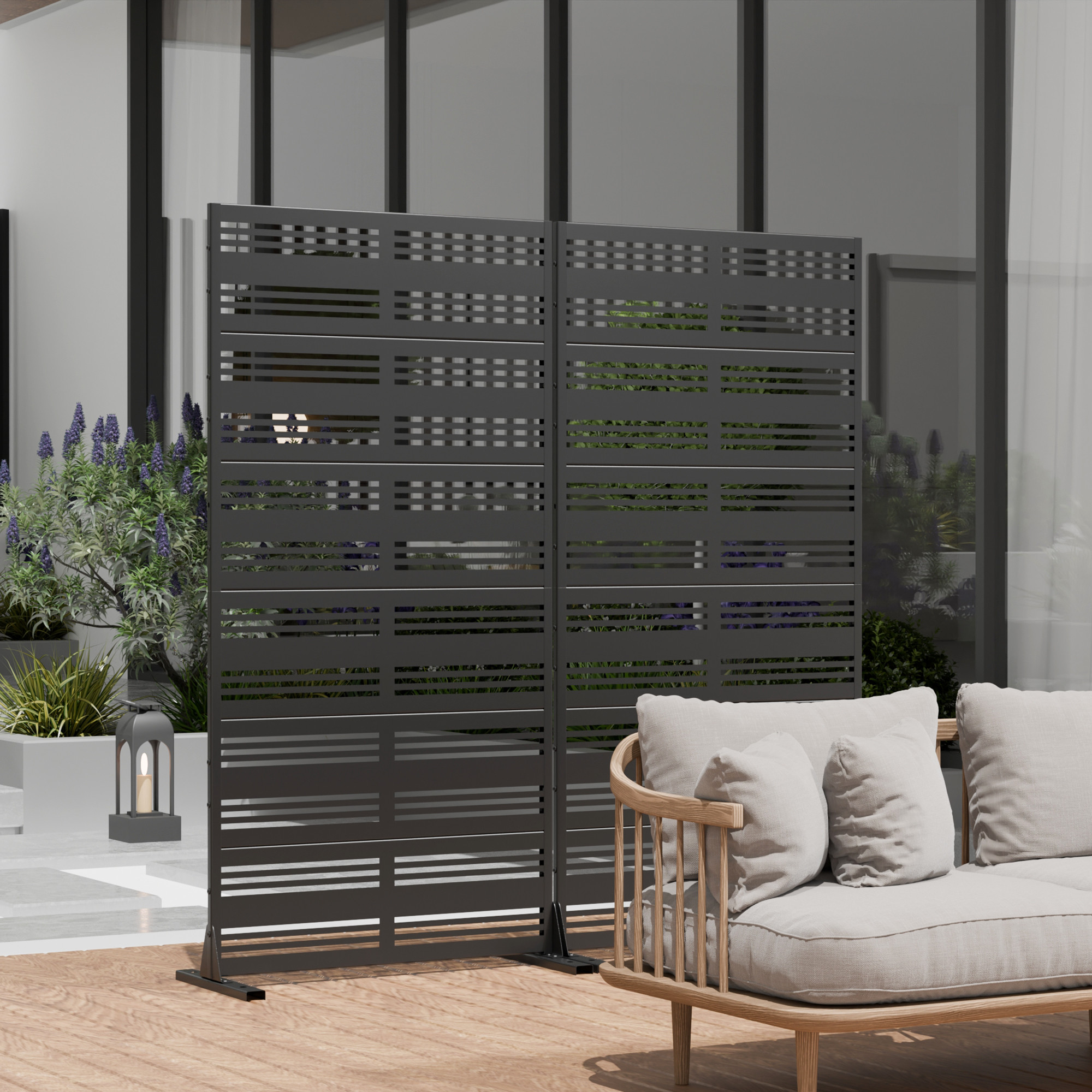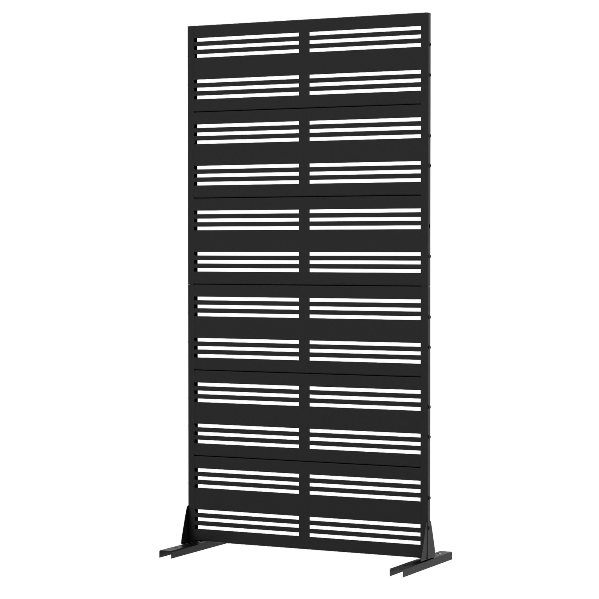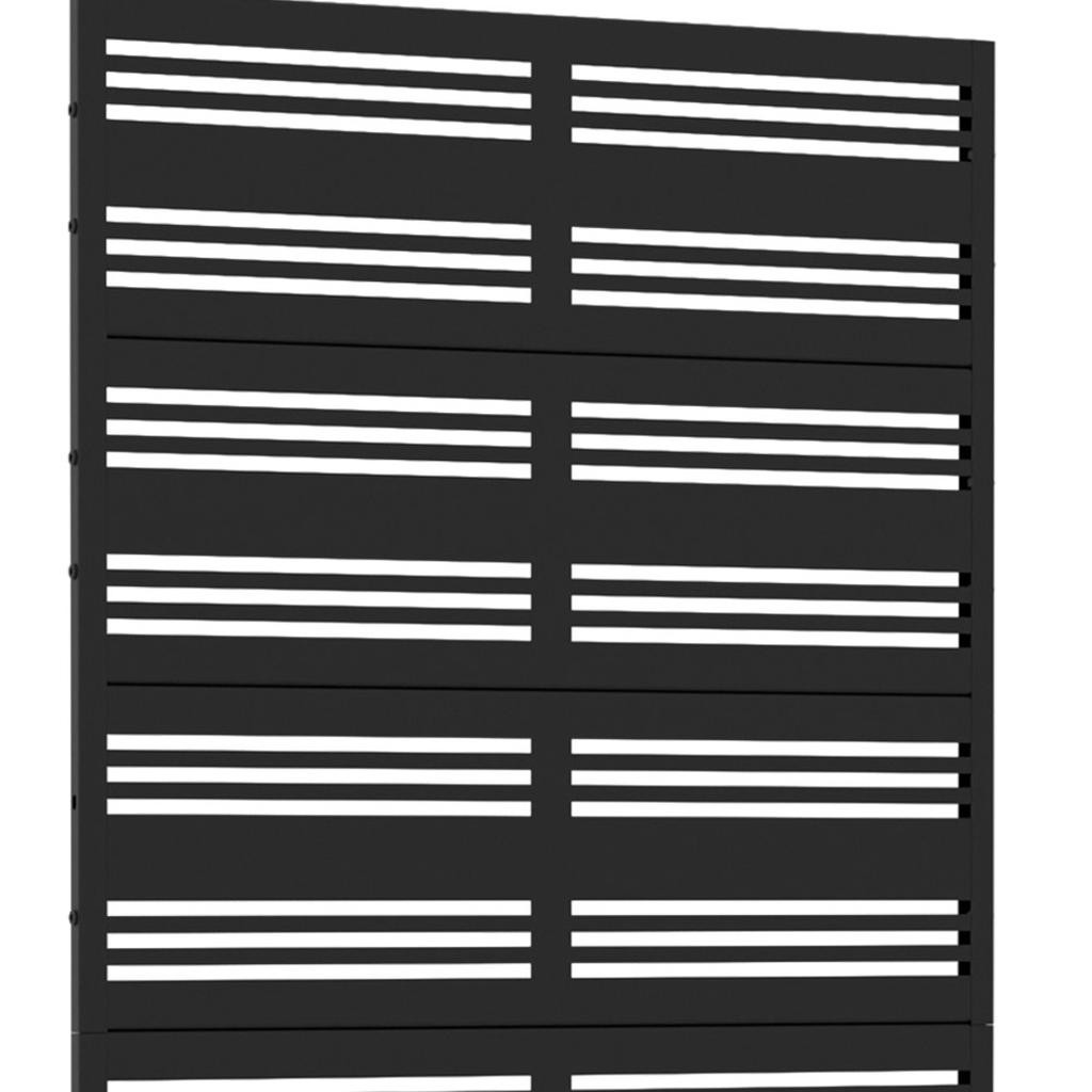 The 72-inch black steel six panel screen room divider offers an elegant solution for separating spaces in your home or outdoor area. Crafted from durable steel, this versatile room divider combines strength with modern design. Its opaque screen material ensures privacy while maintaining a contemporary aesthetic. The reverse side features the same material, print, finish, and color as the front, enhancing its seamless look from any angle. With six panels, this divider can be configured to fit various spaces and design needs. It is an excellent addition for creating distinct areas in larger rooms or outdoor settings while adding a touch of style to your decor. 72.00-inch h x 35.00-inch w x 16.00-inch d.