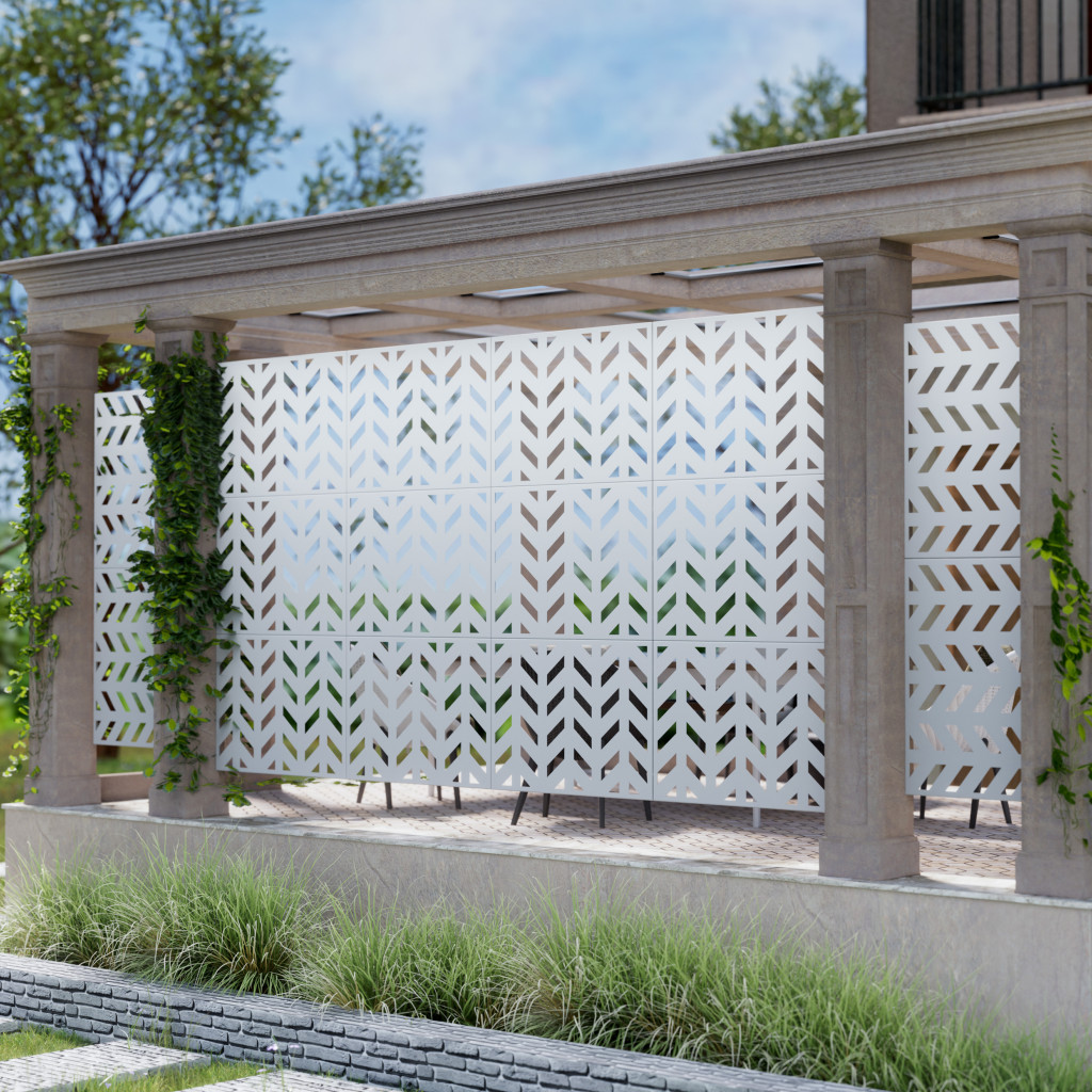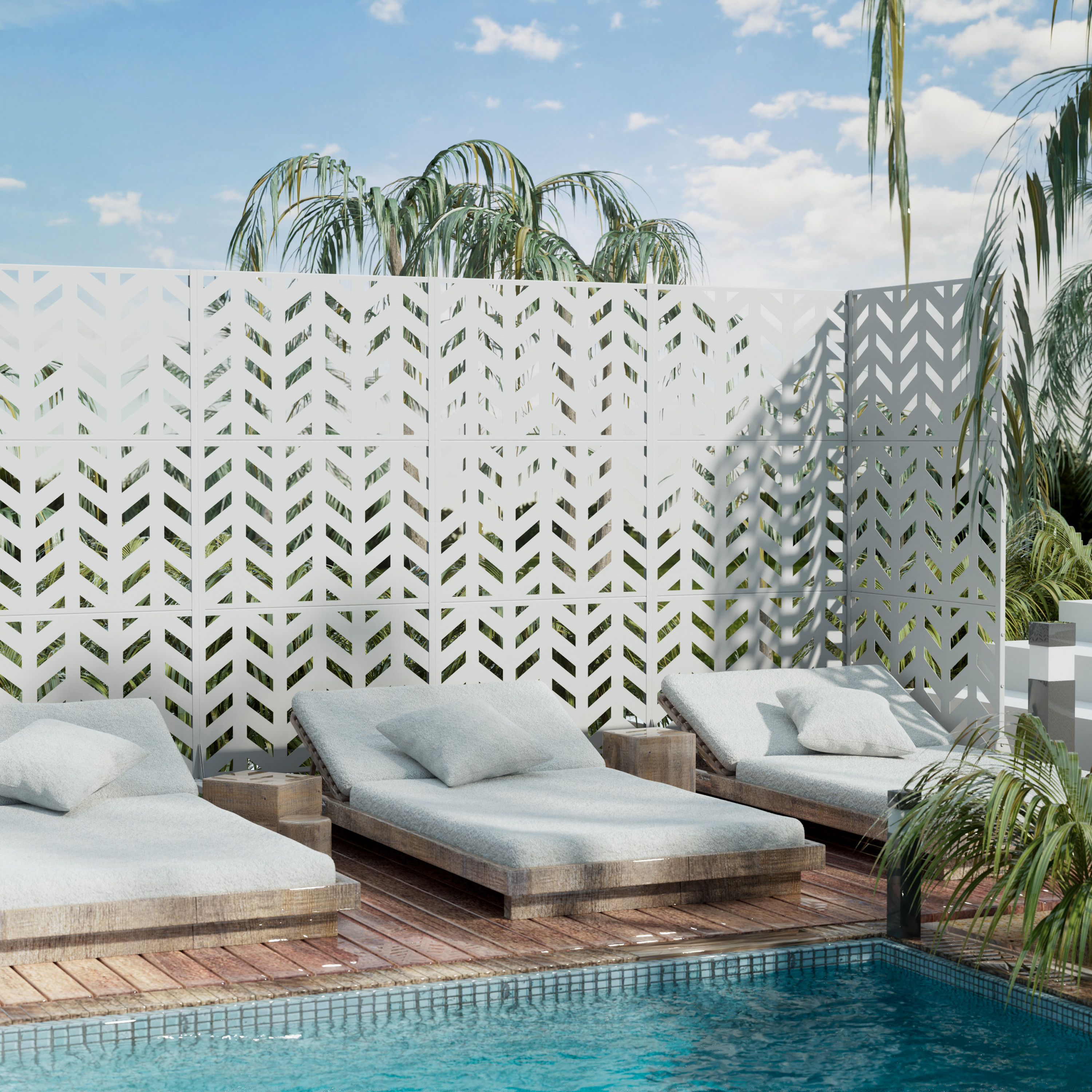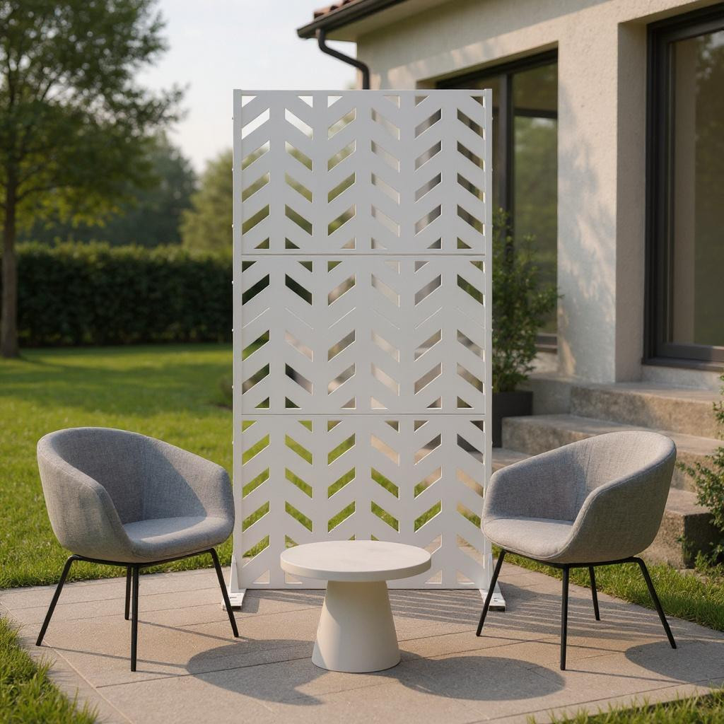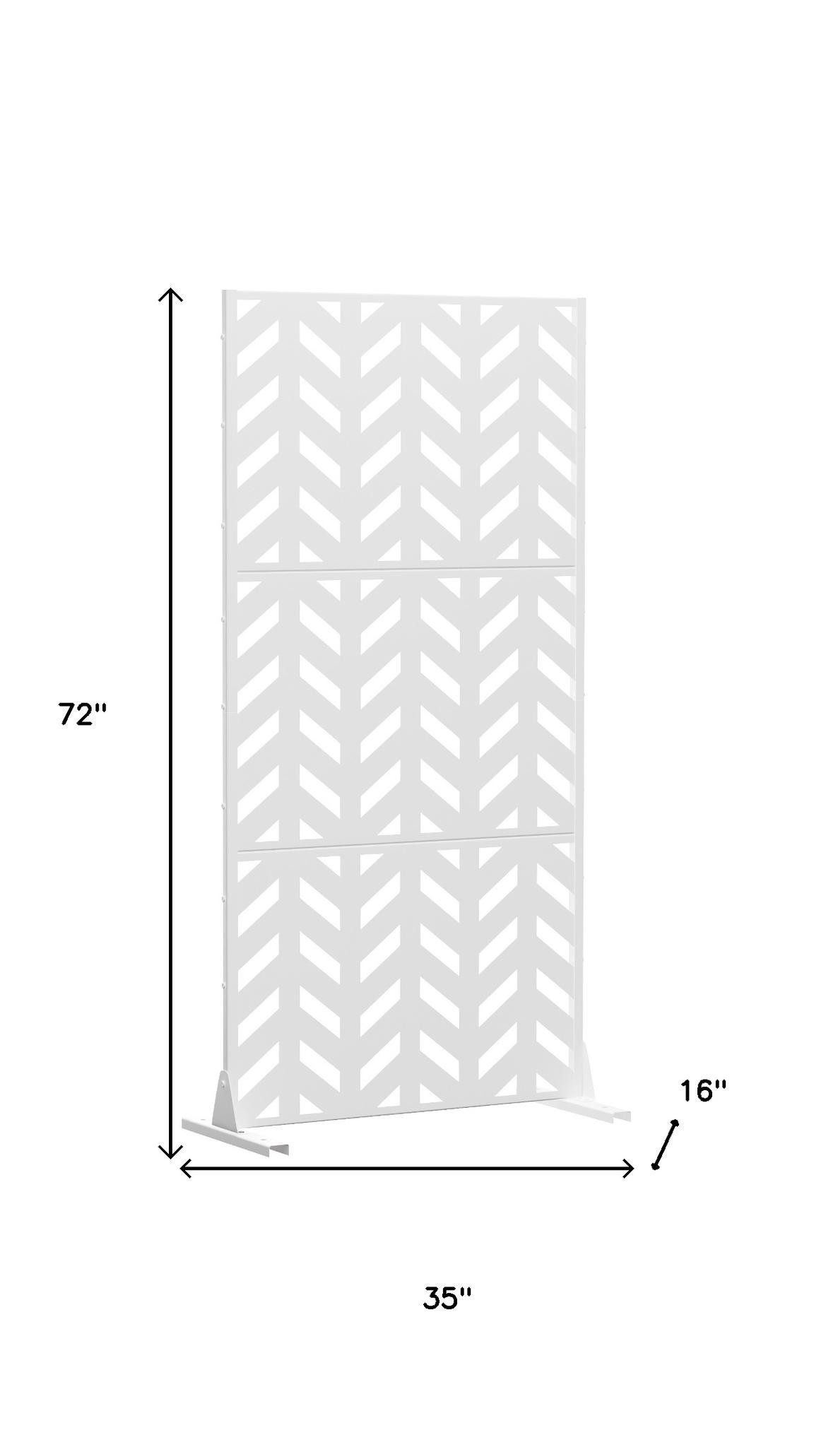The 72-inch white steel three panel screen room divider offers a stylish way to enhance your living space. Crafted from durable steel, this room divider ensures both sturdiness and elegance. It features a striking opaque design that adds privacy while allowing light to filter through. Ideal for both indoor and outdoor use, it can easily adapt to any setting. With its three-panel configuration, this versatile screen can transform large areas into intimate spaces. The reverse side maintains the same material and finish as the front, providing a cohesive look from any angle. Perfect for creating cozy nooks or defining spaces, this room divider is a practical and aesthetically pleasing addition to your home decor. 72.00-inch h x 35.00-inch w x 16.00-inch d.