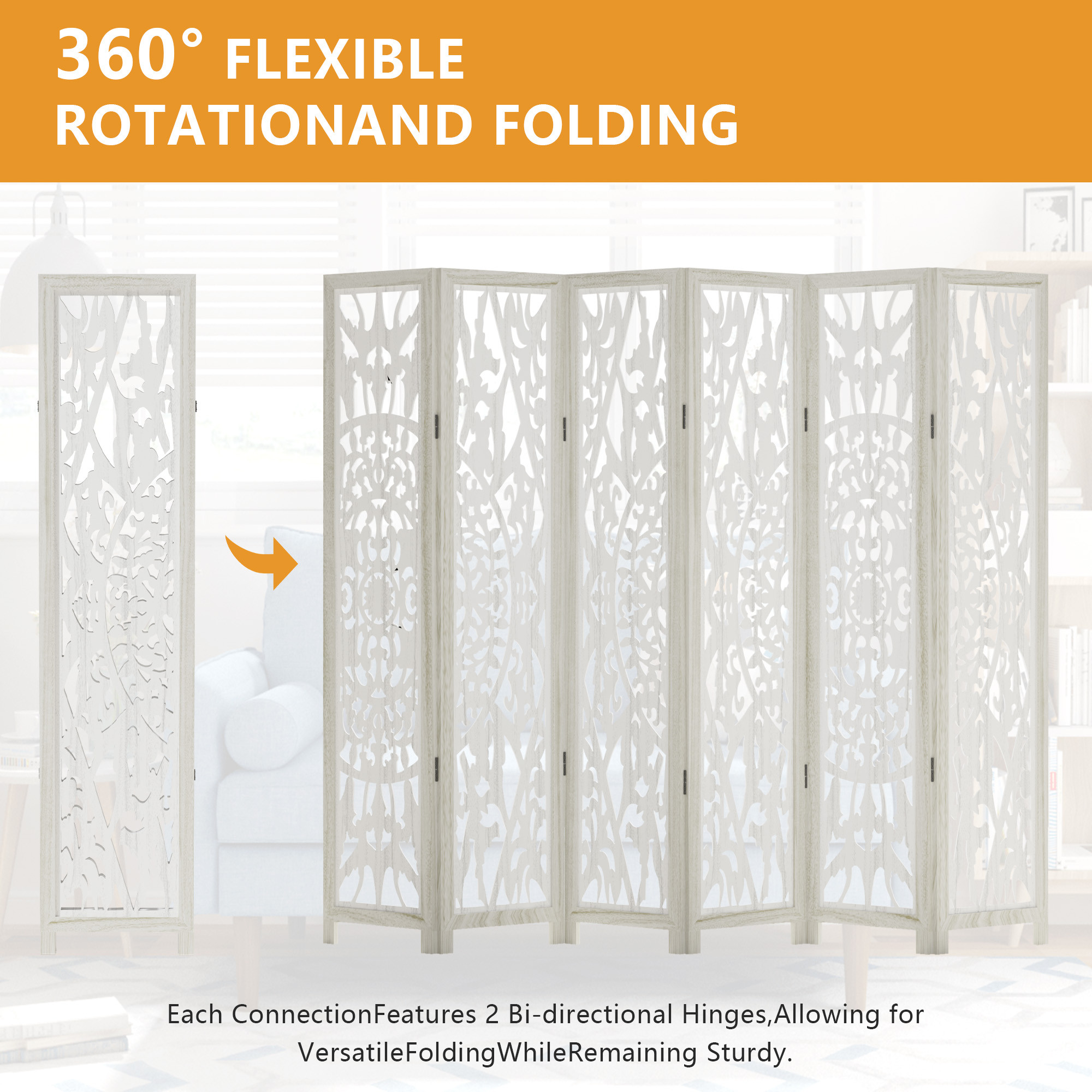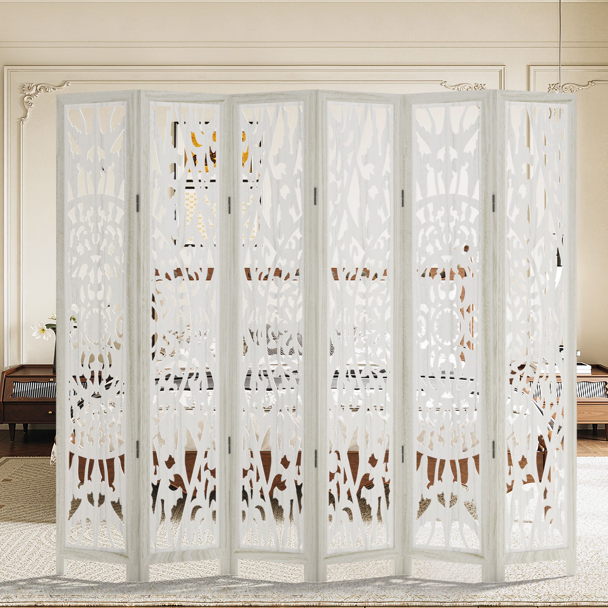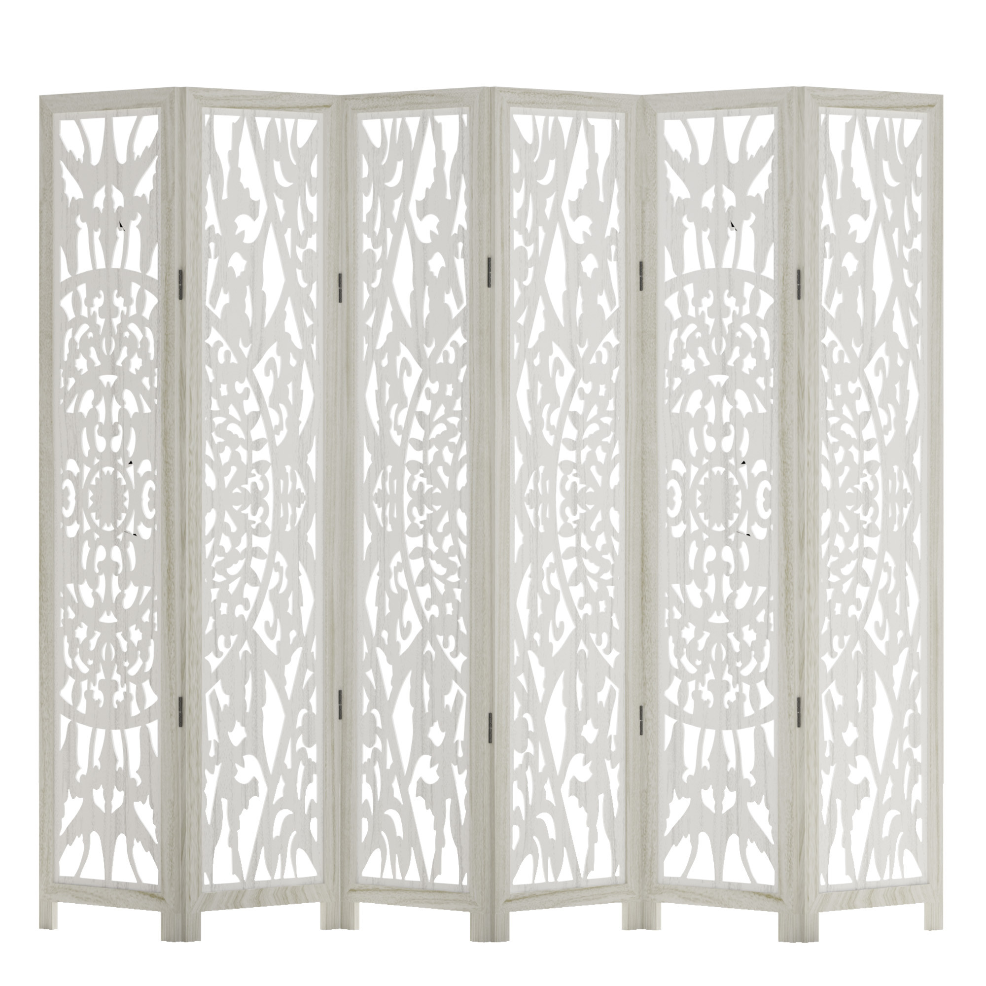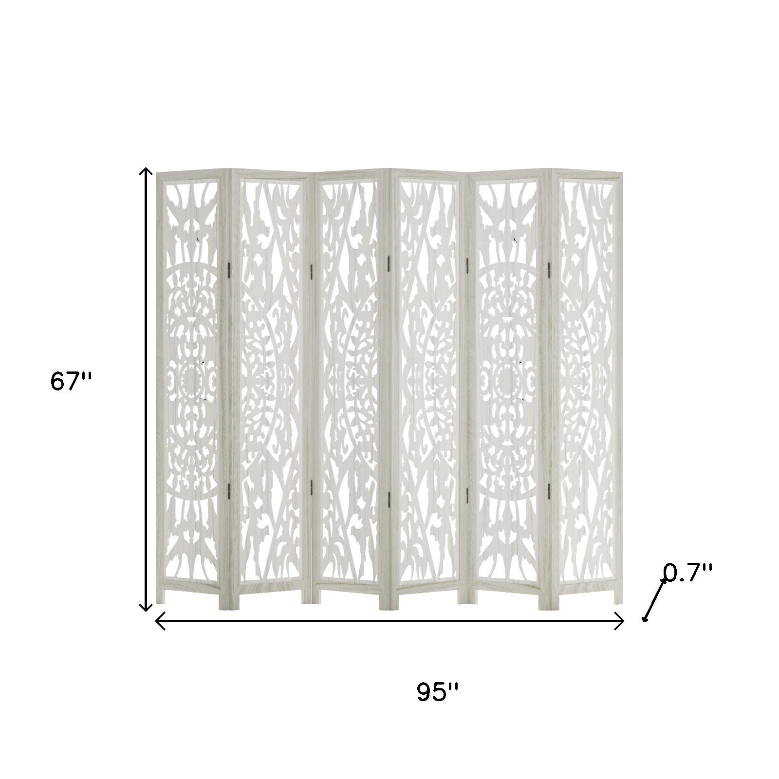The 67-inch white wood six panel screen room divider elegantly enhances your space with its stylish design. Crafted from high-quality wood, this durable piece ensures both stability and a refined aesthetic. Each of the six panels features an opaque finish, providing privacy while allowing light to gently filter through. The reverse side mirrors the front's material, print, finish, and color, ensuring a cohesive look from any angle. This single panel construction allows for versatile placement, making it ideal for defining areas in larger rooms or adding a decorative touch to compact spaces. Its chic white finish seamlessly blends with various decor styles, offering a functional yet fashionable solution for your home. 67.00-inch h x 95.00-inch w x 0.70-inch d.