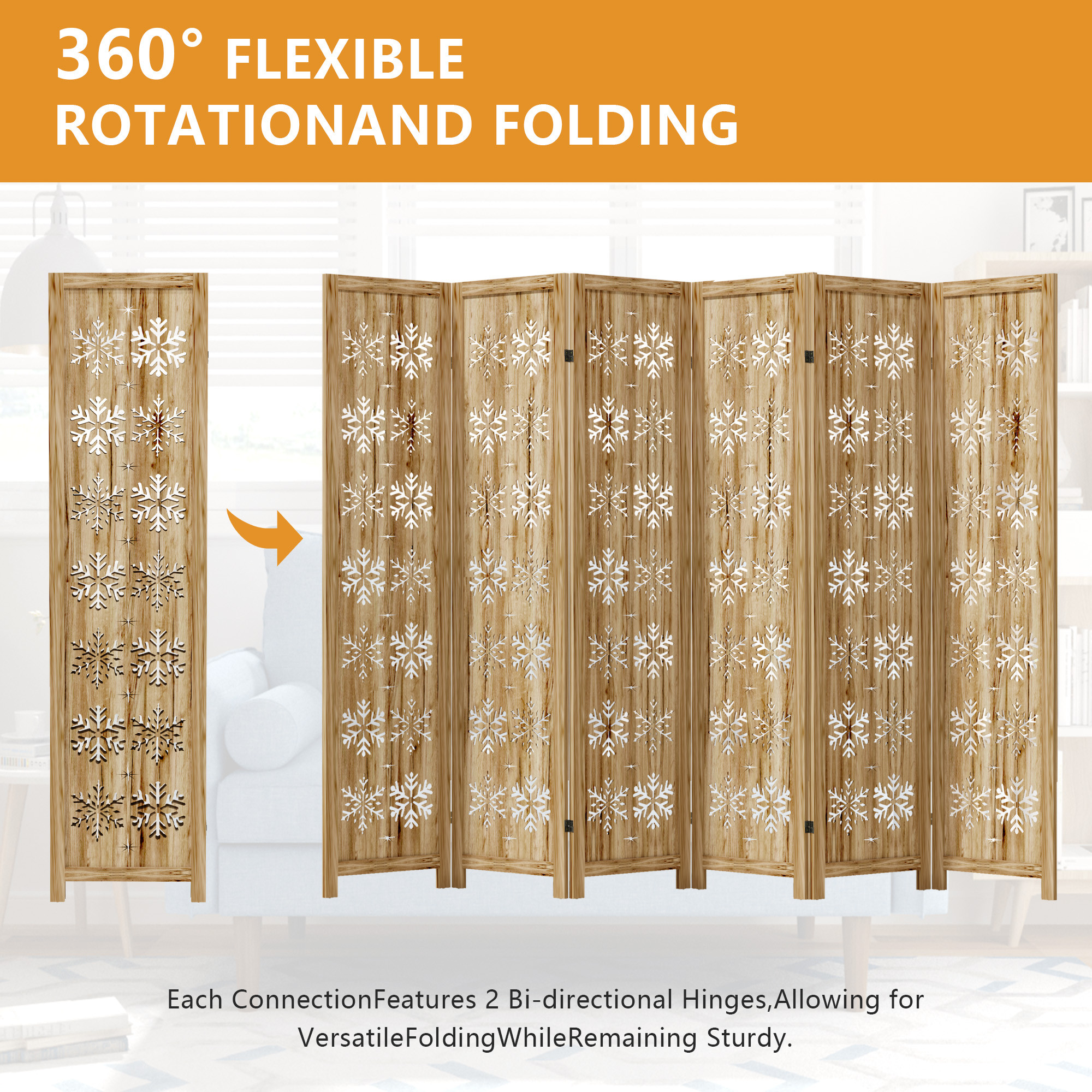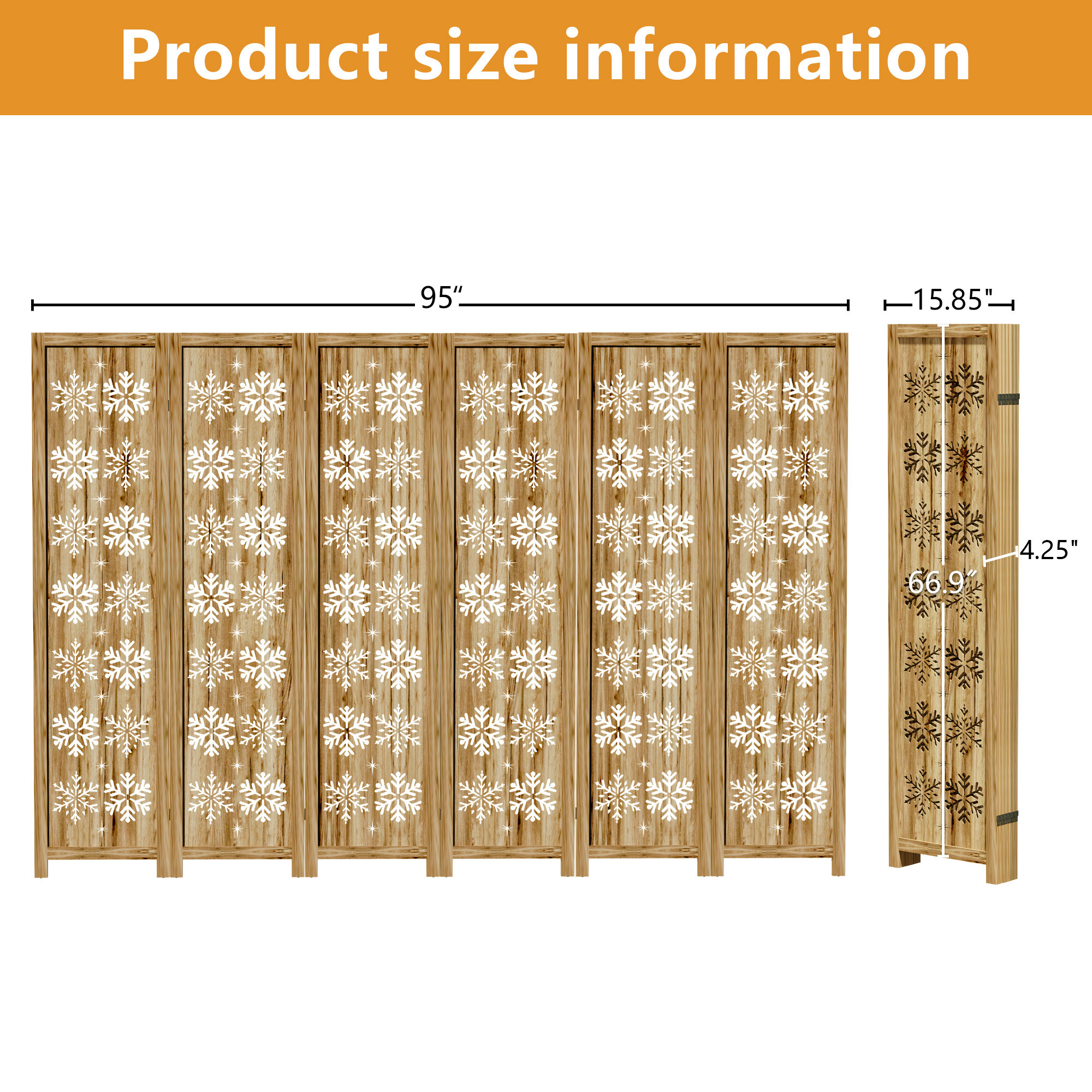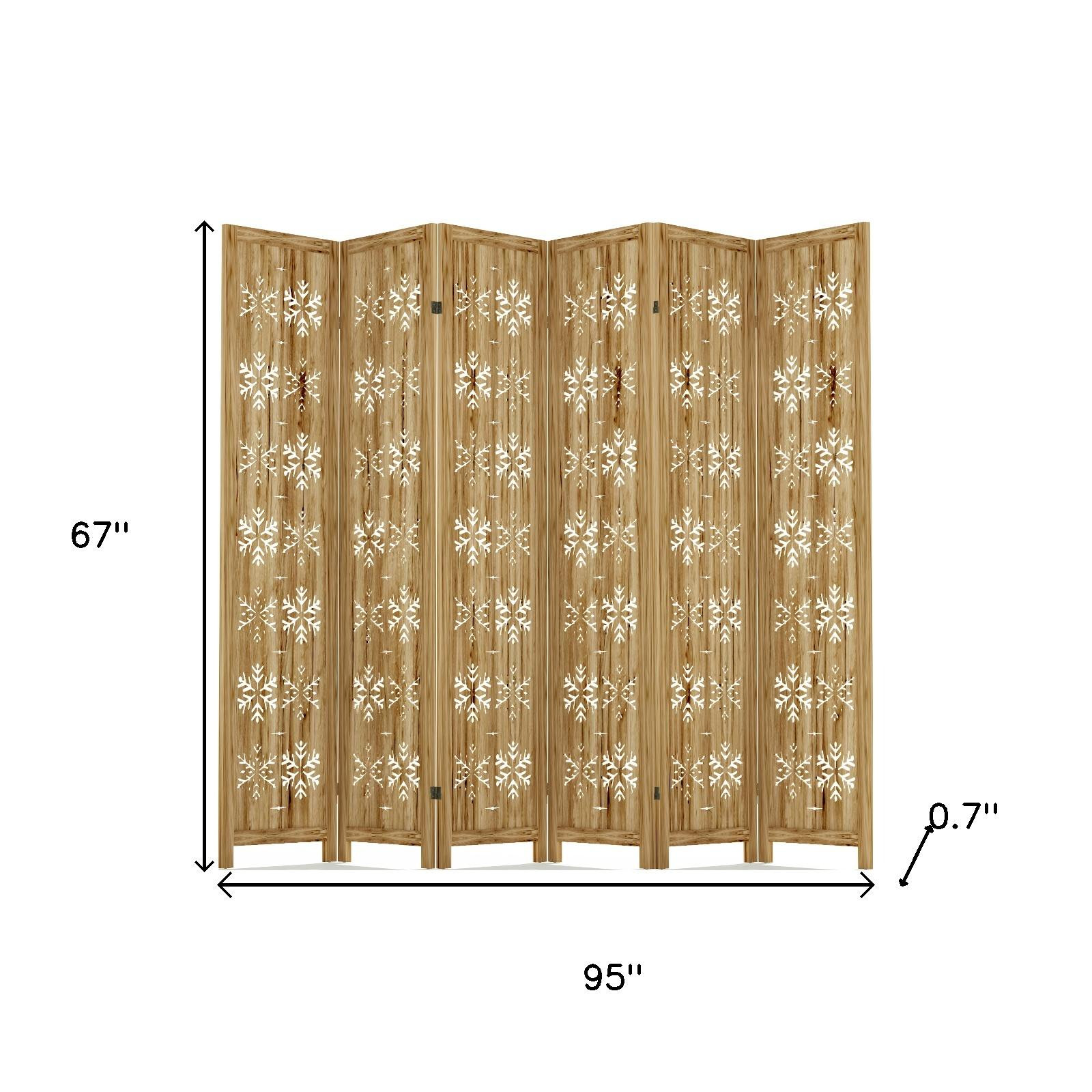The 67-inch brown wood six panel screen room divider elegantly enhances your living space. Crafted from durable wood, both the frame and screen materials exude a warm, natural aesthetic. Its opaque design provides ample privacy while still allowing for light to filter through. The reverse side features the same material, print, and finish as the front, ensuring a cohesive look from any angle. With six panels, this versatile piece can effortlessly define areas in your home, making it ideal for creating distinct zones in open spaces. Its rich brown finish adds a touch of sophistication, seamlessly blending with various decor styles while serving as a functional and stylish addition to your interior. 67.00-inch h x 95.00-inch w x 0.70-inch d.