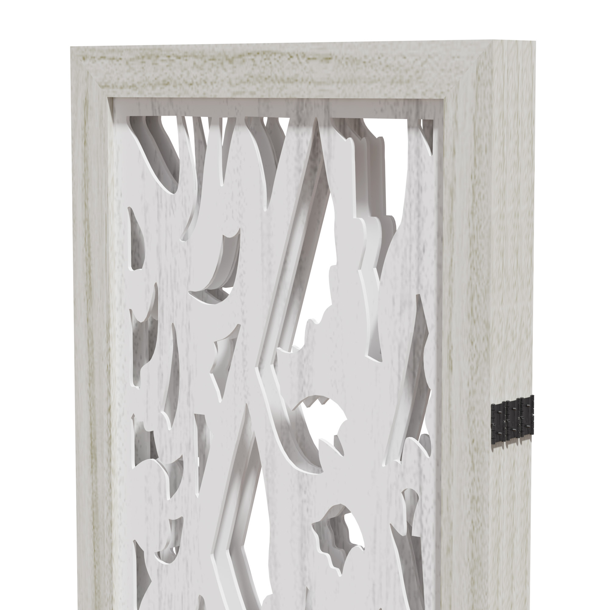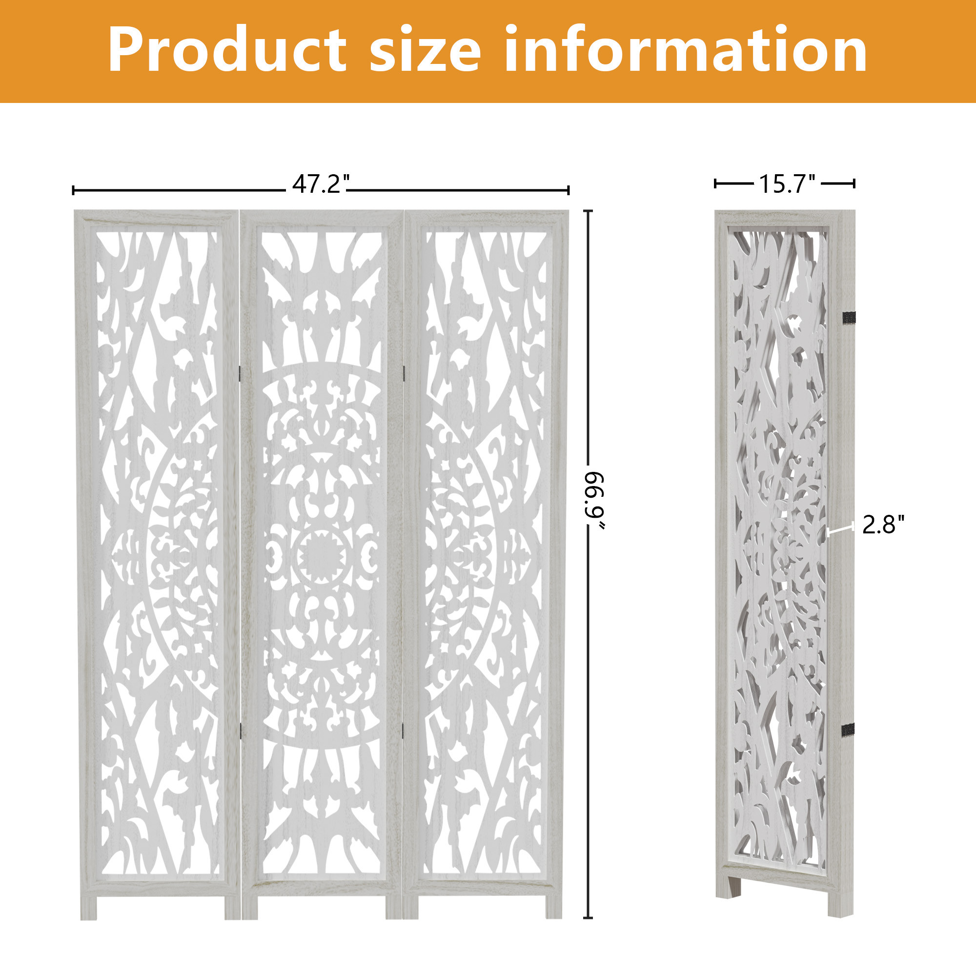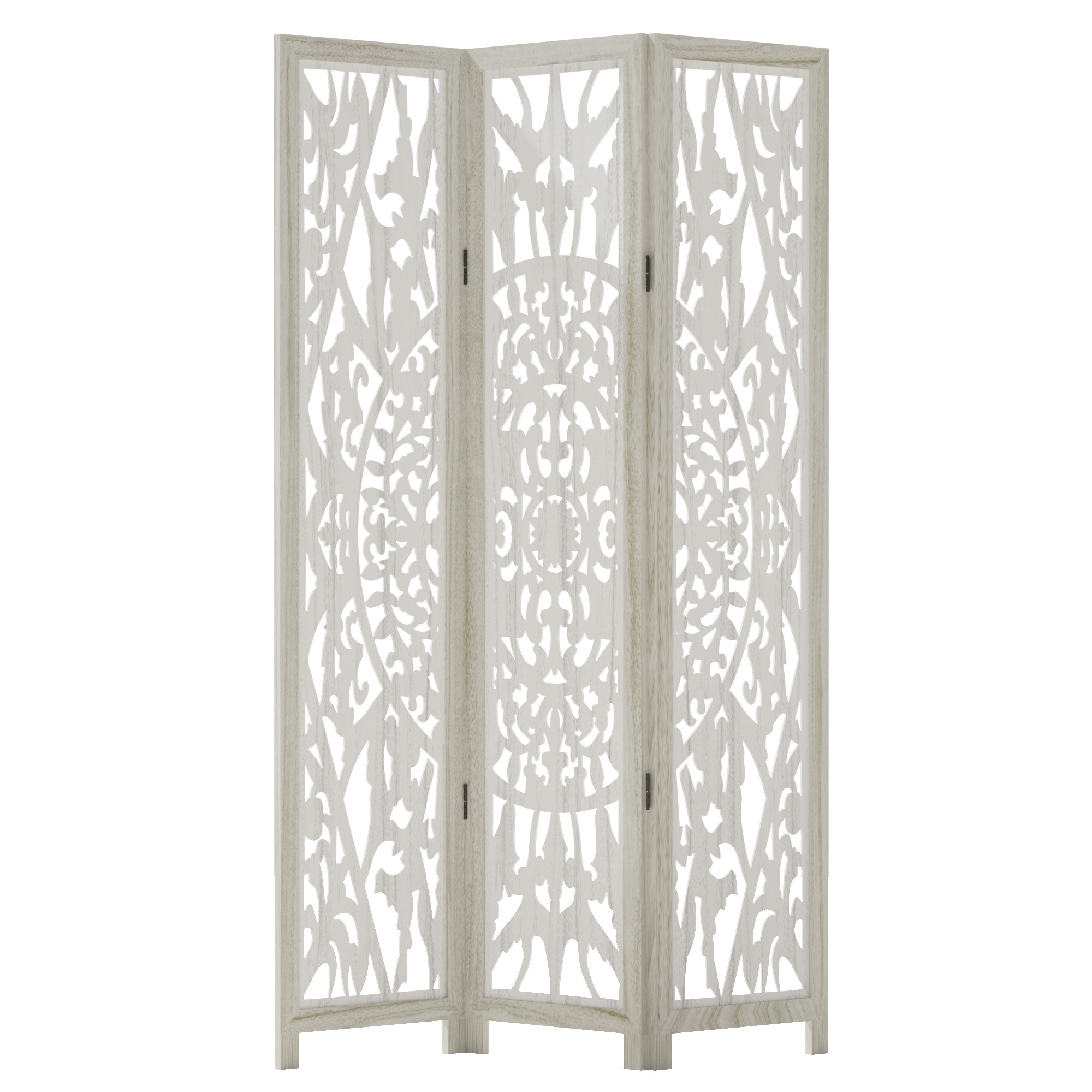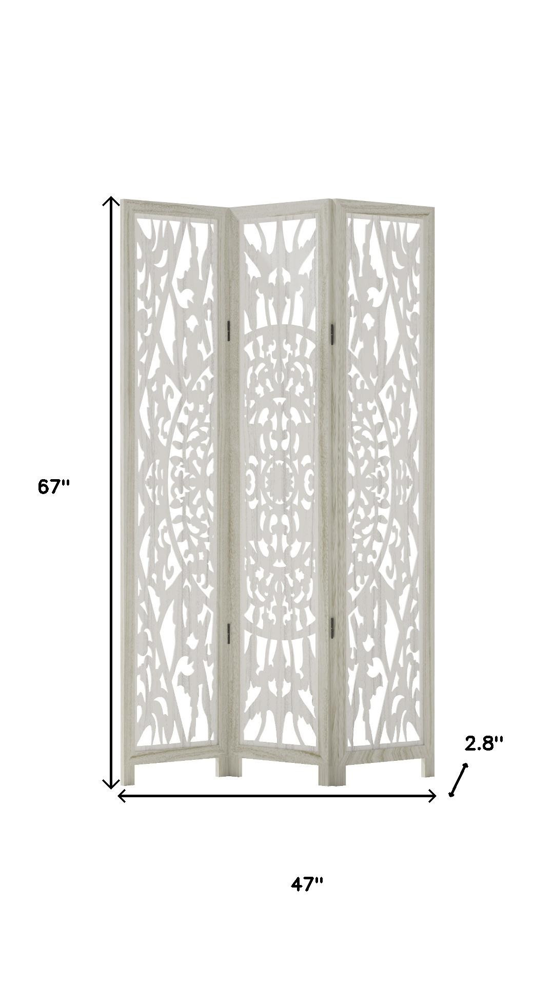 The 67-inch white wood three panel screen room divider is a stylish solution for creating distinct spaces in your home. Crafted from durable wood, this room divider offers an elegant and sophisticated touch to any decor. Its opaque design ensures privacy while maintaining a chic look, making it ideal for both living areas and bedrooms. Each side features a beautiful finish that matches, providing a cohesive aesthetic whether viewed from the front or reverse. With three panels, this piece can be easily adjusted to fit various room layouts, making it versatile for your changing needs. Enhance your interior design with this functional and attractive room divider that effectively blends style with practicality. 67.00-inch h x 47.00-inch w x 2.80-inch d.