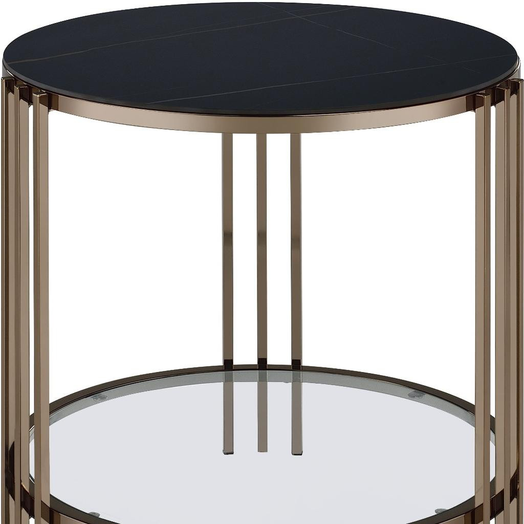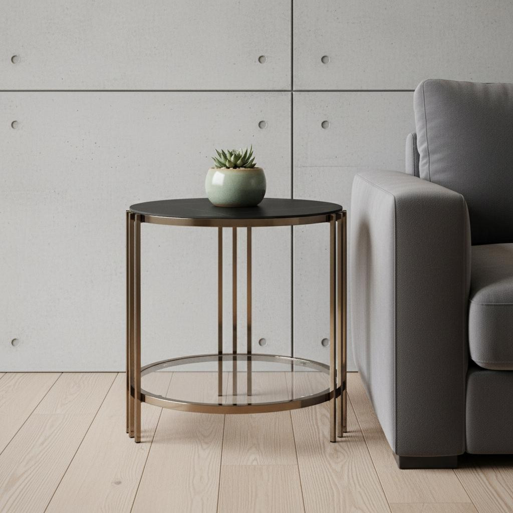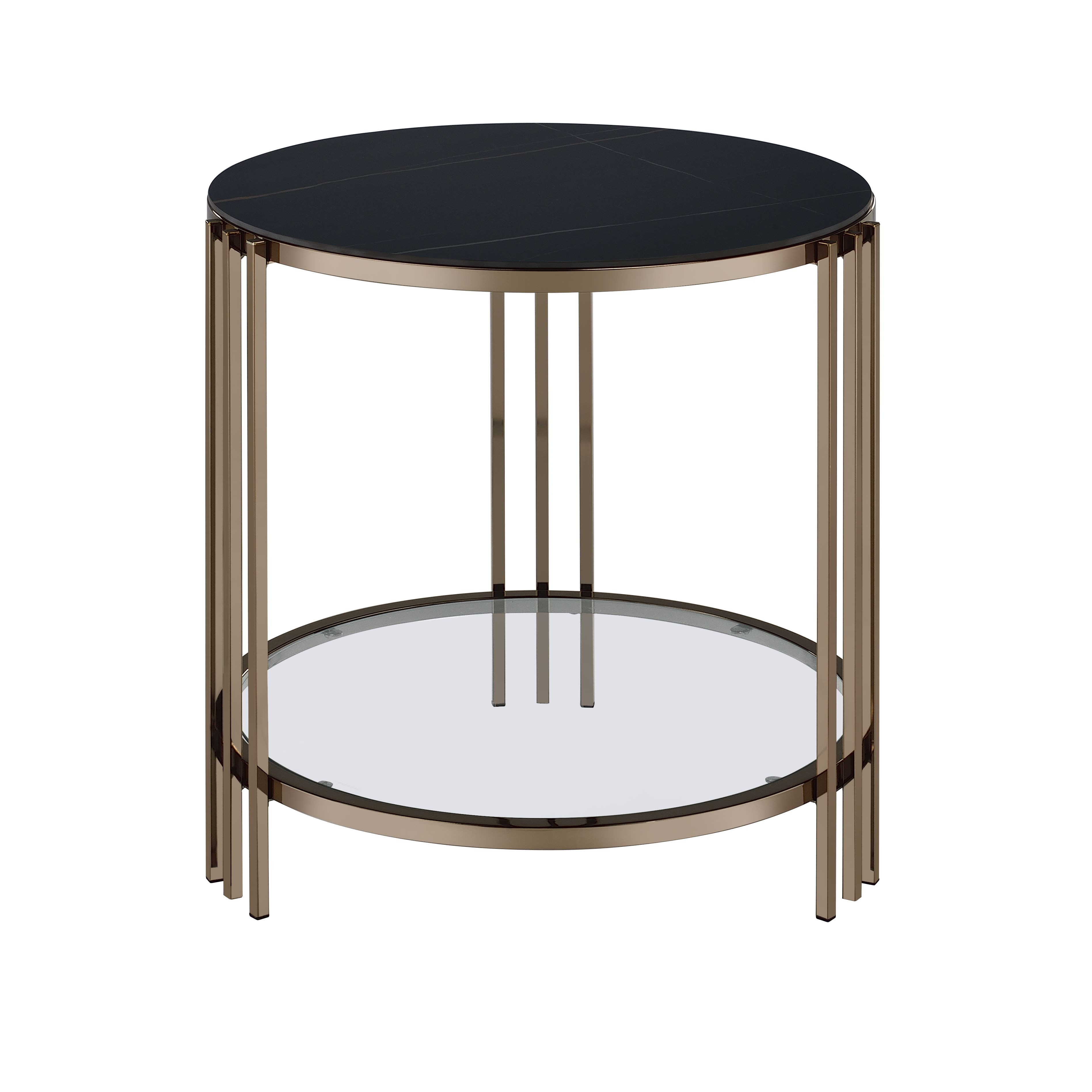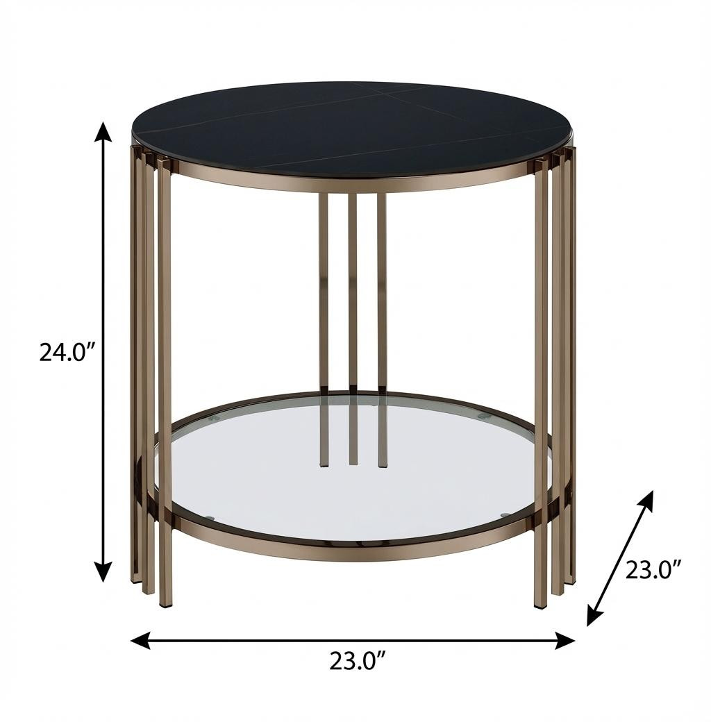 Show off your exquisite taste with this 24-inch black and champagne stone and metal round end table with shelf. The base of this table is made from metal in a champagne color that is a nice contrast to the black stone tabletop. Includes a single shelf for handy storage or display space. Side tables are a great way to flank your sofa, use as an accent next to your favorite chair, or can even be used bedside. You can also use it as an entryway table to hold your keys. 24.00-inch h x 23.00-inch w x 23.00-inch d.