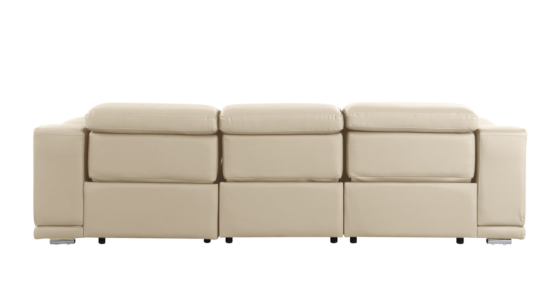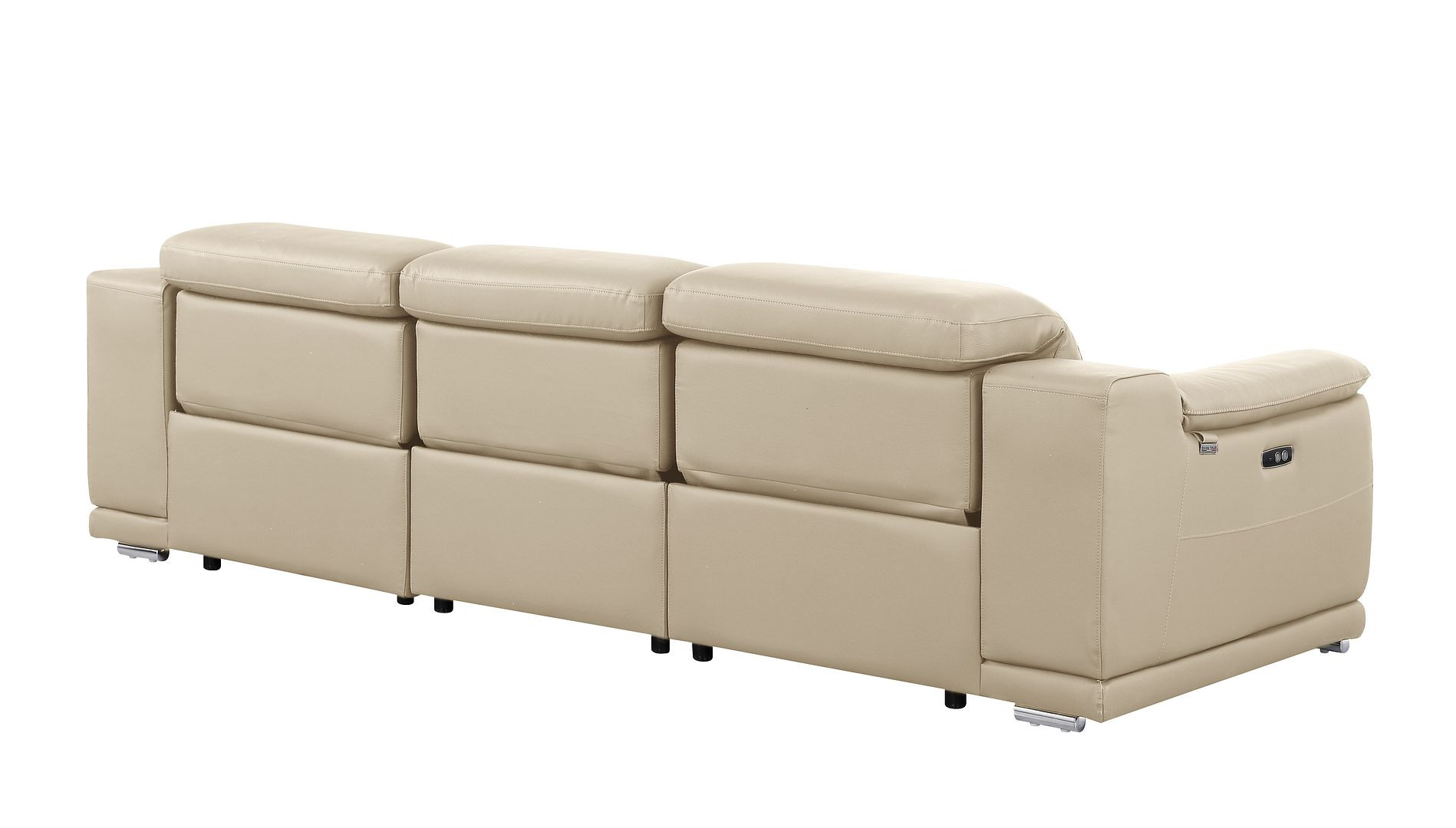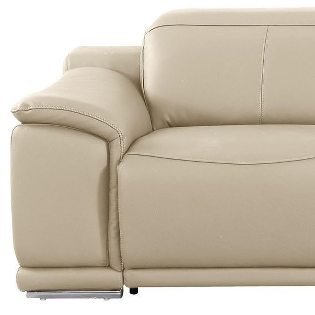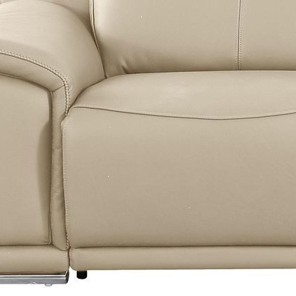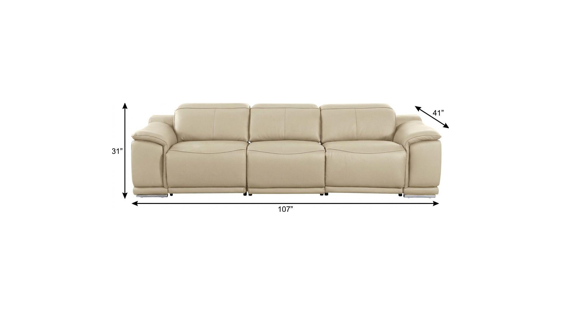 An interior designer's dream, this buttery soft high grade leather 107-inch beige italian leather reclining metal usb sofa will bring just the right touch to your space. The premium leather used makes your lounging luxuriously comfortable and adds an elegant appeal to your space. Solid colors give you lots of decorative options and are easy to work into your decor scheme. Pocket spring construction gives this piece strong support and makes it comfortable to sit even for long periods of time. Rolled arms offer a comfy place to rest. Silver stainless steel legs effortlessly elevate the room and add a touch of contemporary design. A great showpiece for your room, this sofa is a must have. 31.00-inch h x 107.00-inch w x 41.00-inch d.
