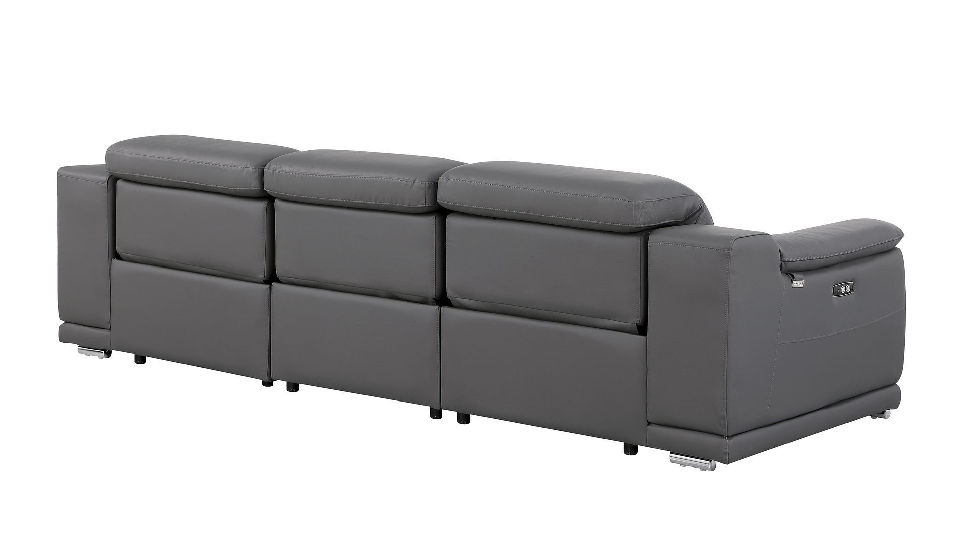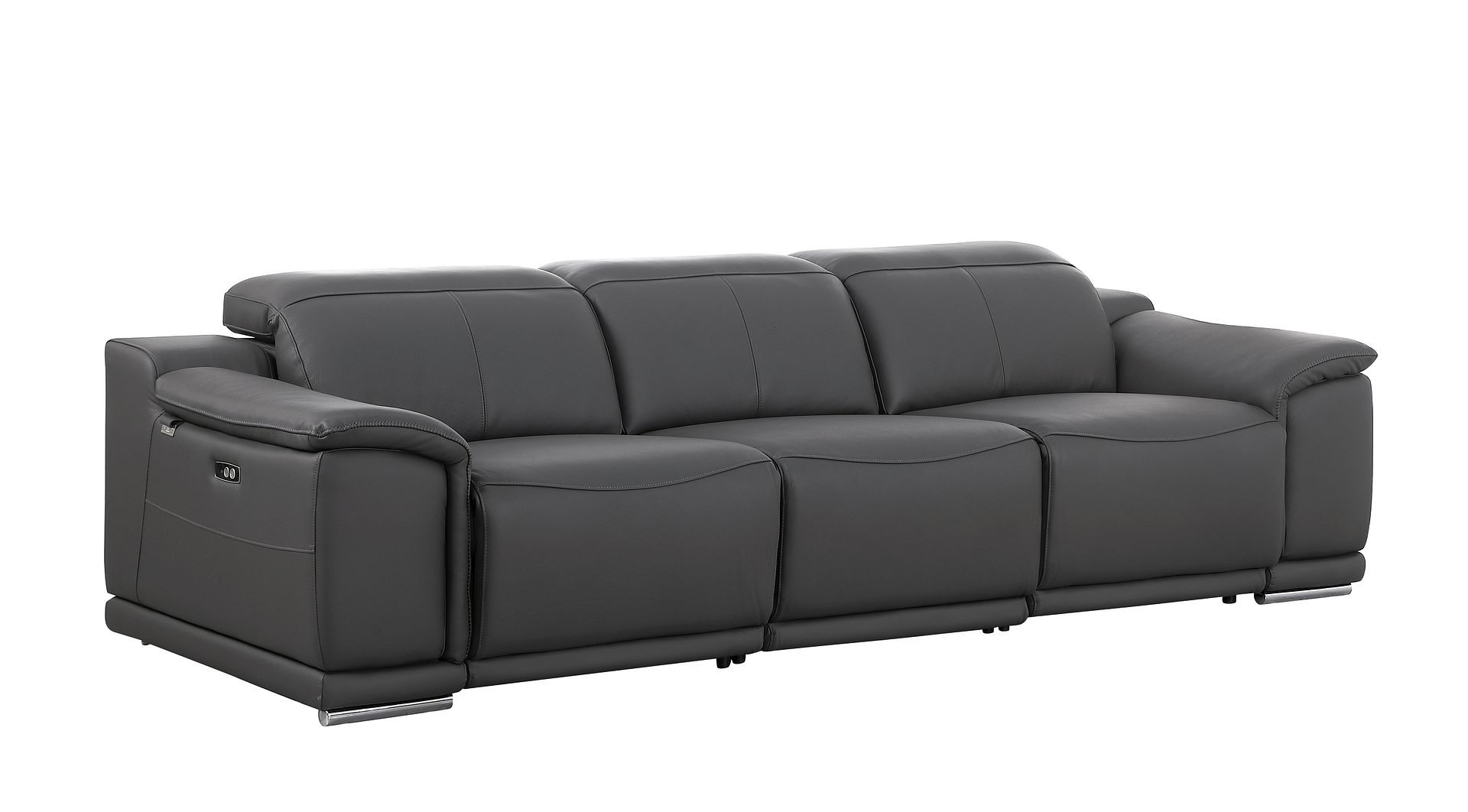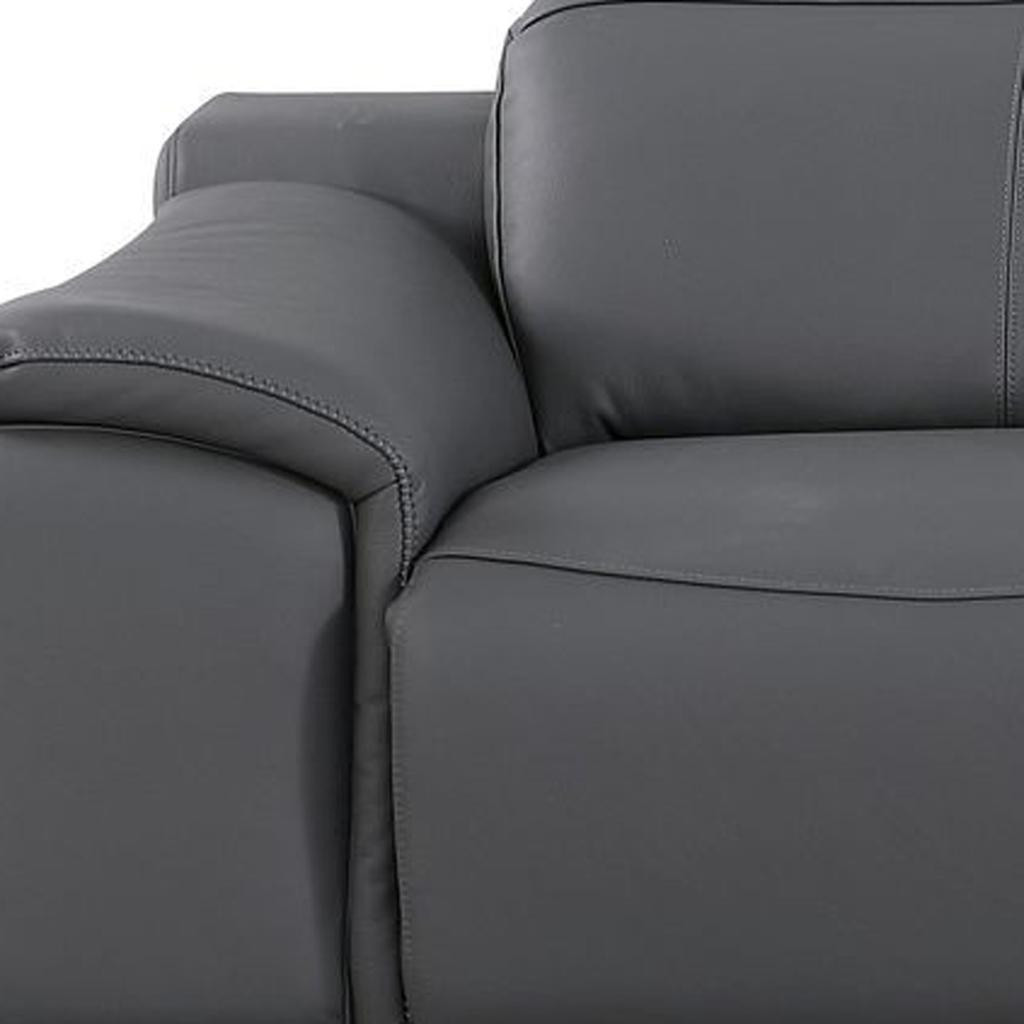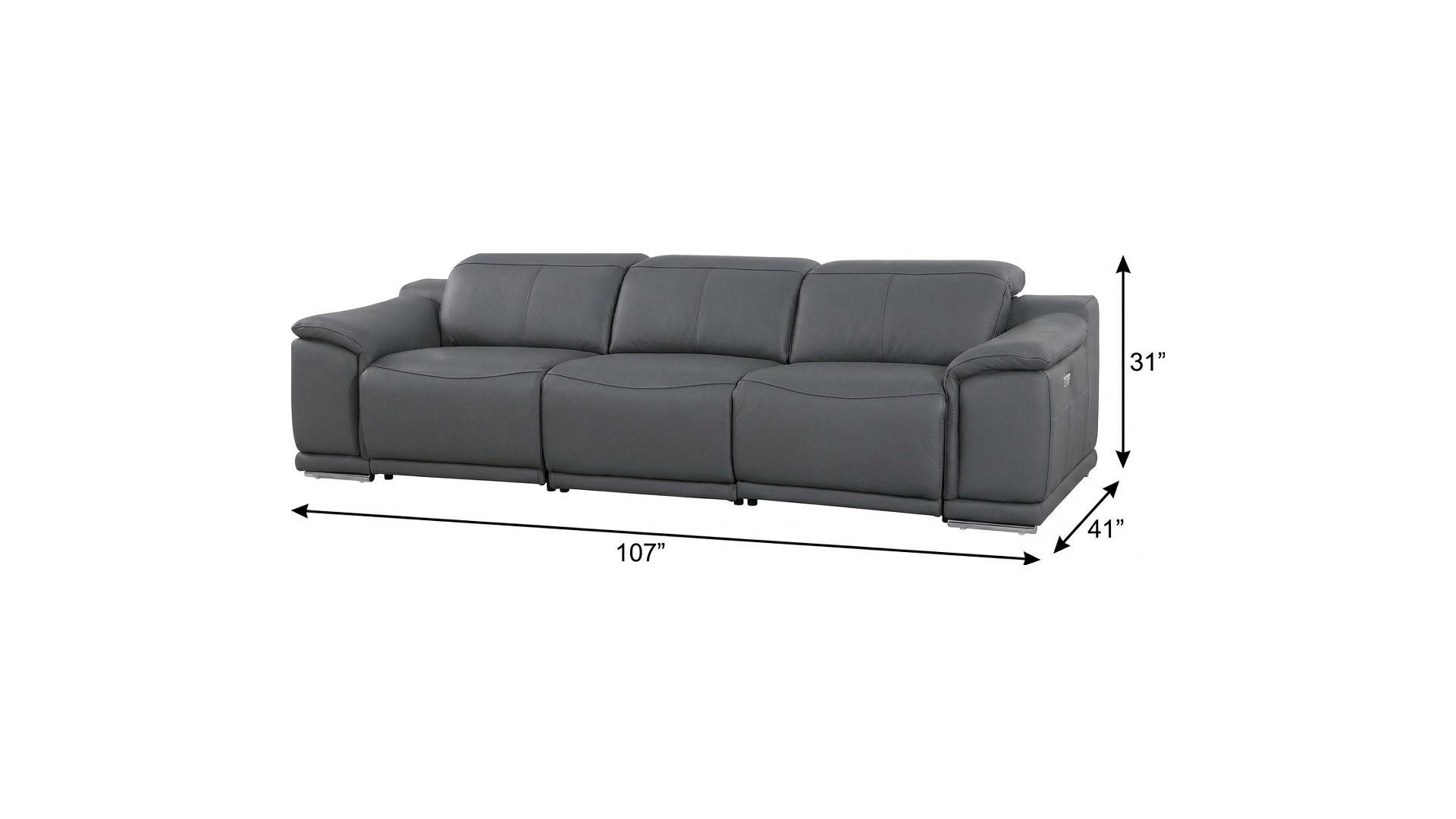 Made of the highest quality, supple leather, this 107-inch dark gray italian leather reclining metal usb sofa will be the star of your space. The high grade premium leather used makes your lounging luxuriously comfortable and adds an elegant appeal to your space. Solid colors give you lots of decorative options and are easy to work into your decor scheme. Pocket spring construction gives this piece strong support and makes it comfortable to sit even for long periods of time. Rolled arms offer a comfy place to rest. Silver stainless steel legs effortlessly elevate the room and add a touch of contemporary design. A great showpiece for your room, this sofa is a must have. 31.00-inch h x 107.00-inch w x 41.00-inch d.