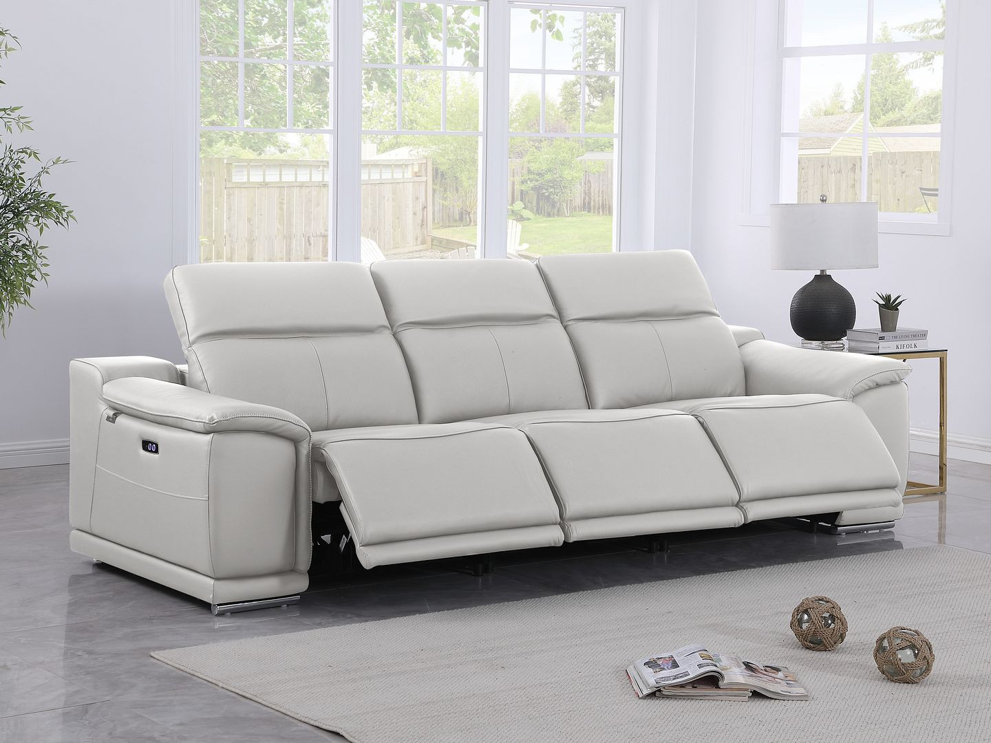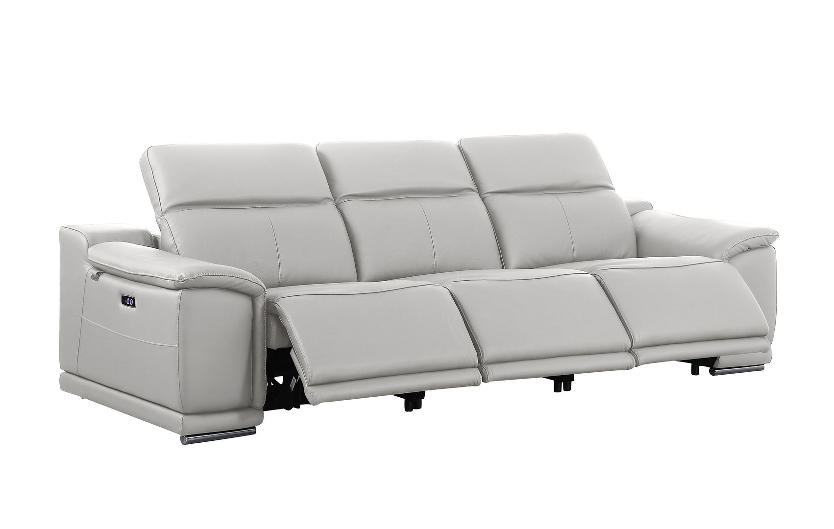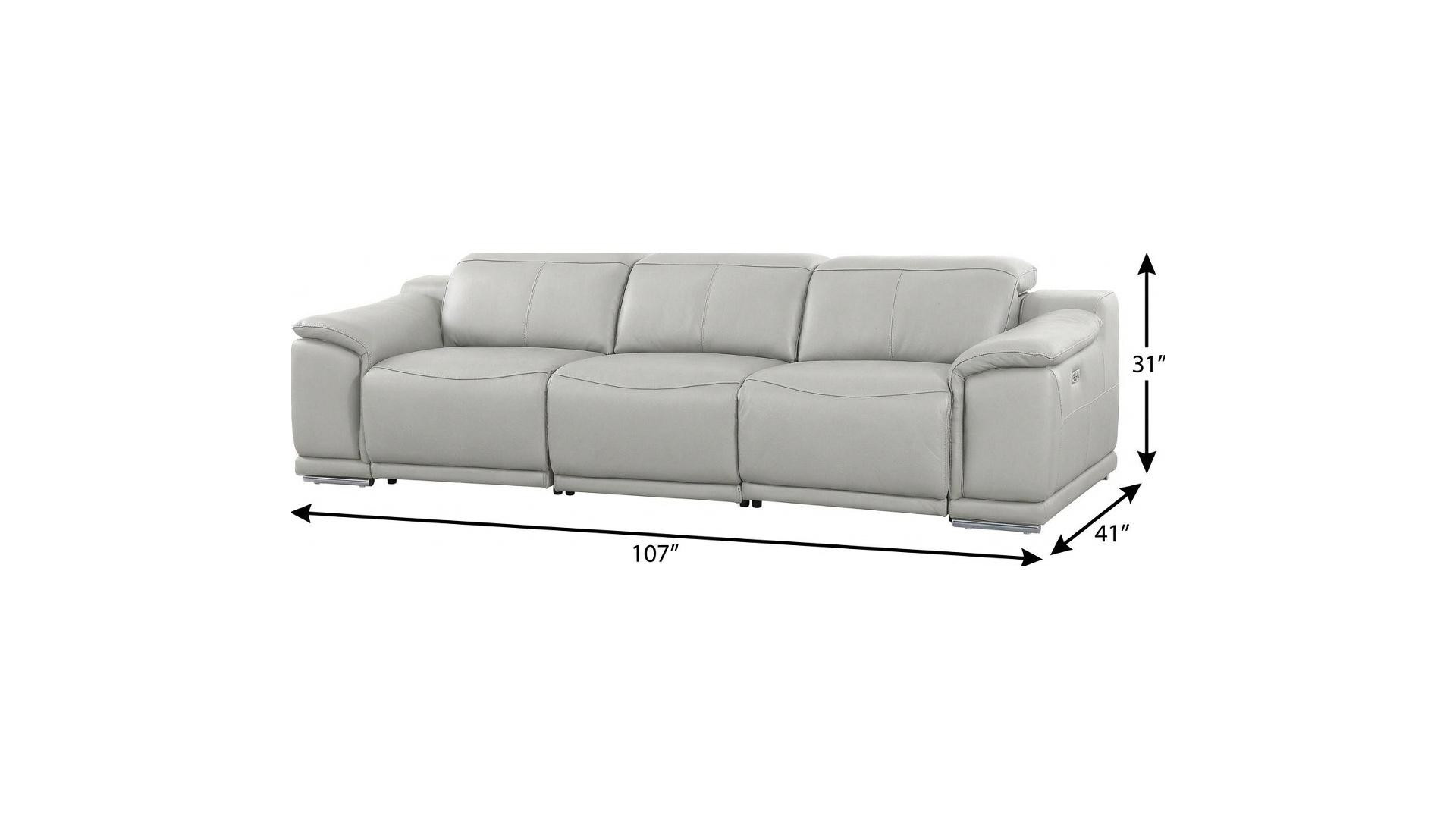 Made of the highest quality, supple leather, this 107-inch light gray italian leather reclining metal usb sofa will be the star of your space. The high grade premium leather used makes your lounging luxuriously comfortable and adds an elegant appeal to your space. Solid colors give you lots of decorative options and are easy to work into your decor scheme. Pocket spring construction gives this piece strong support and makes it comfortable to sit even for long periods of time. Rolled arms offer a comfy place to rest. Silver stainless steel legs effortlessly elevate the room and add a touch of contemporary design. A great showpiece for your room, this sofa is a must have. 31.00-inch h x 107.00-inch w x 41.00-inch d.