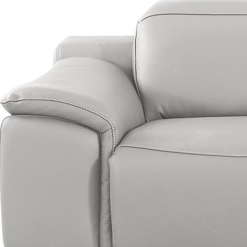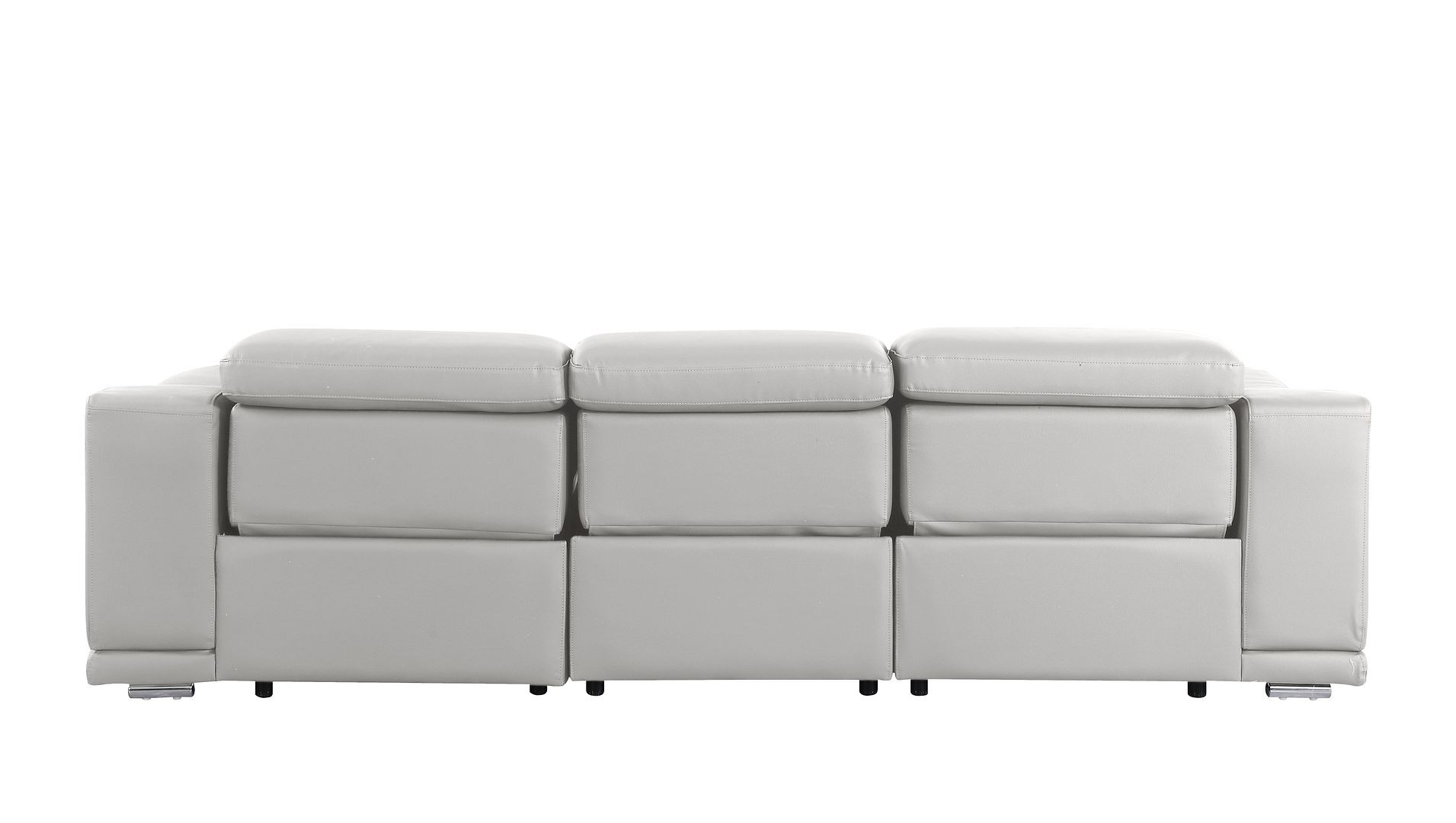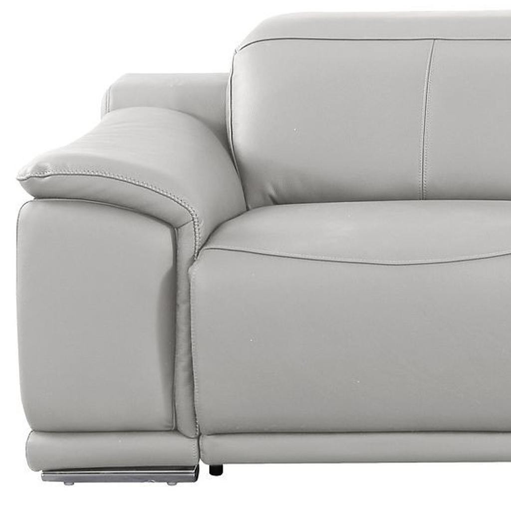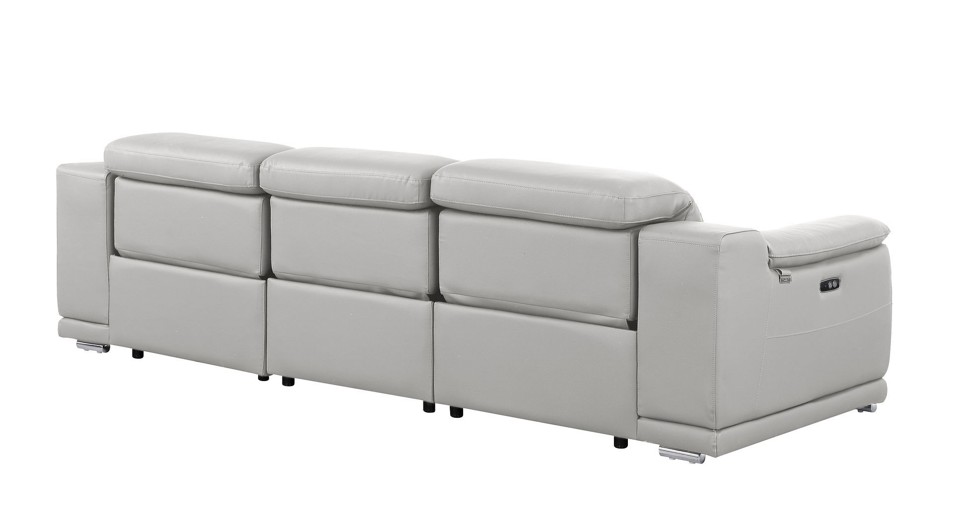 Made of the highest quality, supple leather, this 107-inch light gray italian leather reclining metal usb sofa will be the star of your space. The high grade premium leather used makes your lounging luxuriously comfortable and adds an elegant appeal to your space. Solid colors give you lots of decorative options and are easy to work into your decor scheme. Pocket spring construction gives this piece strong support and makes it comfortable to sit even for long periods of time. Rolled arms offer a comfy place to rest. Silver stainless steel legs effortlessly elevate the room and add a touch of contemporary design. A great showpiece for your room, this sofa is a must have. 31.00-inch h x 107.00-inch w x 41.00-inch d.