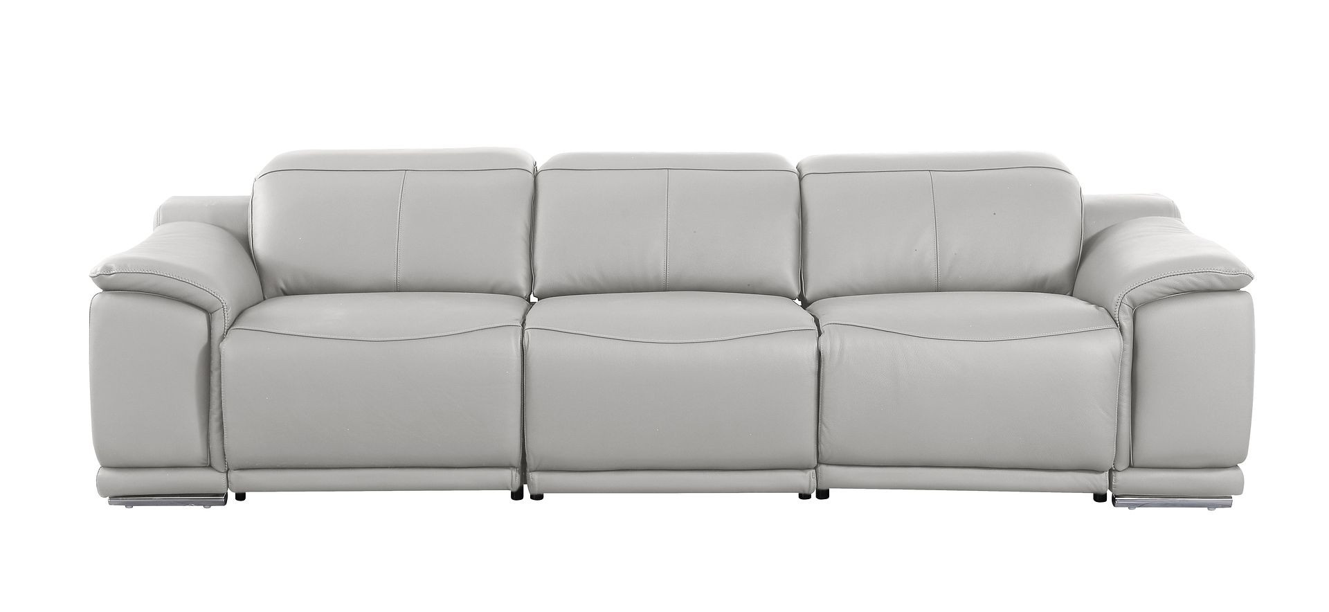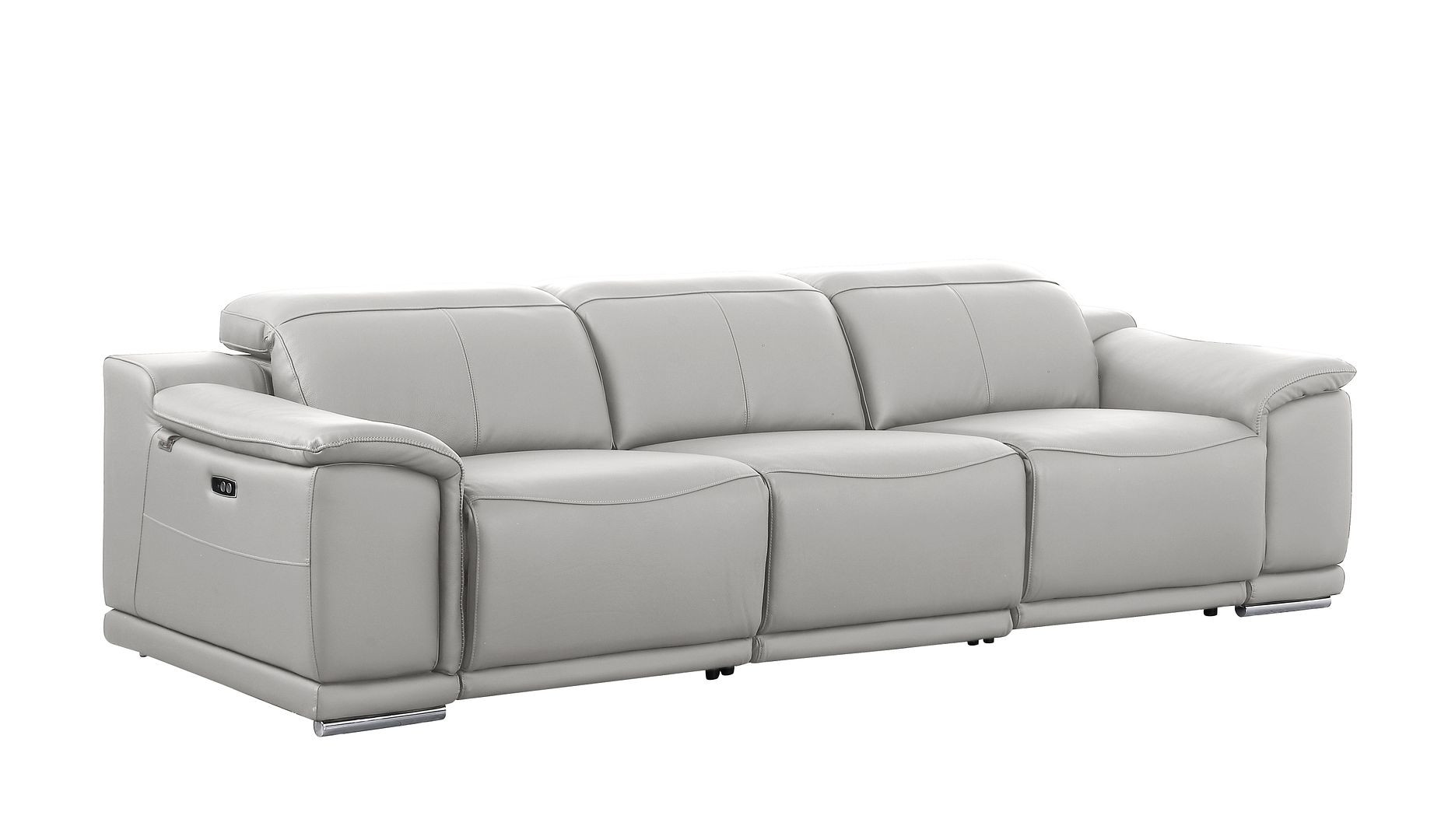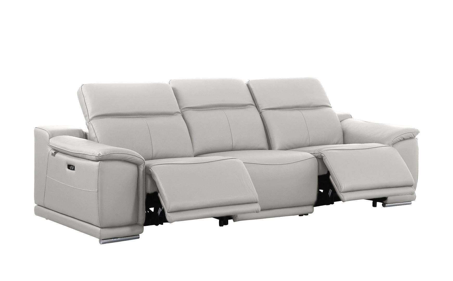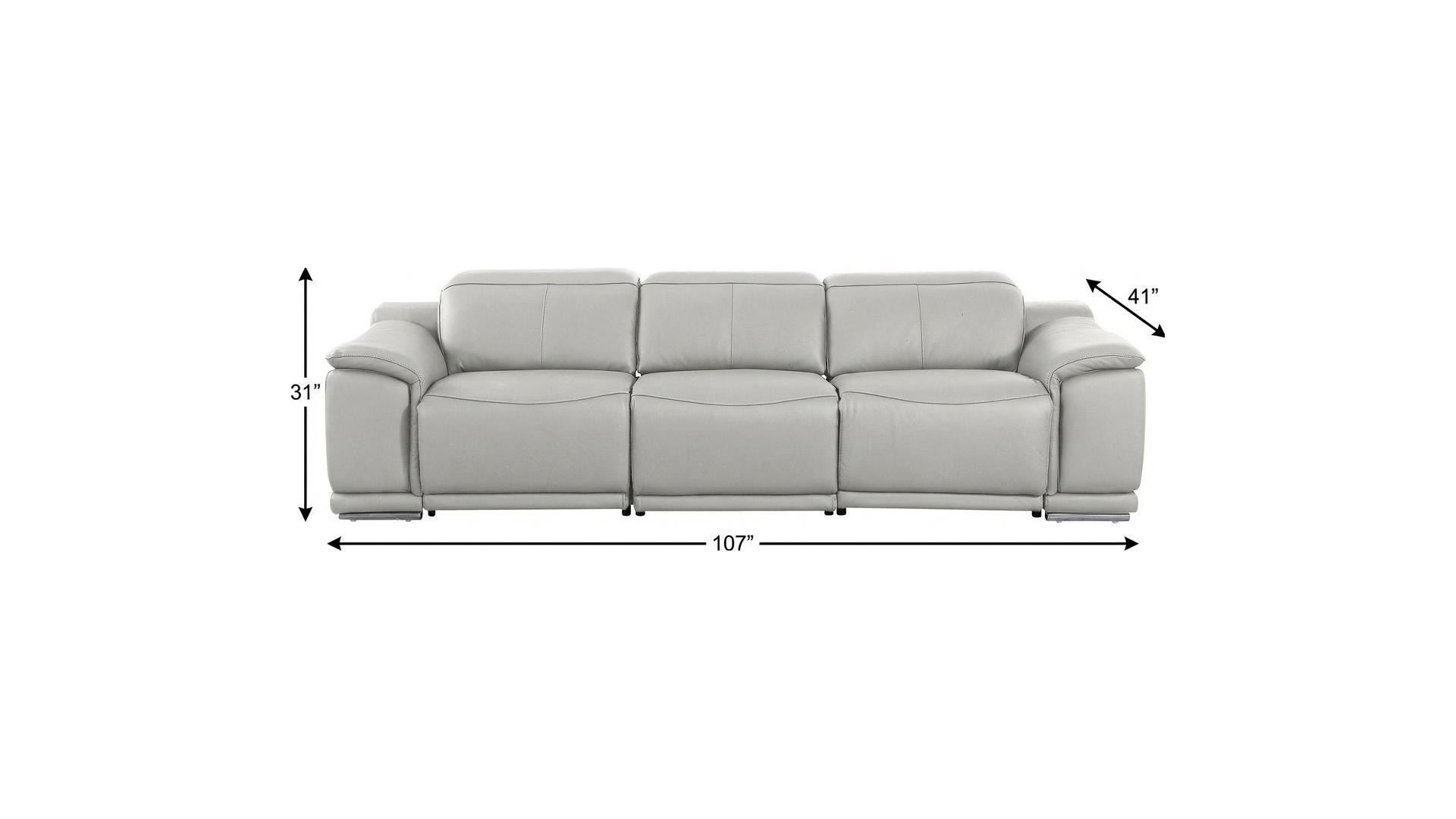 Superior construction from fabulously soft and high grade leather gives this 107-inch light gray italian leather reclining metal usb sofa a leg up on the competition. The premium leather used makes your lounging luxuriously comfortable and adds an elegant appeal to your space. Solid colors give you lots of decorative options and are easy to work into your decor scheme. Pocket spring construction gives this piece strong support and makes it comfortable to sit even for long periods of time. Rolled arms offer a comfy place to rest. Silver stainless steel legs effortlessly elevate the room and add a touch of contemporary design. Built to last, this sofa will be a great centerpiece for your room. 31.00-inch h x 107.00-inch w x 41.00-inch d.