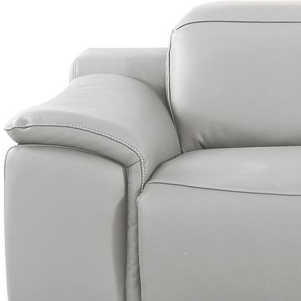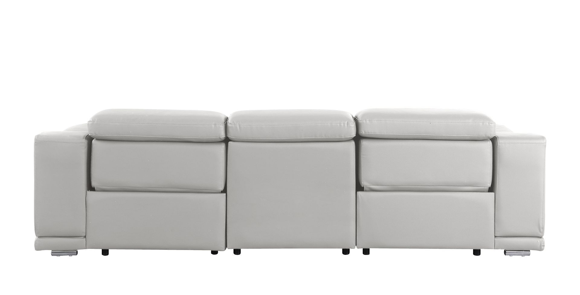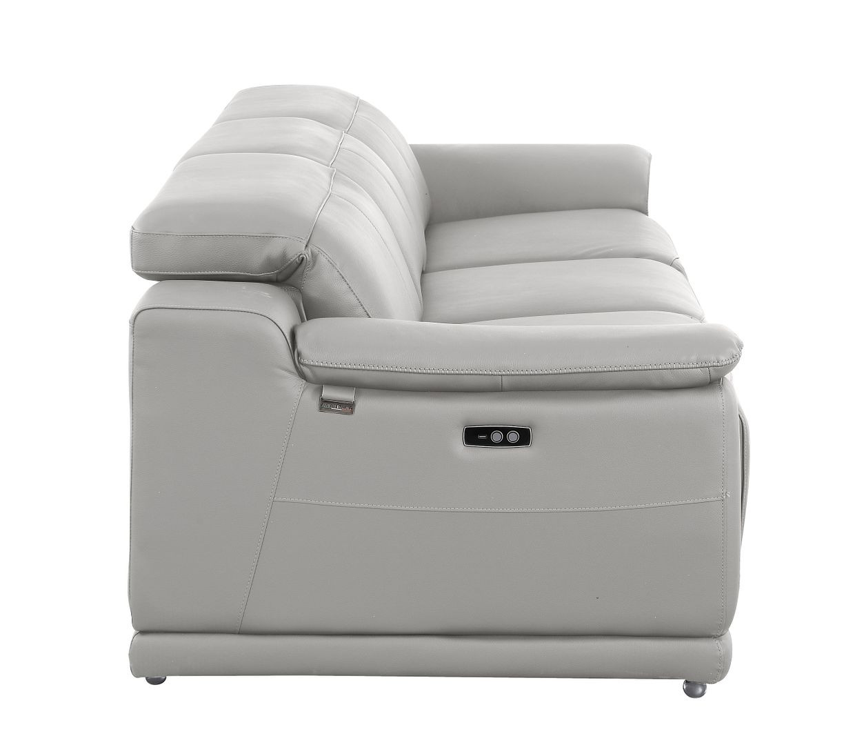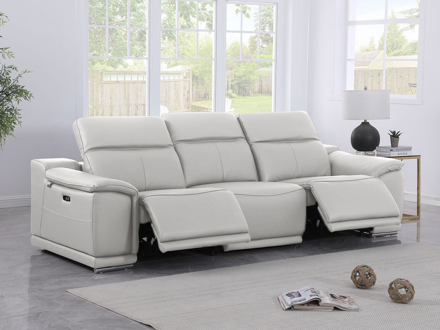 Superior construction from fabulously soft and high grade leather gives this 107-inch light gray italian leather reclining metal usb sofa a leg up on the competition. The premium leather used makes your lounging luxuriously comfortable and adds an elegant appeal to your space. Solid colors give you lots of decorative options and are easy to work into your decor scheme. Pocket spring construction gives this piece strong support and makes it comfortable to sit even for long periods of time. Rolled arms offer a comfy place to rest. Silver stainless steel legs effortlessly elevate the room and add a touch of contemporary design. Built to last, this sofa will be a great centerpiece for your room. 31.00-inch h x 107.00-inch w x 41.00-inch d.