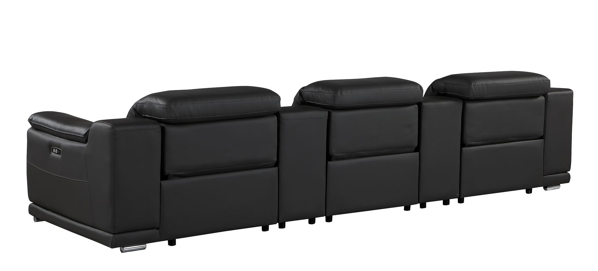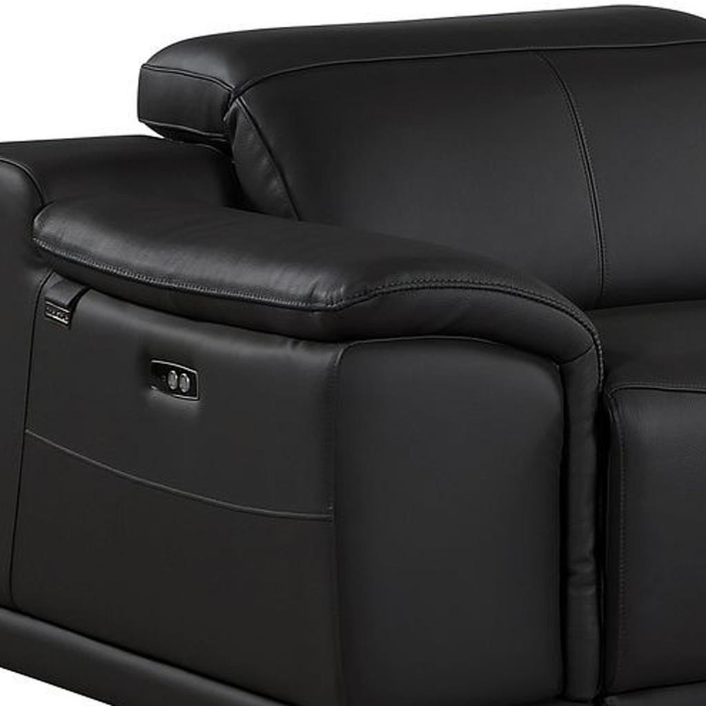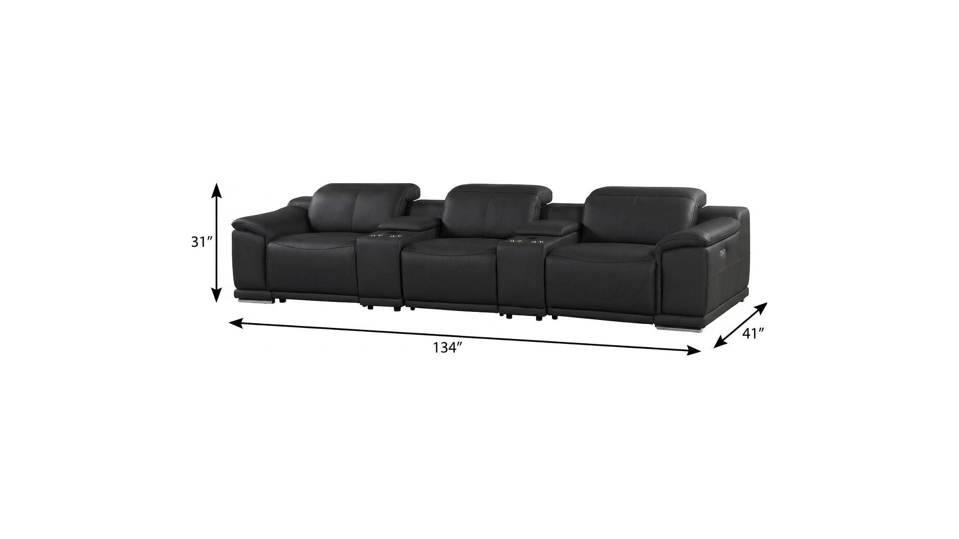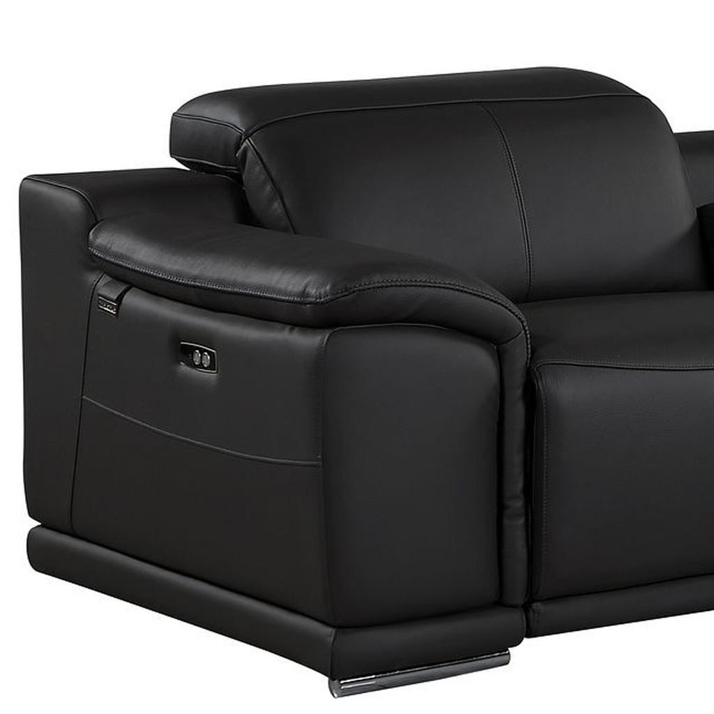 Made of the highest quality, supple leather, this 134-inch black italian leather reclining metal usb sofa will be the star of your space. The high grade premium leather used makes your lounging luxuriously comfortable and adds an elegant appeal to your space. Solid colors give you lots of decorative options and are easy to work into your decor scheme. Pocket spring construction gives this piece strong support and makes it comfortable to sit even for long periods of time. Rolled arms offer a comfy place to rest. Silver stainless steel legs effortlessly elevate the room and add a touch of contemporary design. Built to last, this sofa will be a great centerpiece for your room. 31.00-inch h x 134.00-inch w x 41.00-inch d.