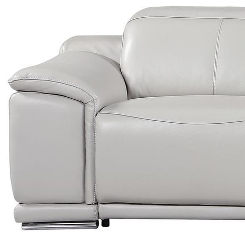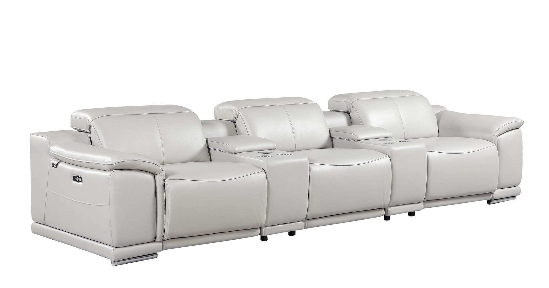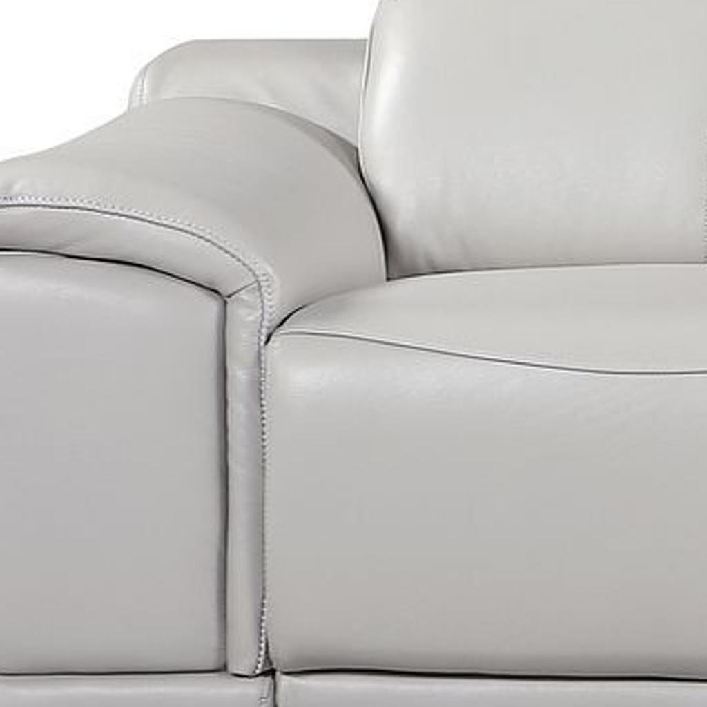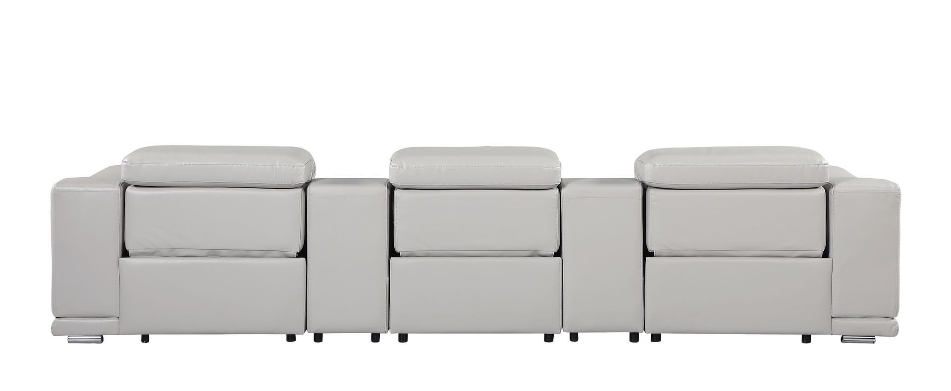 Superior construction from fabulously soft and high grade leather gives this 134-inch light gray italian leather reclining metal usb sofa a leg up on the competition. The premium leather used makes your lounging luxuriously comfortable and adds an elegant appeal to your space. Solid colors give you lots of decorative options and are easy to work into your decor scheme. Pocket spring construction gives this piece strong support and makes it comfortable to sit even for long periods of time. Rolled arms offer a comfy place to rest. Silver stainless steel legs effortlessly elevate the room and add a touch of contemporary design. Built to last, this sofa will be a great centerpiece for your room. 31.00-inch h x 134.00-inch w x 41.00-inch d.