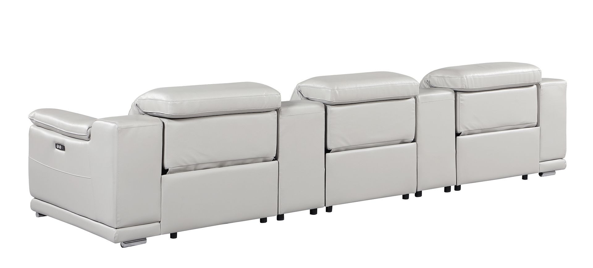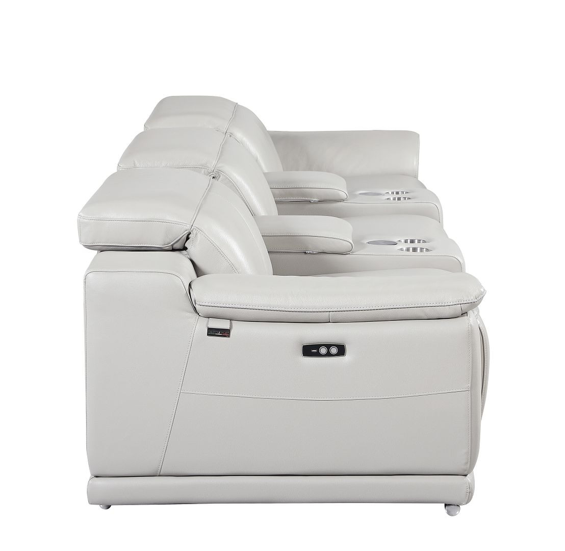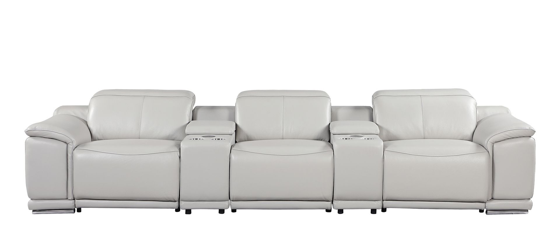 Superior construction from fabulously soft and high grade leather gives this 134-inch light gray italian leather reclining metal usb sofa a leg up on the competition. The premium leather used makes your lounging luxuriously comfortable and adds an elegant appeal to your space. Solid colors give you lots of decorative options and are easy to work into your decor scheme. Pocket spring construction gives this piece strong support and makes it comfortable to sit even for long periods of time. Rolled arms offer a comfy place to rest. Silver stainless steel legs effortlessly elevate the room and add a touch of contemporary design. Built to last, this sofa will be a great centerpiece for your room. 31.00-inch h x 134.00-inch w x 41.00-inch d.