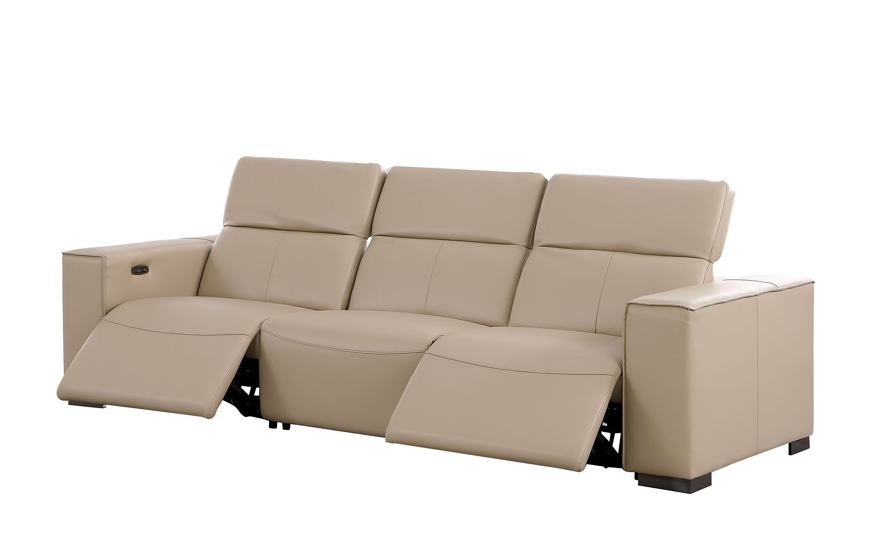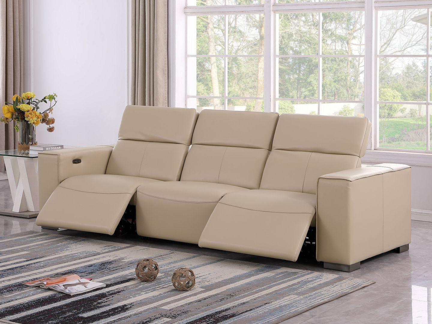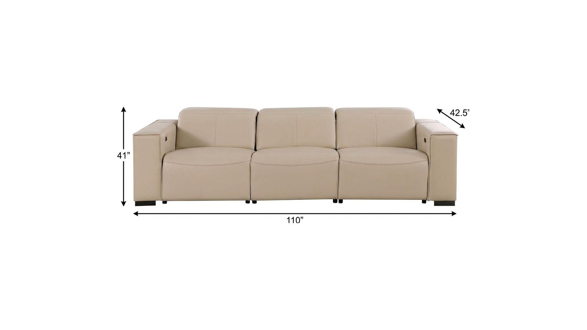 Superior construction from fabulously soft and high grade leather gives this 110-inch beige top grain leather reclining metal usb sofa a leg up on the competition. The premium leather used makes your lounging luxuriously comfortable and adds an elegant appeal to your space. Solid colors give you lots of decorative options and are easy to work into your decor scheme. Pocket spring construction gives this piece strong support and makes it comfortable to sit even for long periods of time. Square arms offer a comfy place to rest. Brown stainless steel legs effortlessly elevate the room and add a touch of contemporary design. A great showpiece for your room, this sofa is a must have. 41.00-inch h x 110.00-inch w x 42.50-inch d.