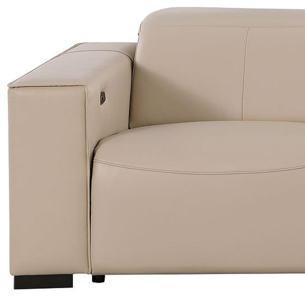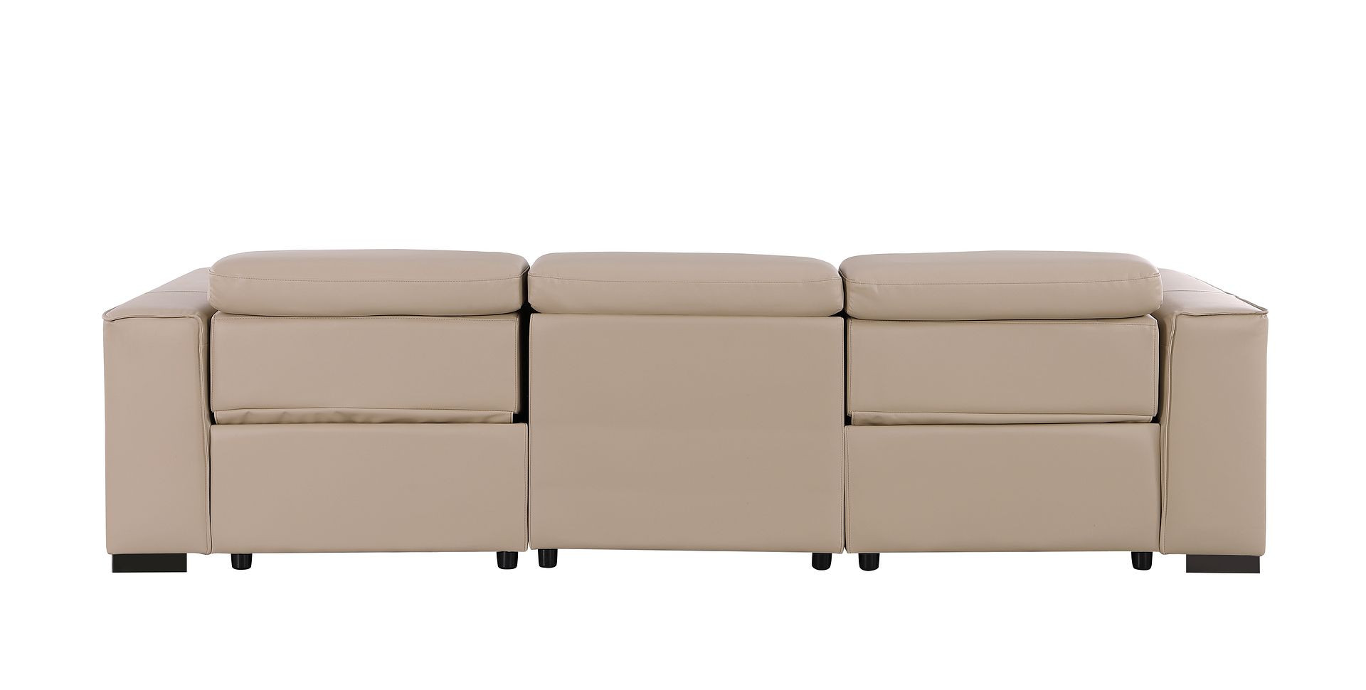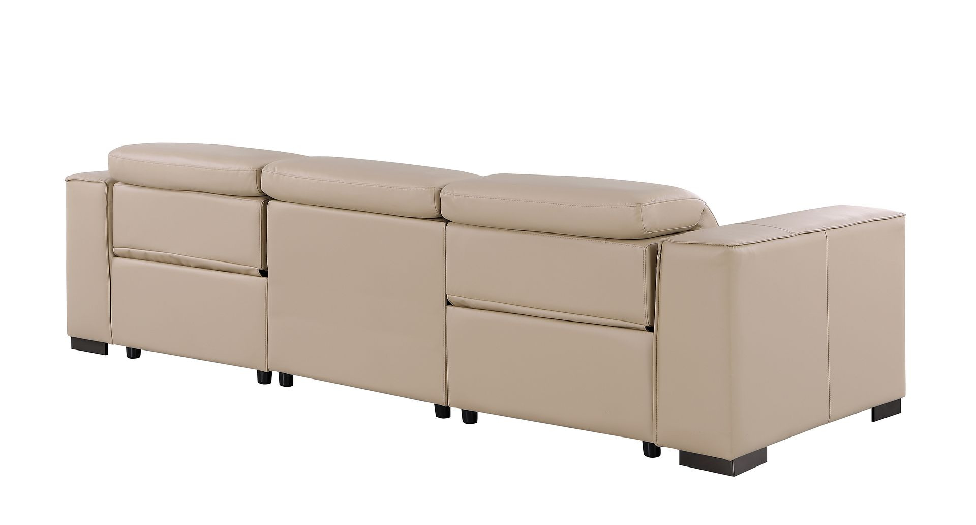 Superior construction from fabulously soft and high grade leather gives this 110-inch beige top grain leather reclining metal usb sofa a leg up on the competition. The premium leather used makes your lounging luxuriously comfortable and adds an elegant appeal to your space. Solid colors give you lots of decorative options and are easy to work into your decor scheme. Pocket spring construction gives this piece strong support and makes it comfortable to sit even for long periods of time. Square arms offer a comfy place to rest. Brown stainless steel legs effortlessly elevate the room and add a touch of contemporary design. A great showpiece for your room, this sofa is a must have. 41.00-inch h x 110.00-inch w x 42.50-inch d.