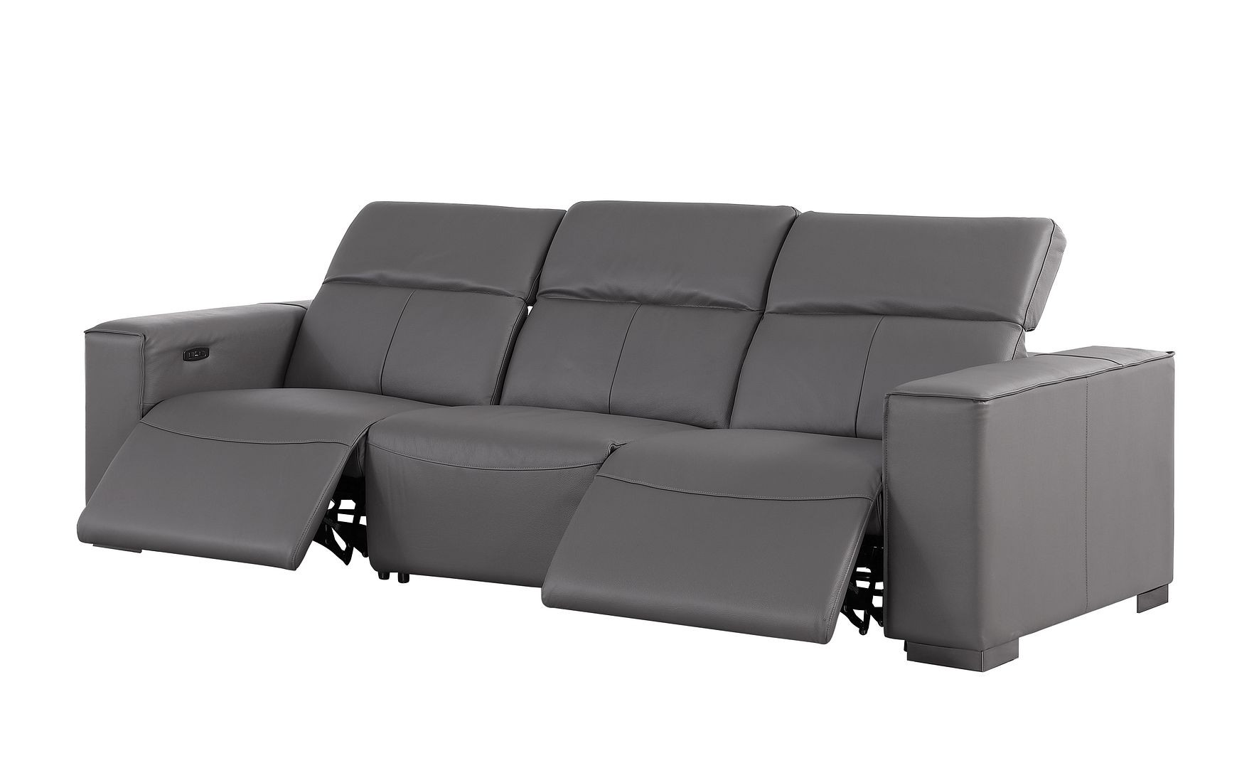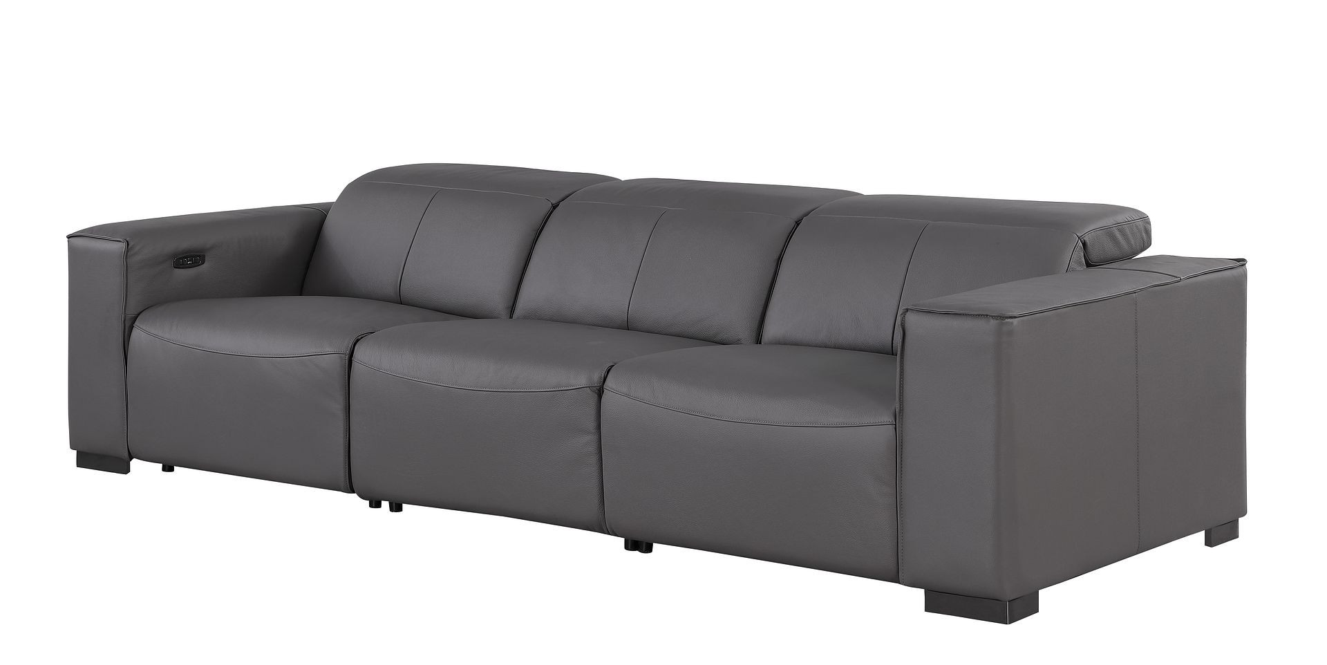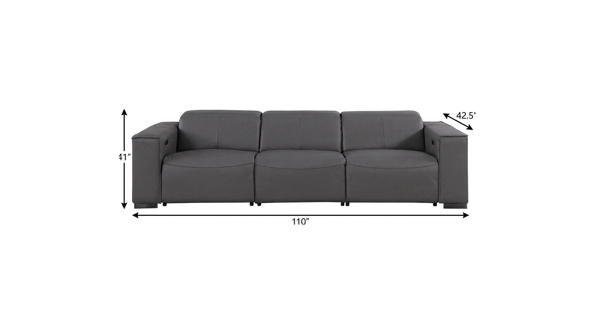 Made of the highest quality, supple leather, this 110-inch dark gray top grain leather reclining metal usb sofa will be the star of your space. The high grade premium leather used makes your lounging luxuriously comfortable and adds an elegant appeal to your space. Solid colors give you lots of decorative options and are easy to work into your decor scheme. Pocket spring construction gives this piece strong support and makes it comfortable to sit even for long periods of time. Square arms offer a comfy place to rest. Brown stainless steel legs effortlessly elevate the room and add a touch of contemporary design. A great showpiece for your room, this sofa is a must have. 41.00-inch h x 110.00-inch w x 42.50-inch d.
