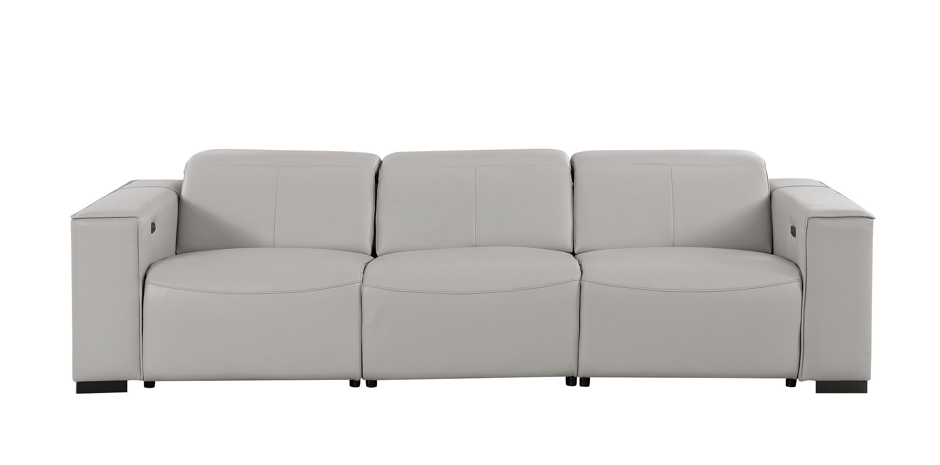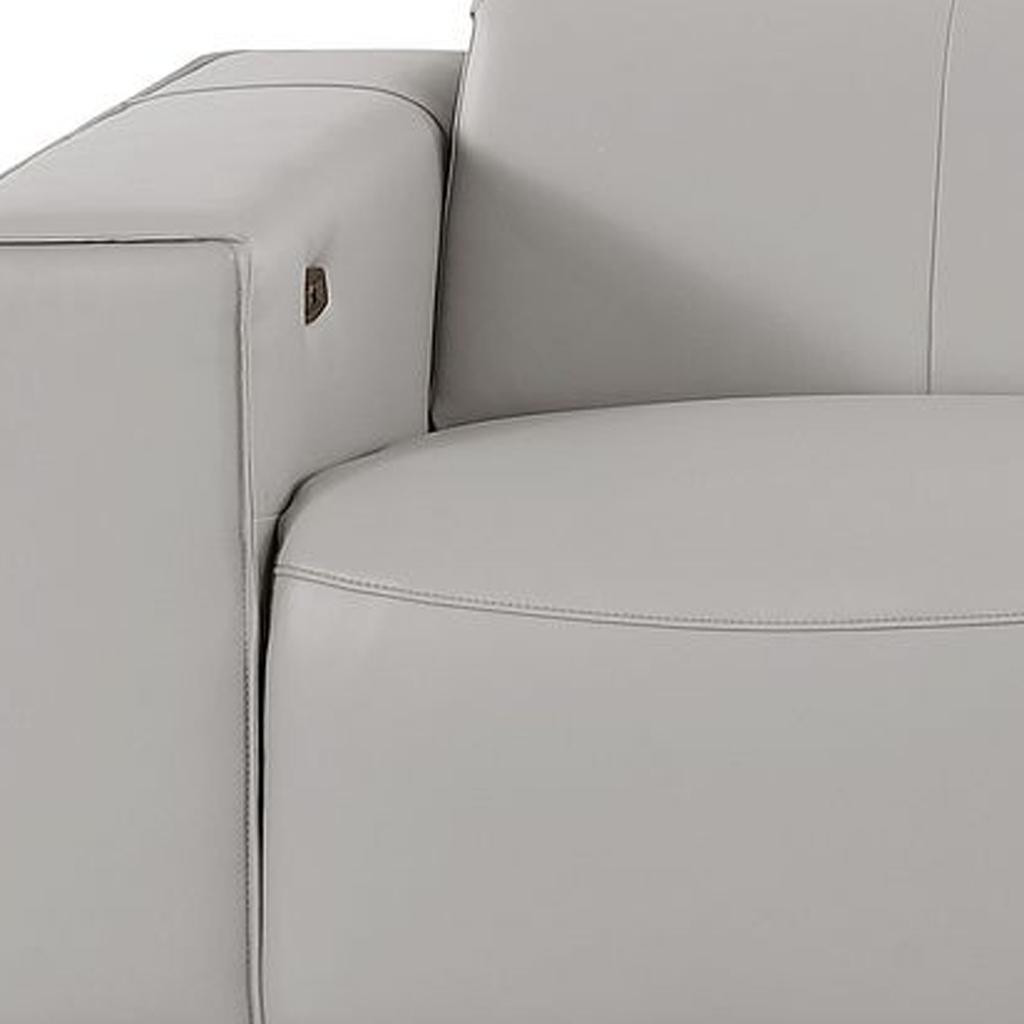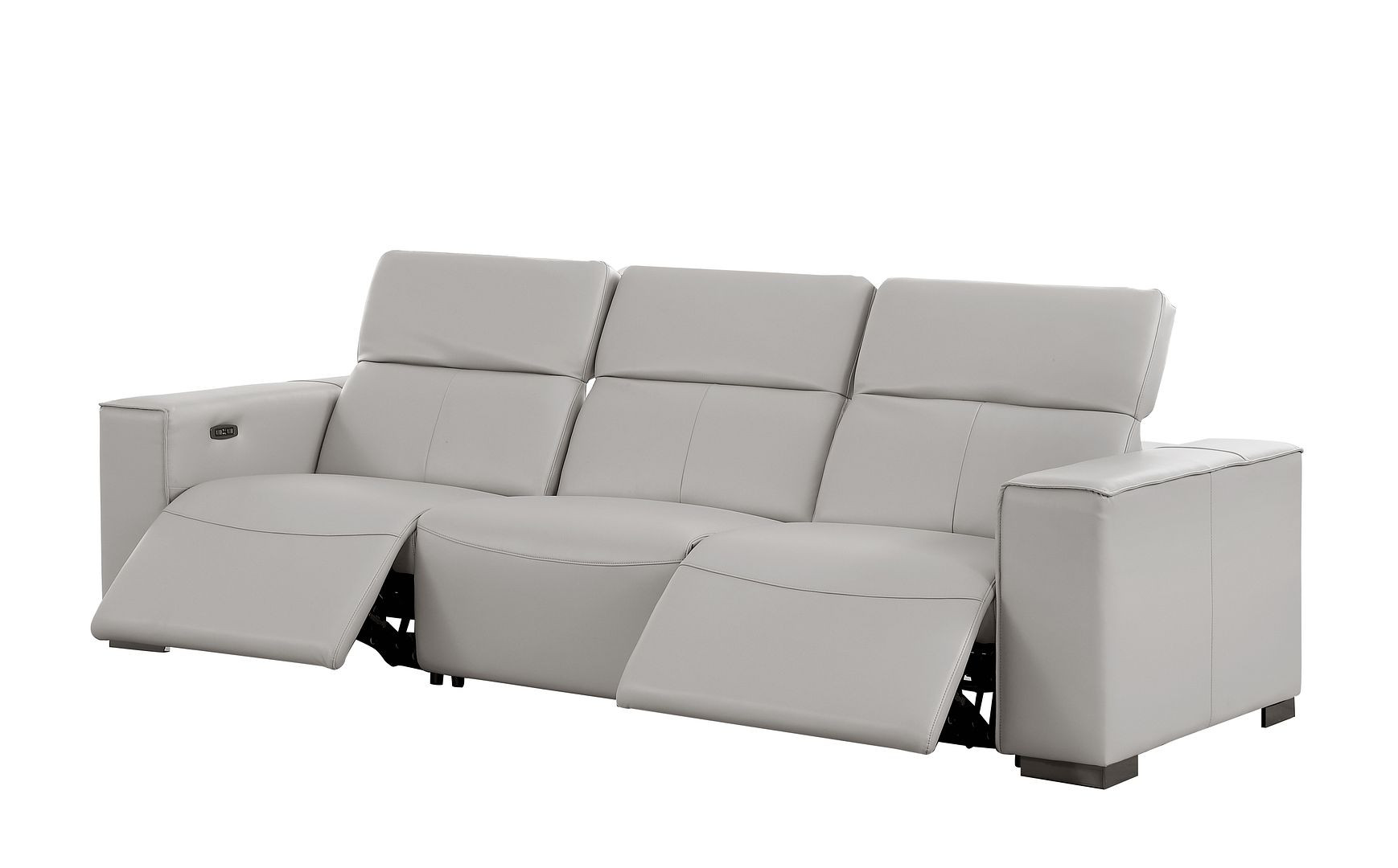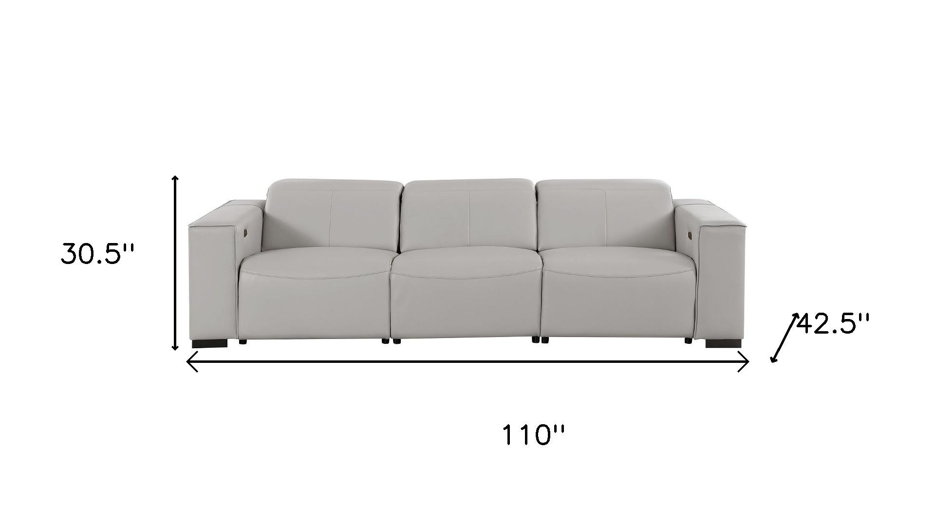 Superior construction from fabulously soft and high grade leather gives this 110-inch light gray top grain leather reclining metal usb sofa a leg up on the competition. The premium leather used makes your lounging luxuriously comfortable and adds an elegant appeal to your space. Solid colors give you lots of decorative options and are easy to work into your decor scheme. Pocket spring construction gives this piece strong support and makes it comfortable to sit even for long periods of time. Square arms offer a comfy place to rest. Brown stainless steel legs effortlessly elevate the room and add a touch of contemporary design. A great showpiece for your room, this sofa is a must have. 41.00-inch h x 110.00-inch w x 42.50-inch d.