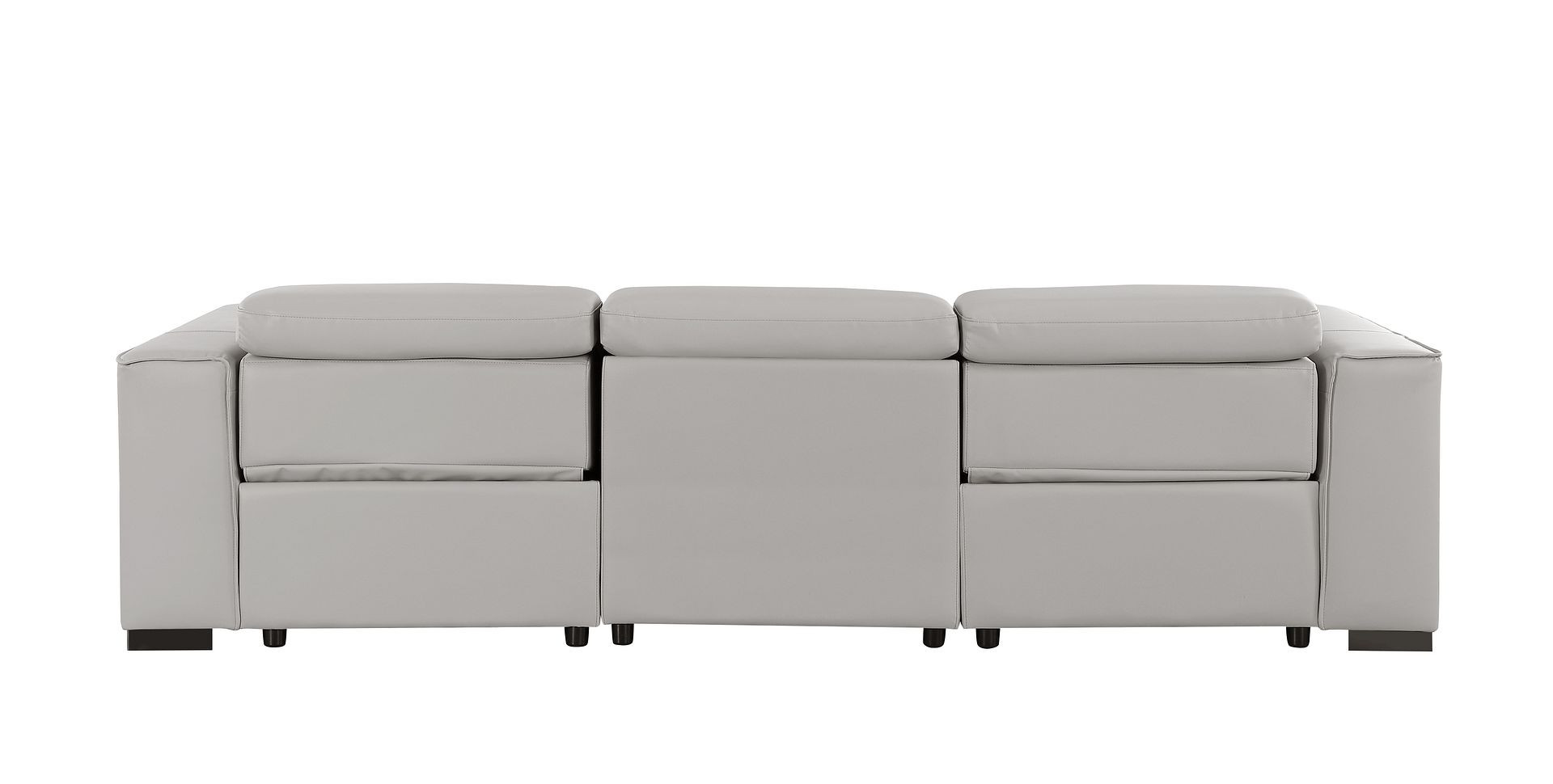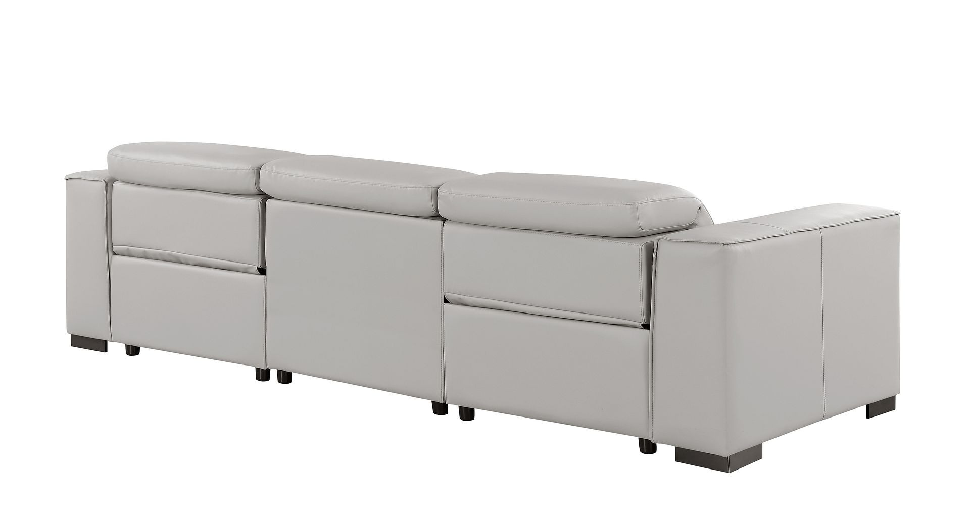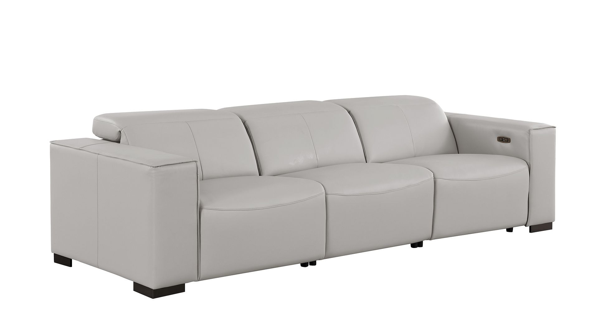 Superior construction from fabulously soft and high grade leather gives this 110-inch light gray top grain leather reclining metal usb sofa a leg up on the competition. The premium leather used makes your lounging luxuriously comfortable and adds an elegant appeal to your space. Solid colors give you lots of decorative options and are easy to work into your decor scheme. Pocket spring construction gives this piece strong support and makes it comfortable to sit even for long periods of time. Square arms offer a comfy place to rest. Brown stainless steel legs effortlessly elevate the room and add a touch of contemporary design. A great showpiece for your room, this sofa is a must have. 41.00-inch h x 110.00-inch w x 42.50-inch d.