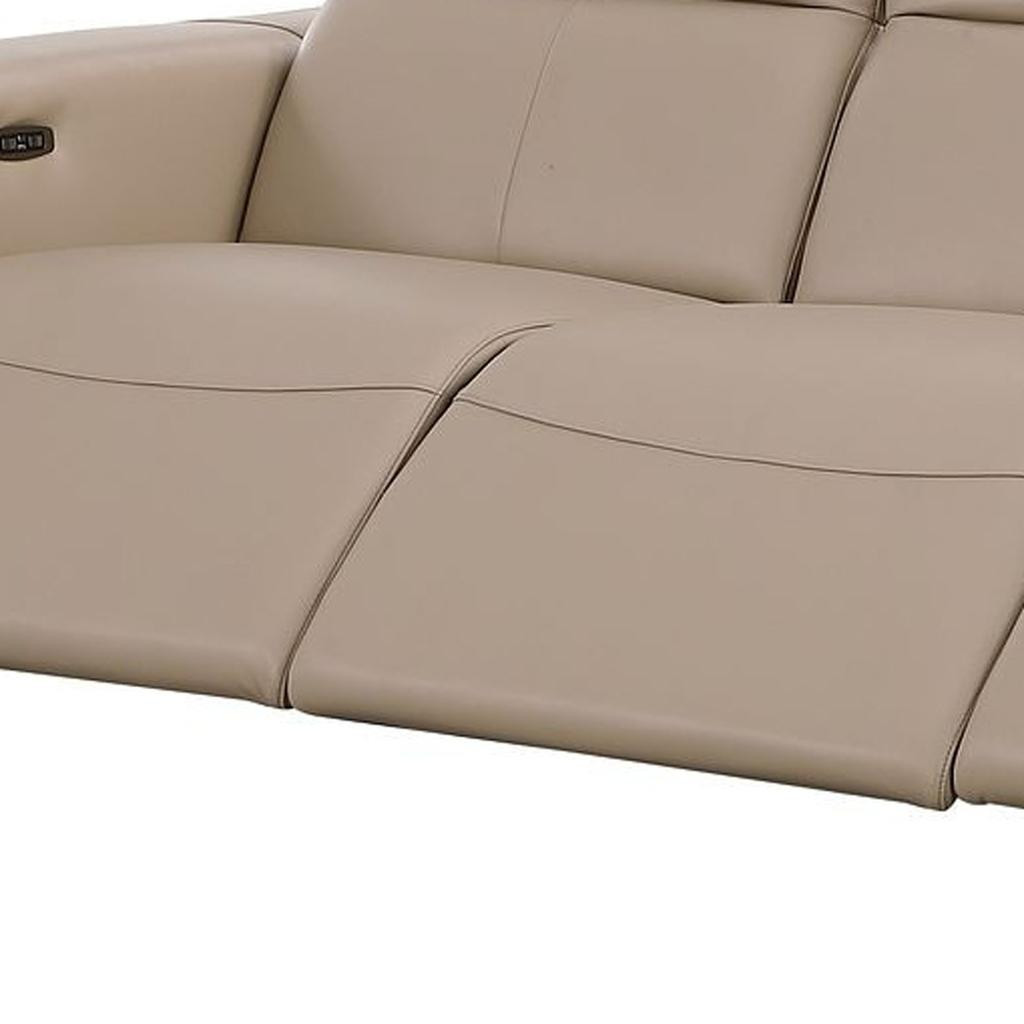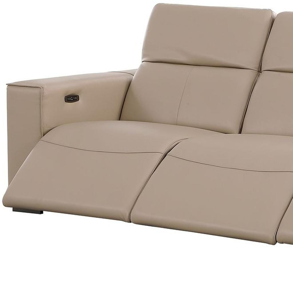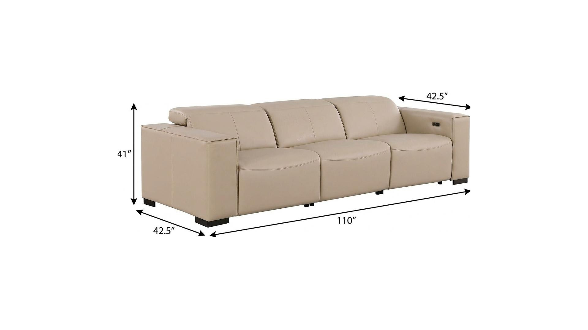 An interior designer's dream, this buttery soft high grade leather 110-inch beige top grain leather reclining metal usb sofa will bring just the right touch to your space. The premium leather used makes your lounging luxuriously comfortable and adds an elegant appeal to your space. Solid colors give you lots of decorative options and are easy to work into your decor scheme. Pocket spring construction gives this piece strong support and makes it comfortable to sit even for long periods of time. Square arms offer a comfy place to rest. Brown stainless steel legs effortlessly elevate the room and add a touch of contemporary design. Built to last, this sofa will be a great centerpiece for your room. 41.00-inch h x 110.00-inch w x 42.50-inch d.