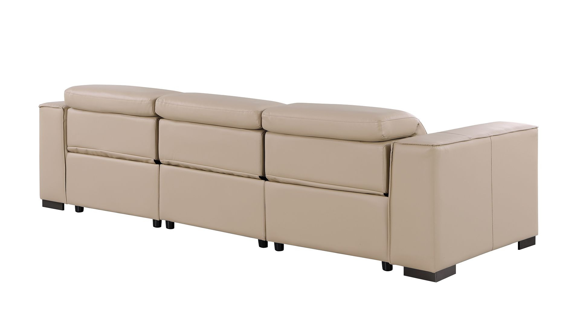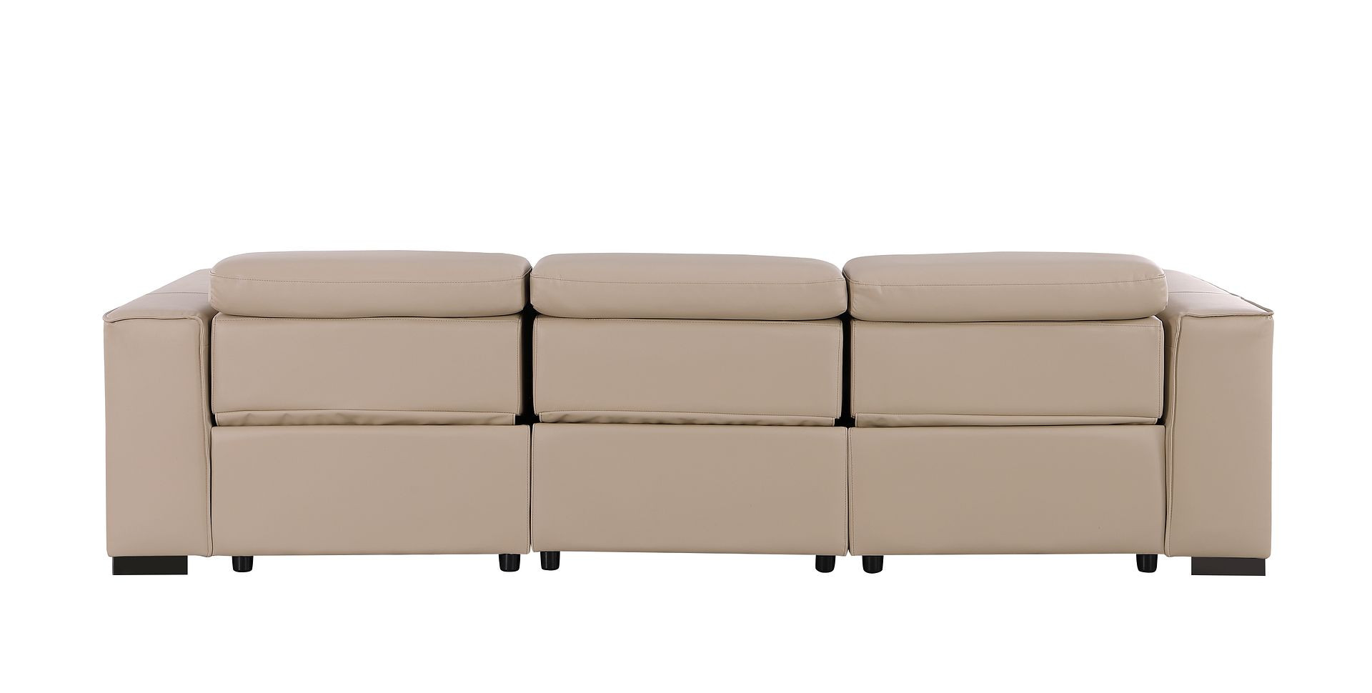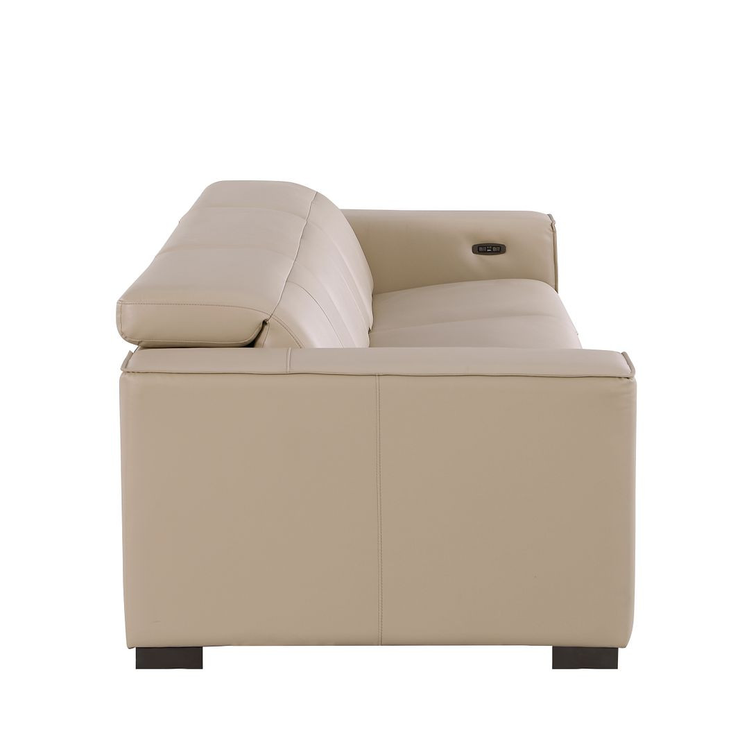 An interior designer's dream, this buttery soft high grade leather 110-inch beige top grain leather reclining metal usb sofa will bring just the right touch to your space. The premium leather used makes your lounging luxuriously comfortable and adds an elegant appeal to your space. Solid colors give you lots of decorative options and are easy to work into your decor scheme. Pocket spring construction gives this piece strong support and makes it comfortable to sit even for long periods of time. Square arms offer a comfy place to rest. Brown stainless steel legs effortlessly elevate the room and add a touch of contemporary design. Built to last, this sofa will be a great centerpiece for your room. 41.00-inch h x 110.00-inch w x 42.50-inch d.