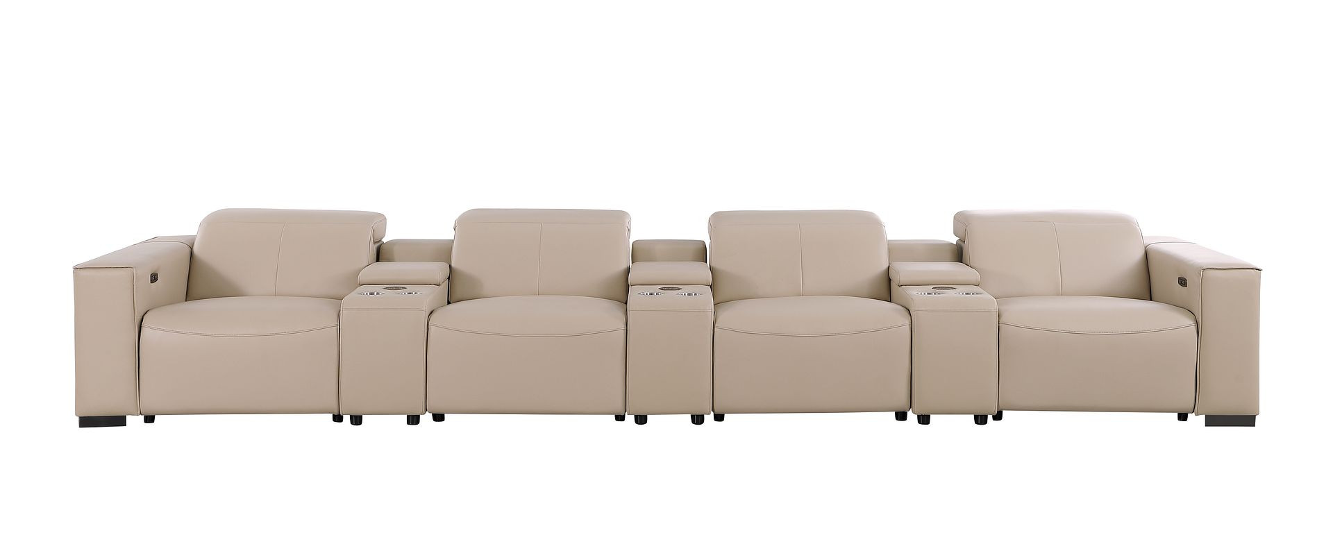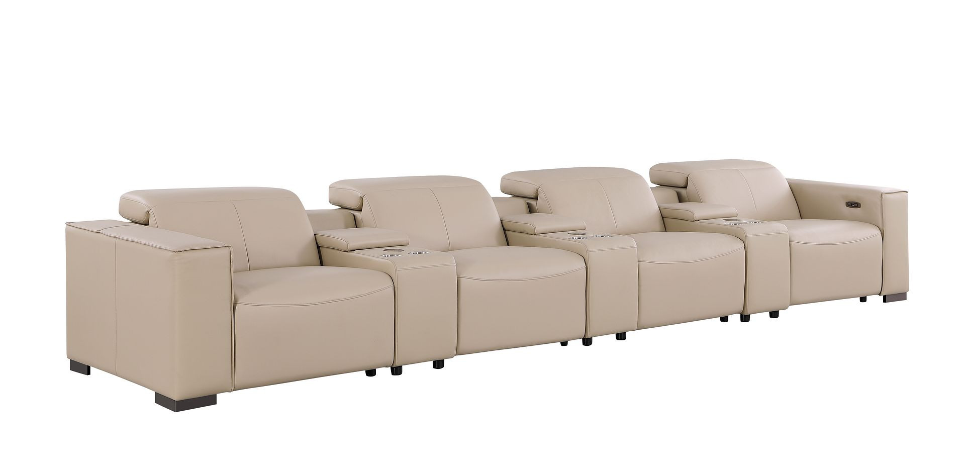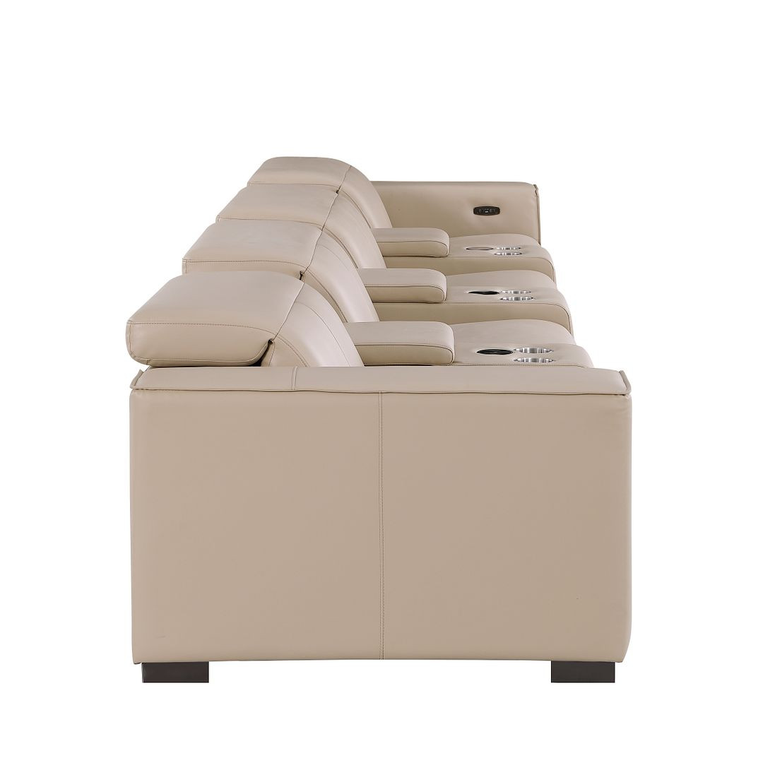 Genuine leather power reclining sofa; Luxury leather sofa with 4 recliners; Power reclining sofa with USB ports; Leather sofa with wireless phone chargers; Reclining sofa with lumbar support; Sofa with power headrests and storage consoles; Modern genuine leather home theater sofa; Brazilian wood frame leather sofa; Durable luxury reclining leather couch; Contemporary genuine leather sofa; Premium leather power recliner sofa; Comfortable leather sofa for living room |