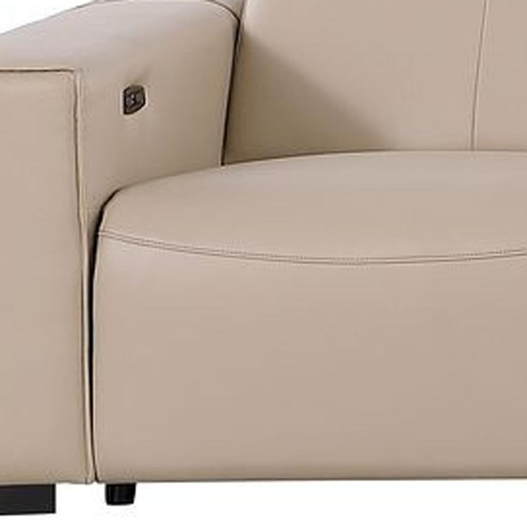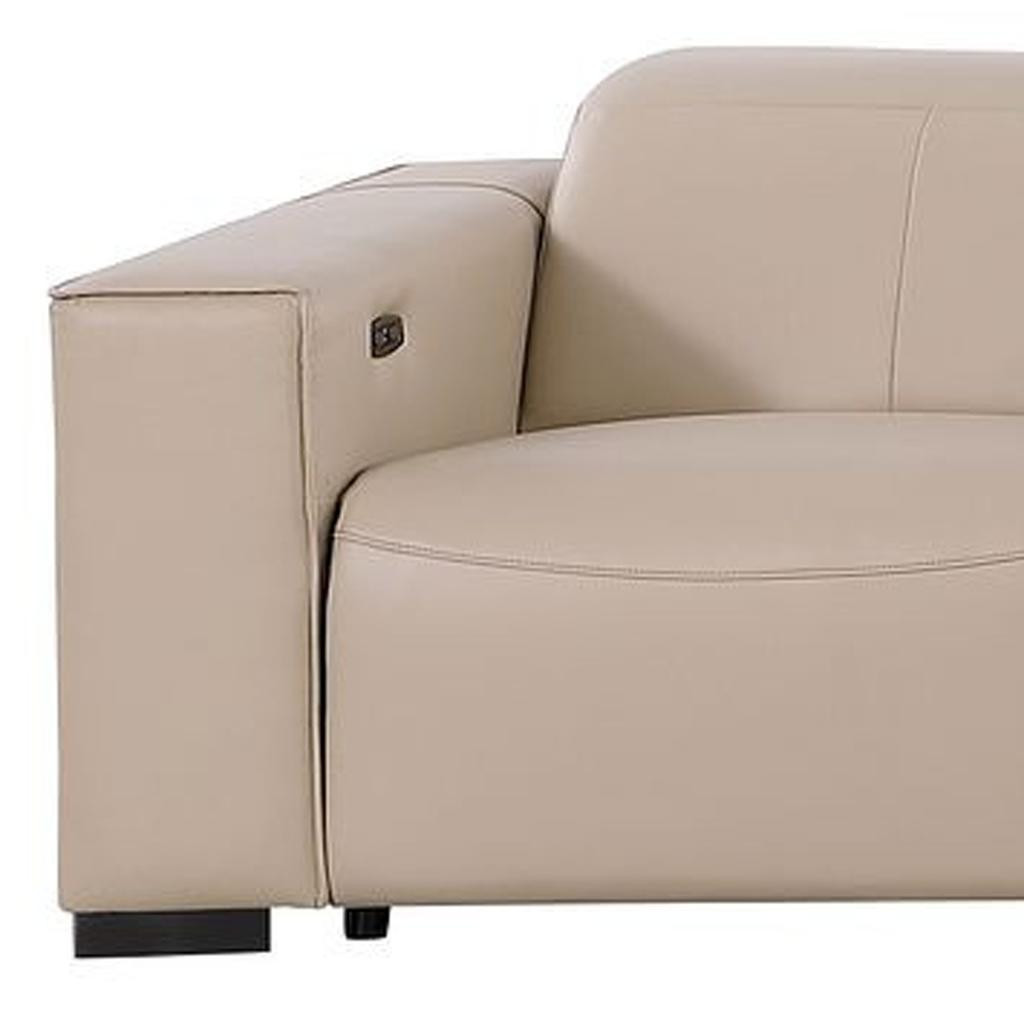 Superior construction from fabulously soft and high grade leather gives this 179-inch beige top grain leather reclining metal usb sofa a leg up on the competition. The premium leather used makes your lounging luxuriously comfortable and adds an elegant appeal to your space. Solid colors give you lots of decorative options and are easy to work into your decor scheme. Pocket spring construction gives this piece strong support and makes it comfortable to sit even for long periods of time. Square arms offer a comfy place to rest. Brown stainless steel legs effortlessly elevate the room and add a touch of contemporary design. A great showpiece for your room, this sofa is a must have. 41.00-inch h x 179.00-inch w x 42.50-inch d.