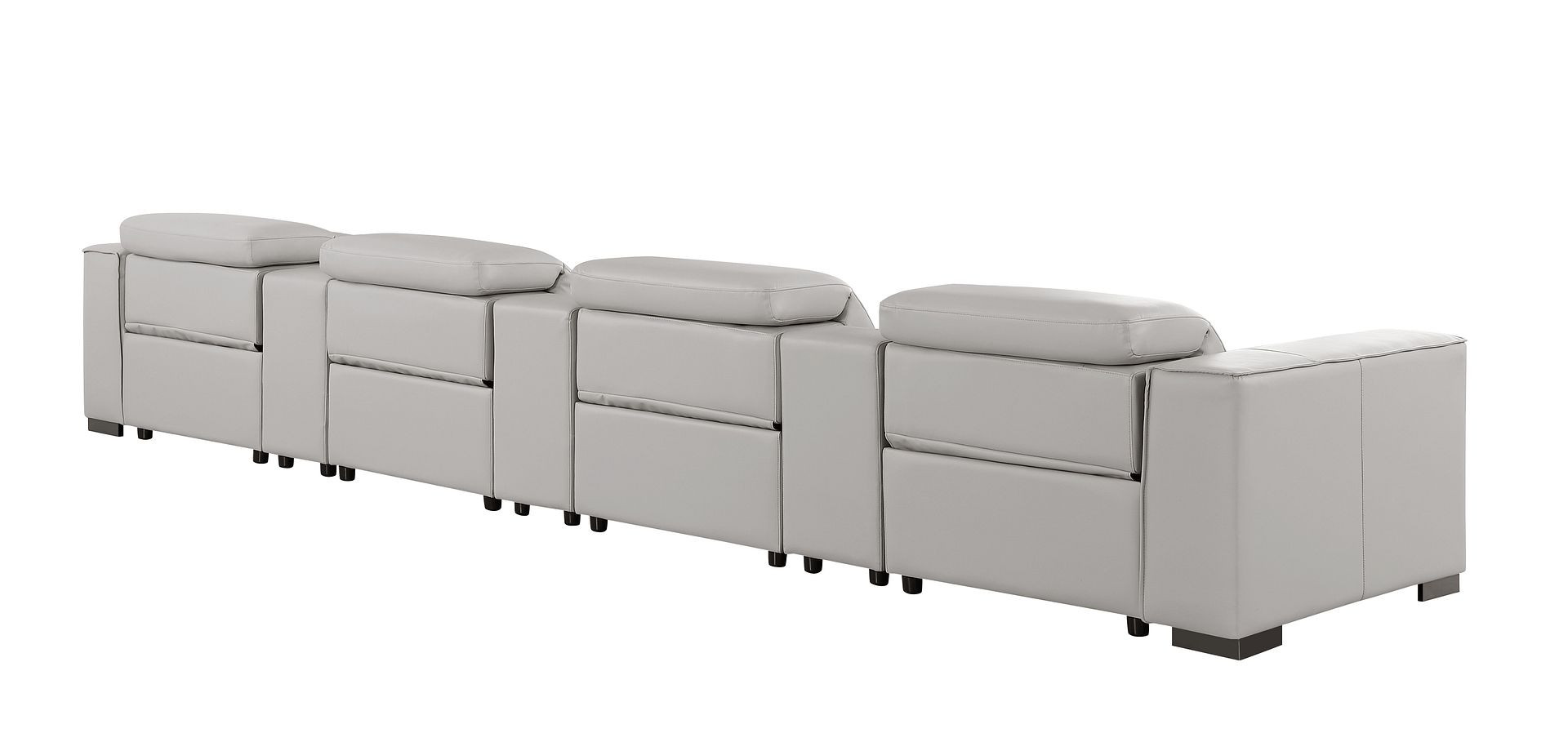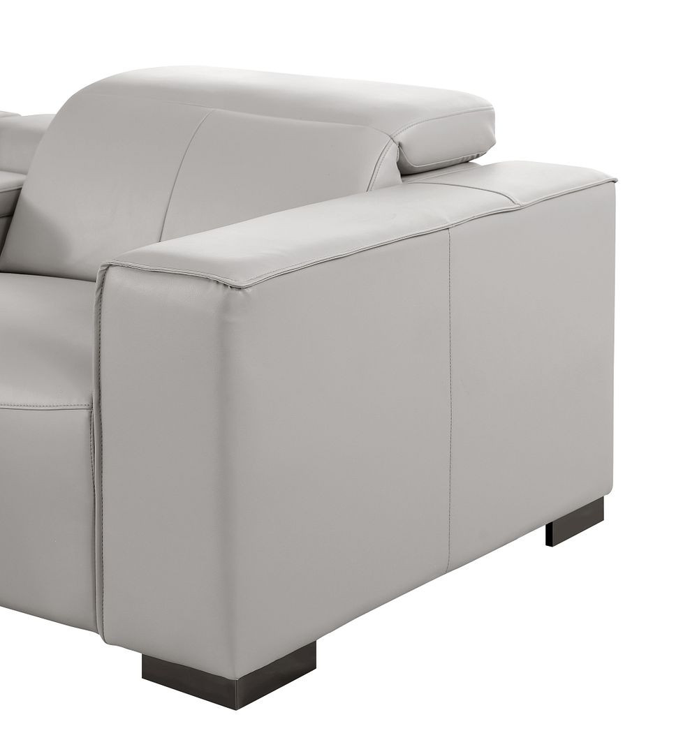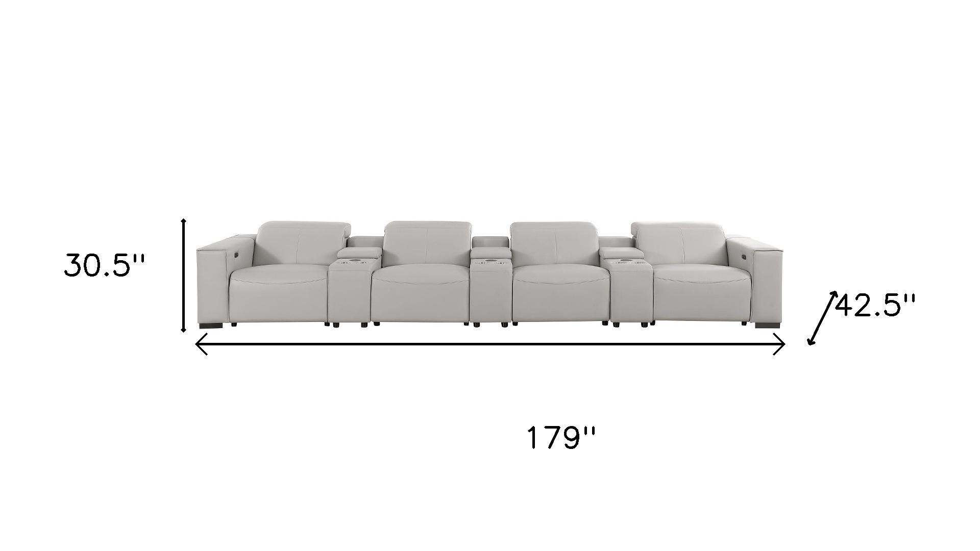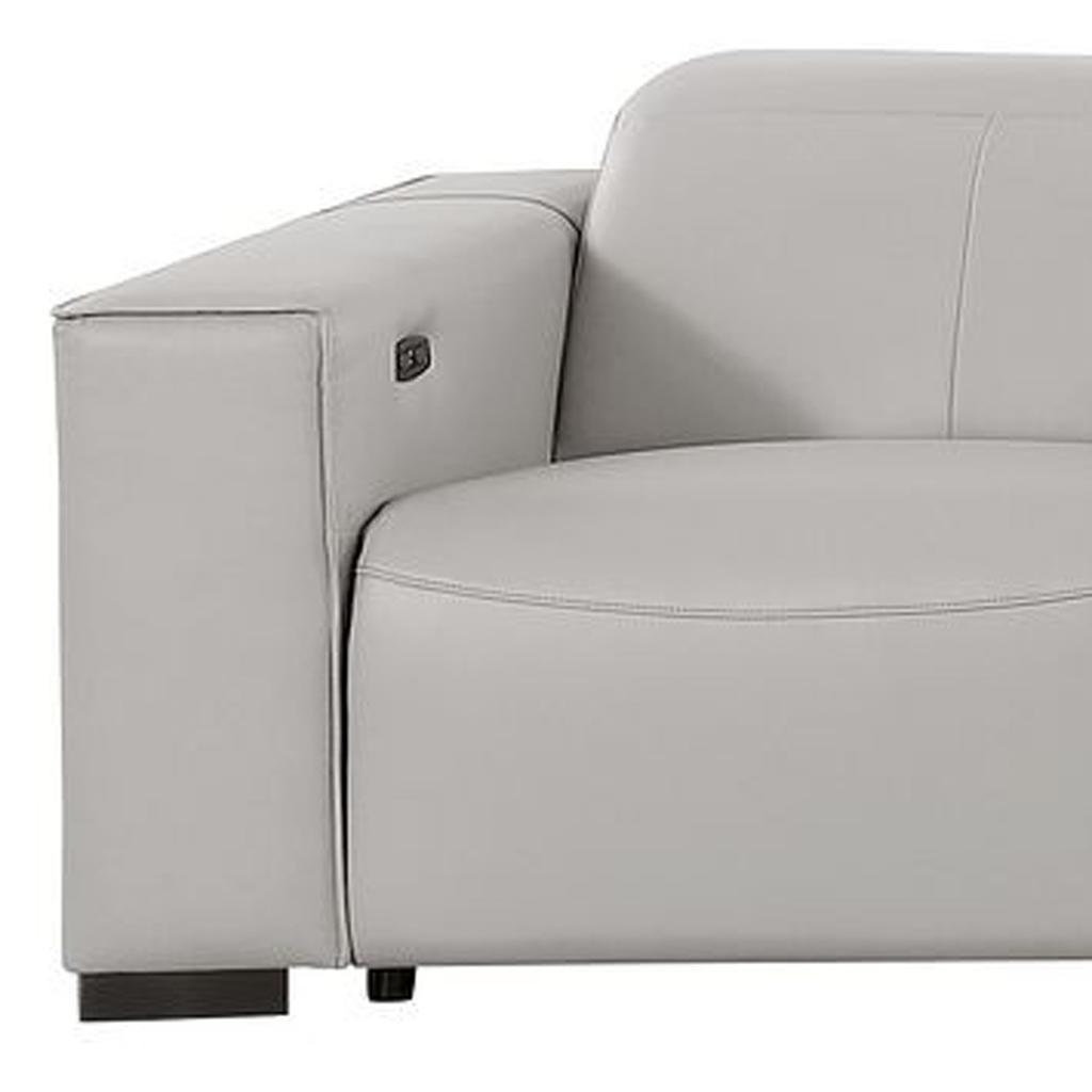 An interior designer's dream, this buttery soft high grade leather 179-inch light gray top grain leather reclining metal usb sofa will bring just the right touch to your space. The premium leather used makes your lounging luxuriously comfortable and adds an elegant appeal to your space. Solid colors give you lots of decorative options and are easy to work into your decor scheme. Pocket spring construction gives this piece strong support and makes it comfortable to sit even for long periods of time. Square arms offer a comfy place to rest. Brown stainless steel legs effortlessly elevate the room and add a touch of contemporary design. A great showpiece for your room, this sofa is a must have. 41.00-inch h x 179.00-inch w x 42.50-inch d.