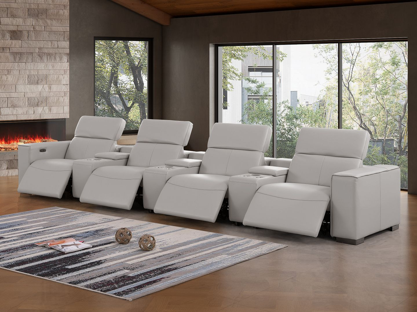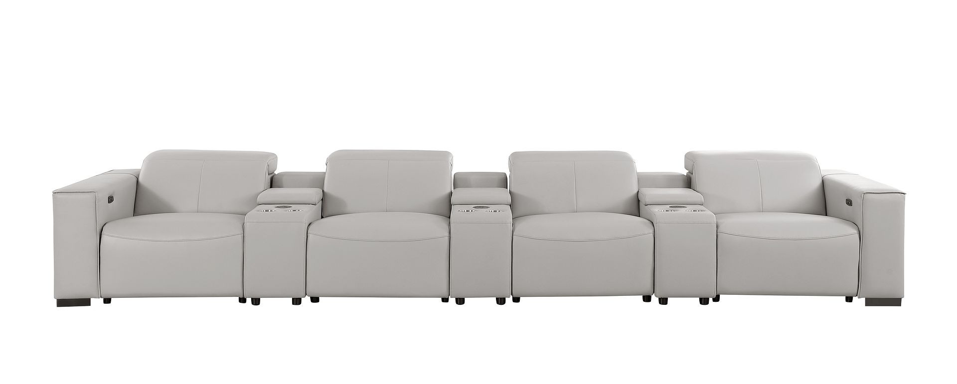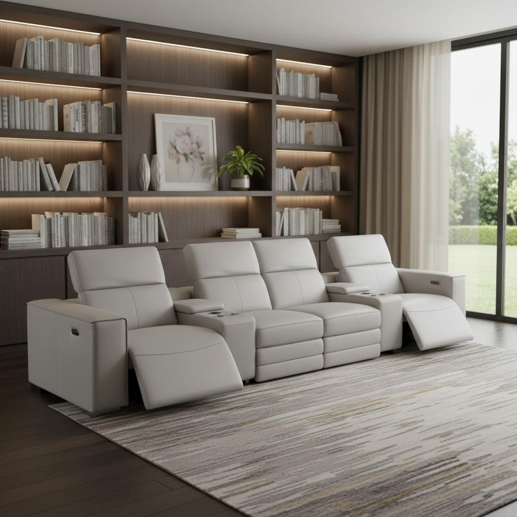 Genuine leather power reclining sofa; Luxury leather sofa with 4 recliners; Power reclining sofa with USB ports; Leather sofa with wireless phone chargers; Reclining sofa with lumbar support; Sofa with power headrests and storage consoles; Modern genuine leather home theater sofa; Brazilian wood frame leather sofa; Durable luxury reclining leather couch; Contemporary genuine leather sofa; Premium leather power recliner sofa; Comfortable leather sofa for living room |