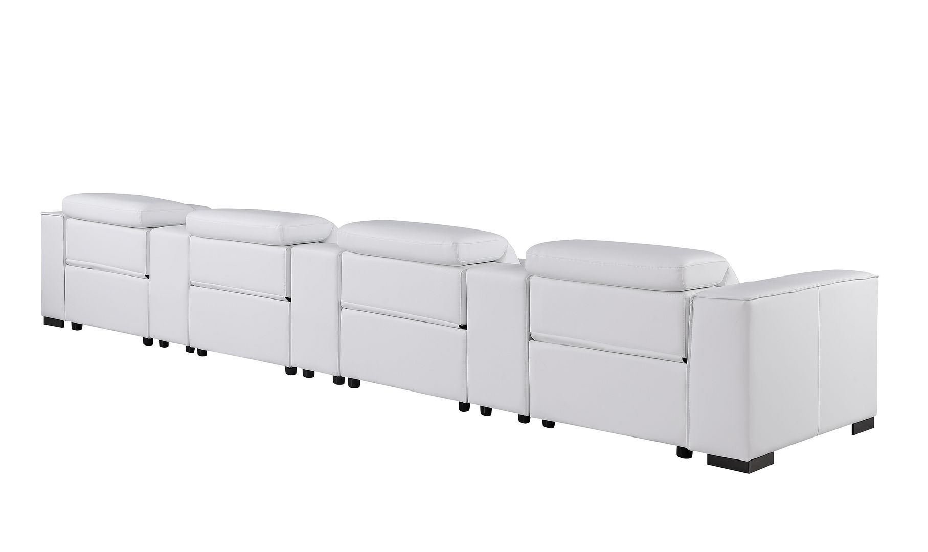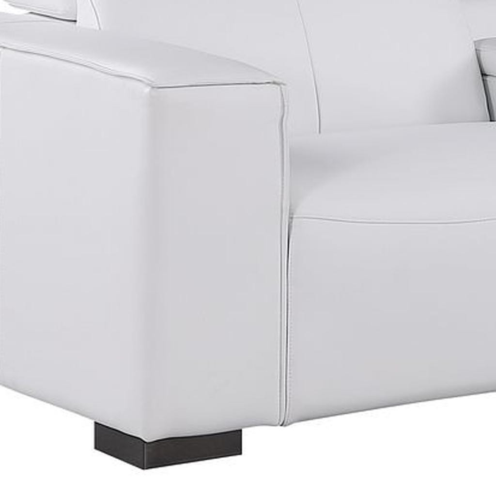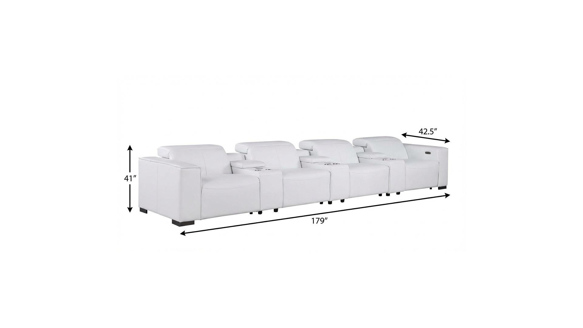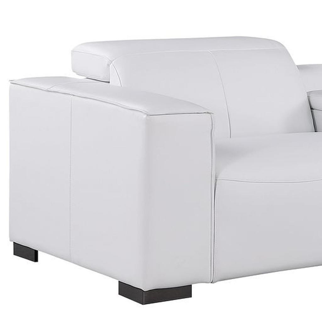 Superior construction from fabulously soft and high grade leather gives this 179-inch white top grain leather reclining metal usb sofa a leg up on the competition. The premium leather used makes your lounging luxuriously comfortable and adds an elegant appeal to your space. Solid colors give you lots of decorative options and are easy to work into your decor scheme. Pocket spring construction gives this piece strong support and makes it comfortable to sit even for long periods of time. Square arms offer a comfy place to rest. Brown stainless steel legs effortlessly elevate the room and add a touch of contemporary design. A great showpiece for your room, this sofa is a must have. 41.00-inch h x 179.00-inch w x 42.50-inch d.