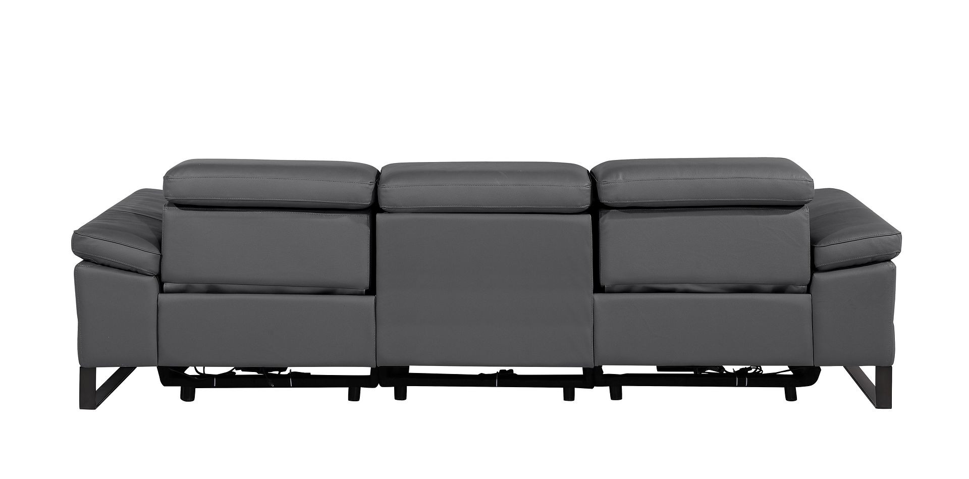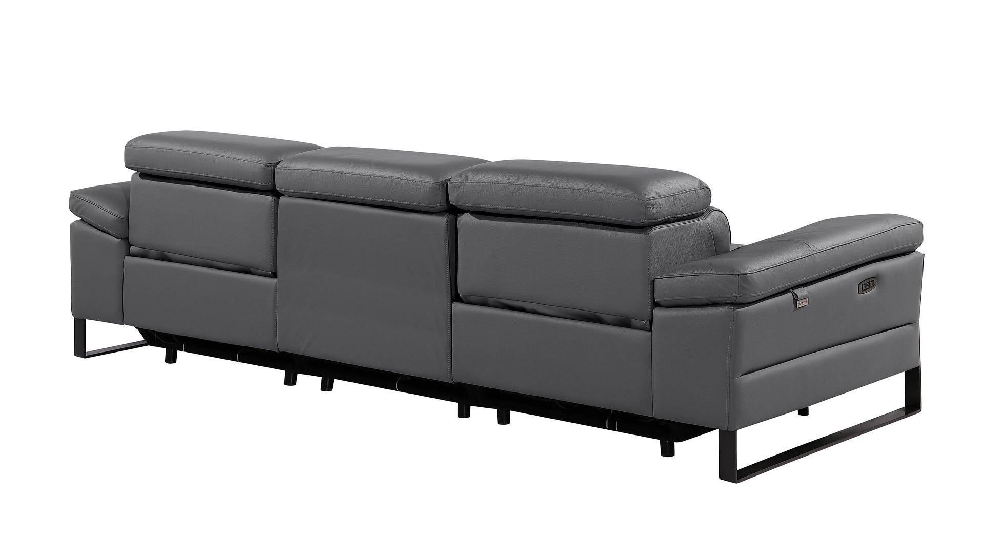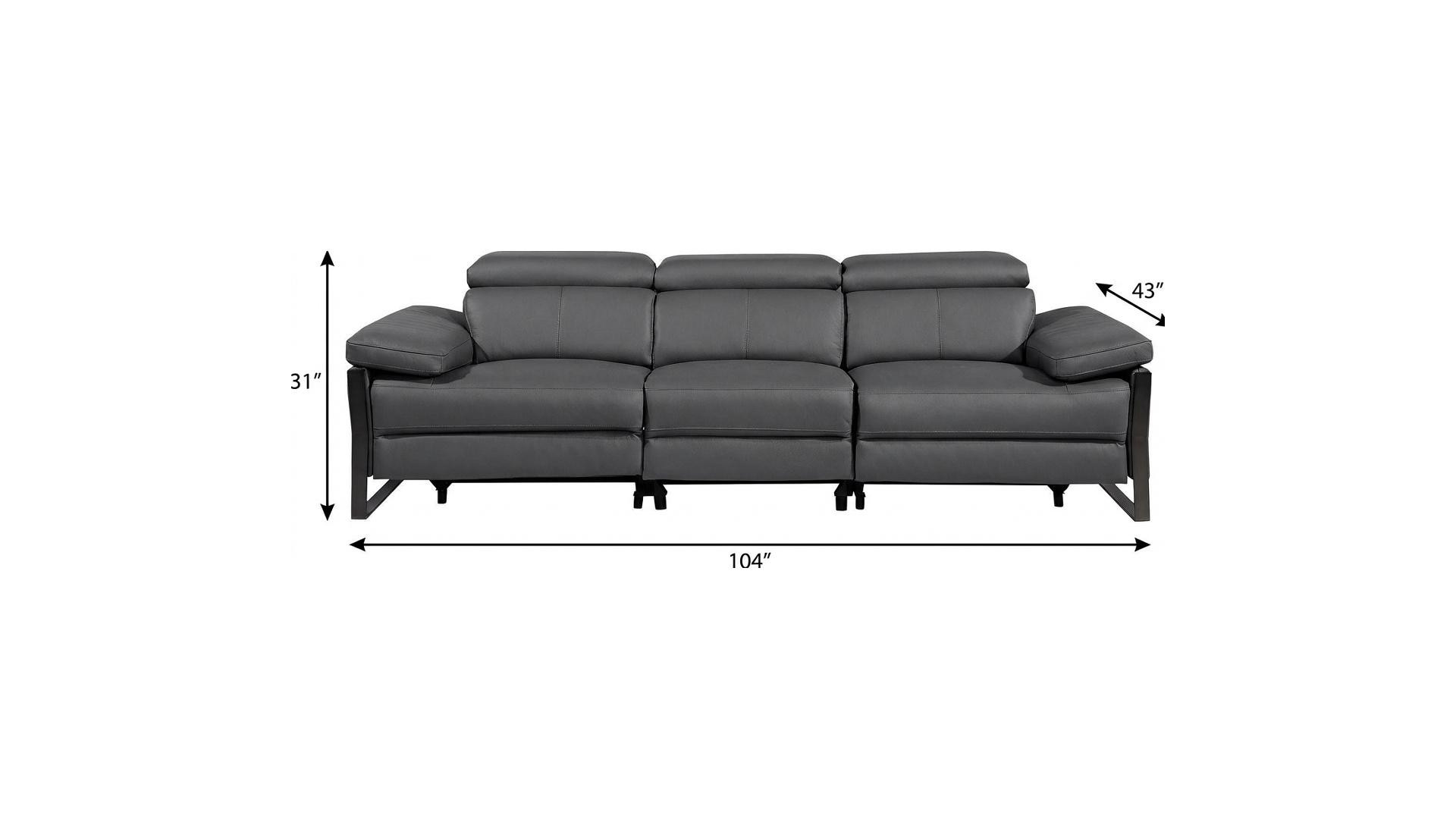 Superior construction from fabulously soft and high grade leather gives this 103-inch dark gray top grain leather reclining metal usb sofa a leg up on the competition. The premium leather used makes your lounging luxuriously comfortable and adds an elegant appeal to your space. Solid colors give you lots of decorative options and are easy to work into your decor scheme. Pocket spring construction gives this piece strong support and makes it comfortable to sit even for long periods of time. Rolled arms offer a comfy place to rest. Black stainless steel legs effortlessly elevate the room and add a touch of contemporary design. Built to last, this sofa will be a great centerpiece for your room. 31.00-inch h x 104.00-inch w x 43.00-inch d.