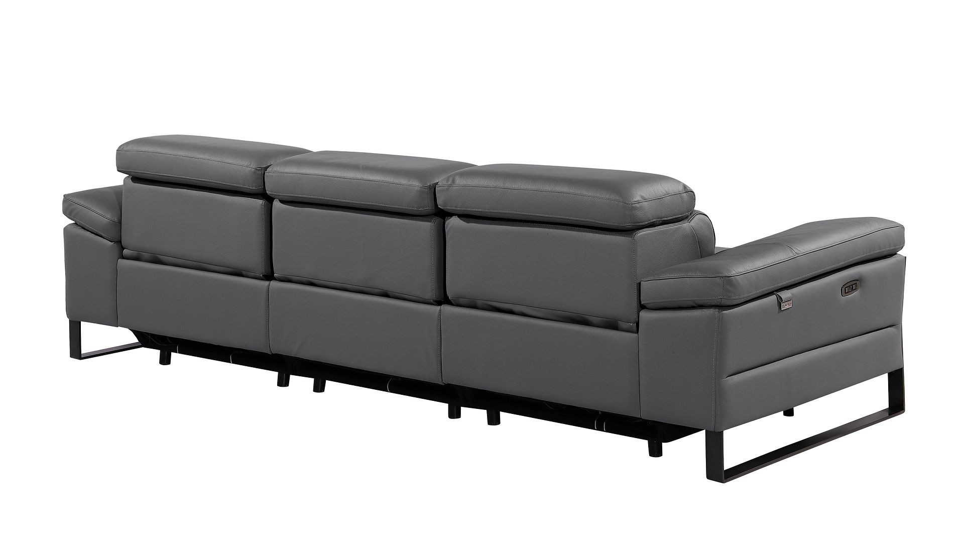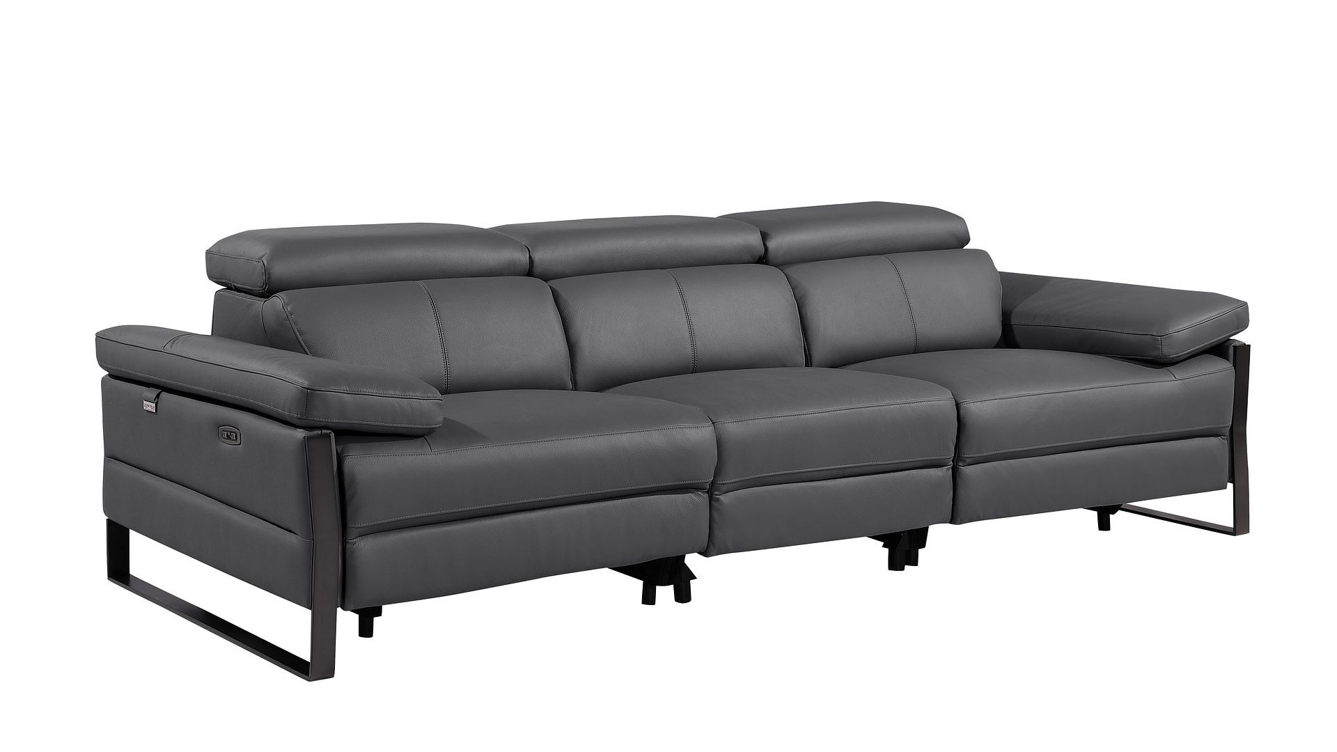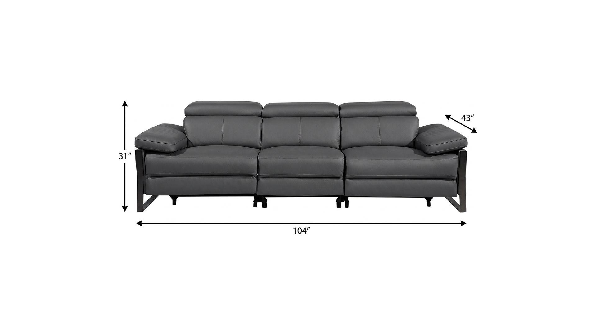 Superior construction from fabulously soft and high grade leather gives this 103-inch dark gray top grain leather reclining metal usb sofa a leg up on the competition. The premium leather used makes your lounging luxuriously comfortable and adds an elegant appeal to your space. Solid colors give you lots of decorative options and are easy to work into your decor scheme. Pocket spring construction gives this piece strong support and makes it comfortable to sit even for long periods of time. Rolled arms offer a comfy place to rest. Black stainless steel legs effortlessly elevate the room and add a touch of contemporary design. A great showpiece for your room, this sofa is a must have. 31.00-inch h x 104.00-inch w x 43.00-inch d.